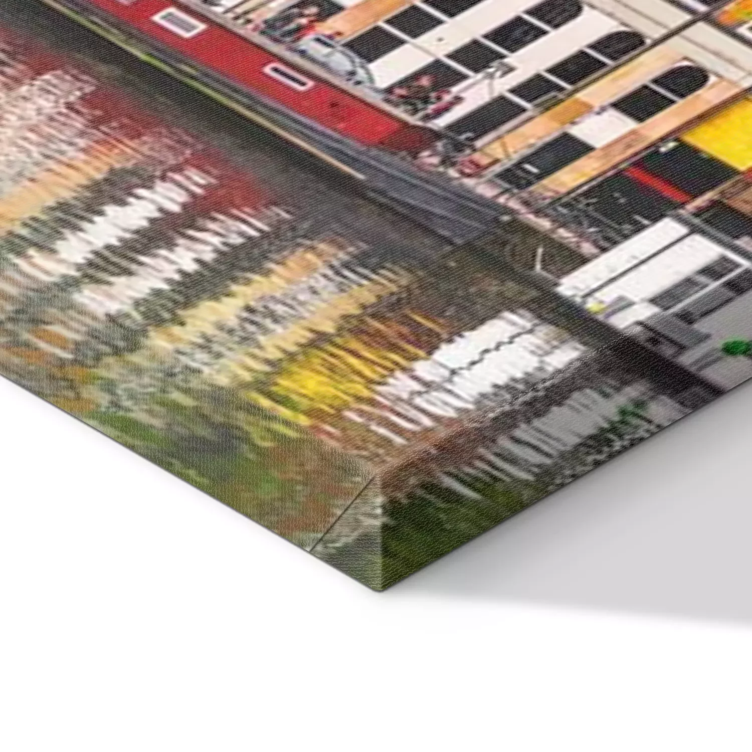 De print wordt aangebracht op hoogwaardig canvas dat op een schildersweefgetouw (spieraam) wordt gespannen. Omdat de print de zijranden bedekt, hoeft het ontwerp niet met een extra kader te worden omlijst. Wij raden ook composities aan die uit meerdere foto's bestaan en zo een coherente compositie vormen.