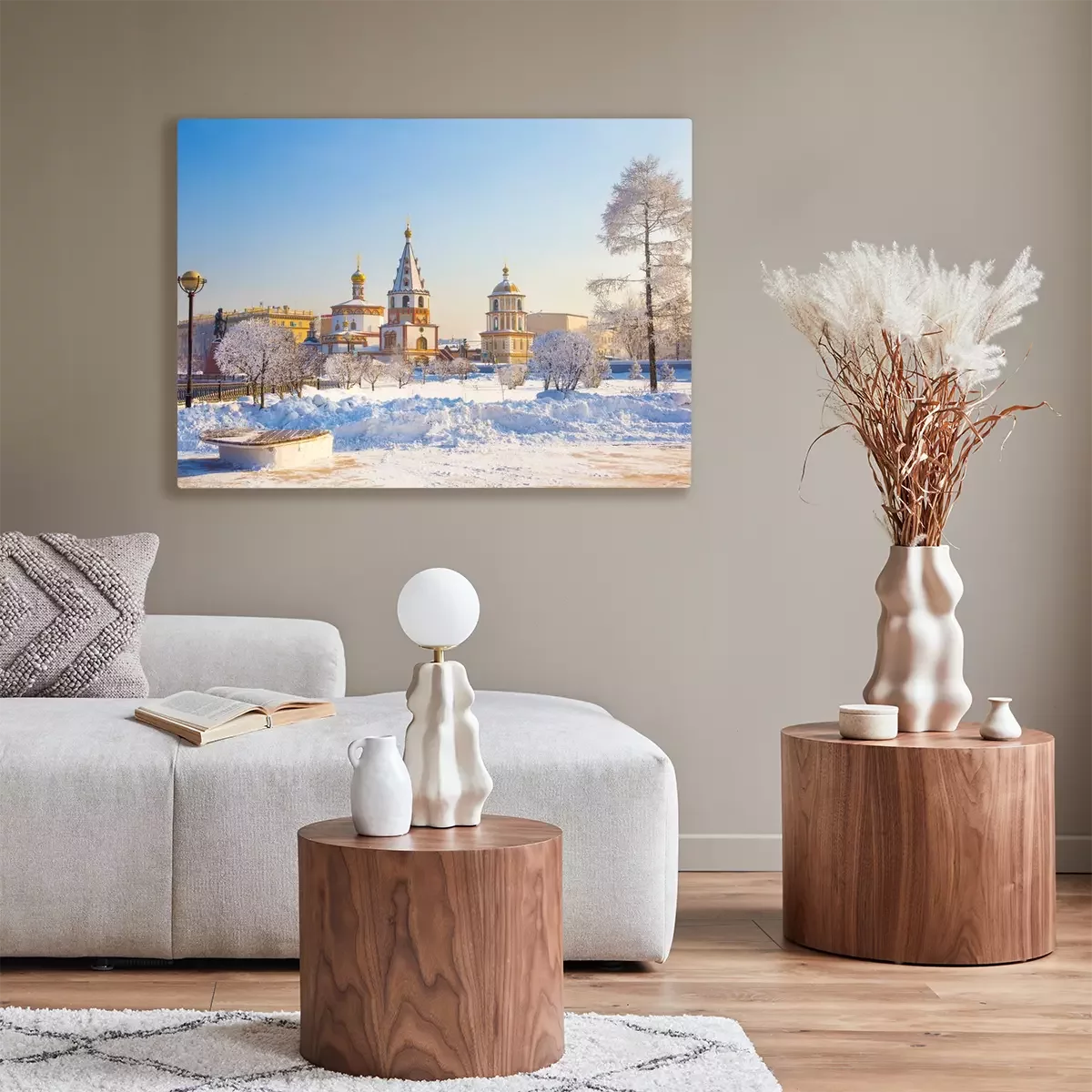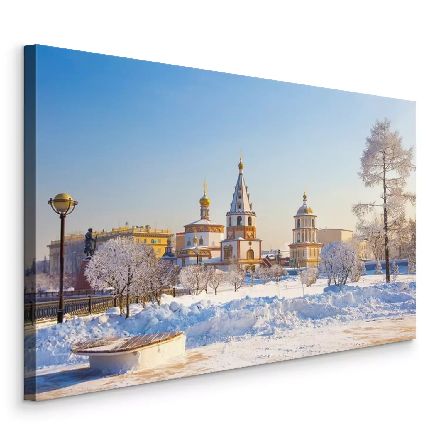 Canvas: andscape of Irkutsk city of Russia during winter season,church and tree are cover by snow.It is very beautiful scene shot for photographer to take picture.Winter is high season to travelling Russia.