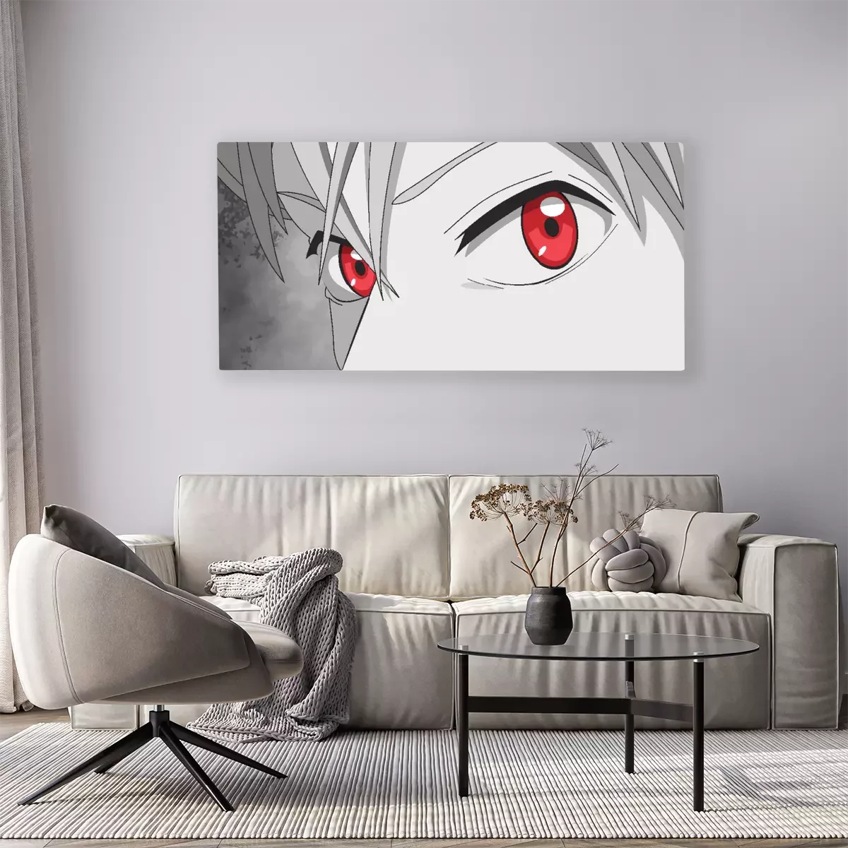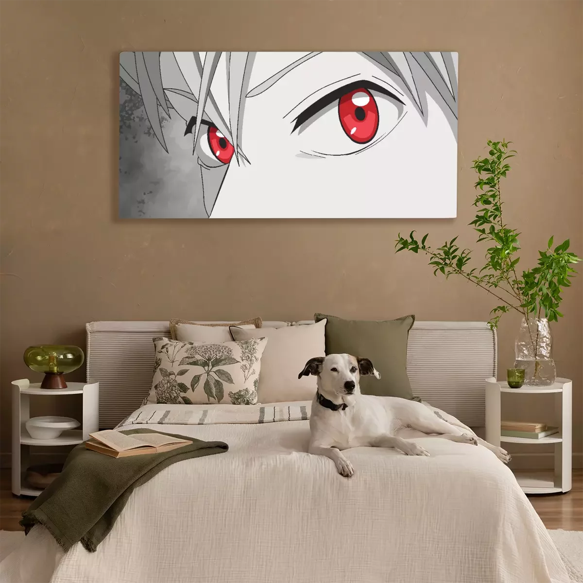 Web banner for anime, manga. Anime face with red eyes from cartoon. Vector illustration