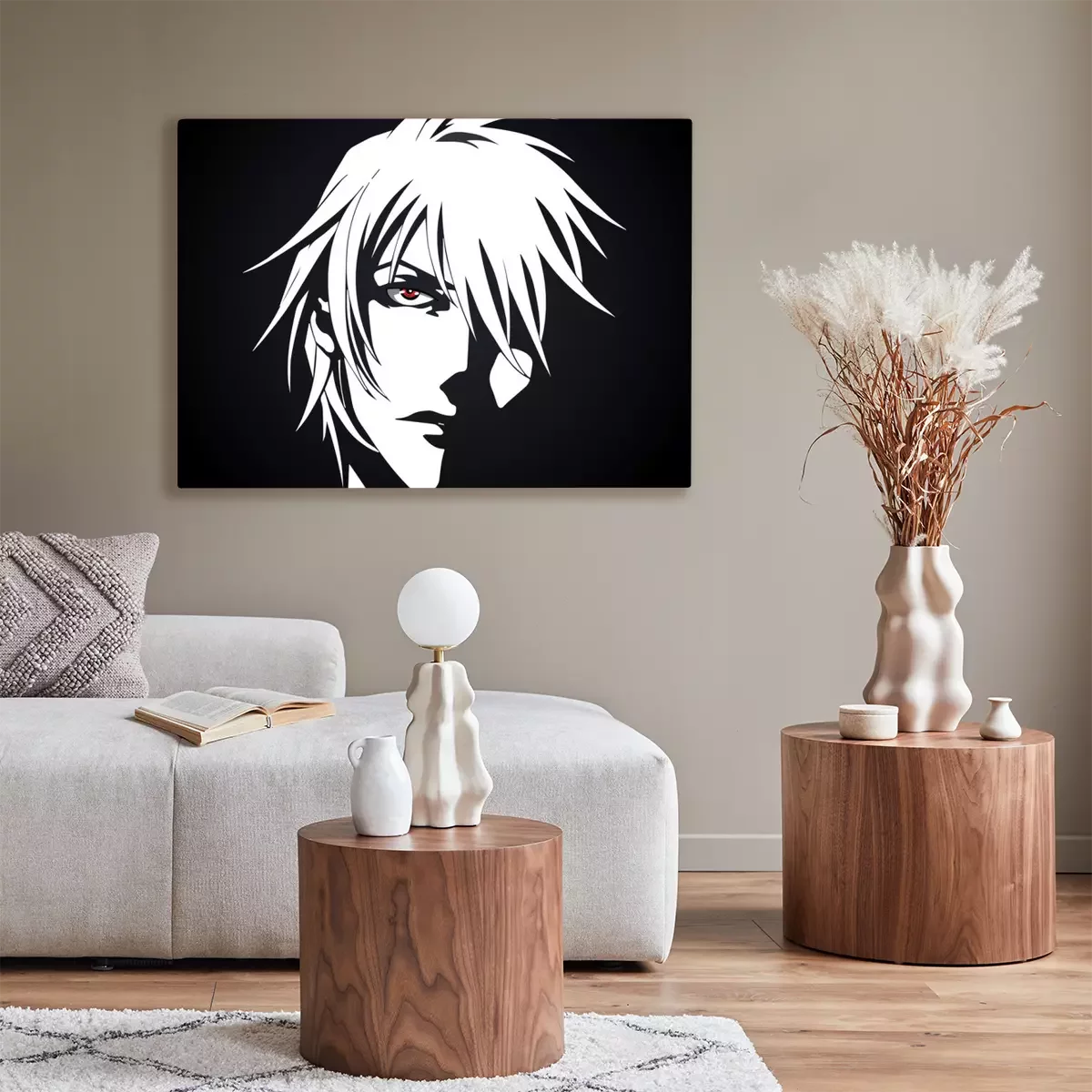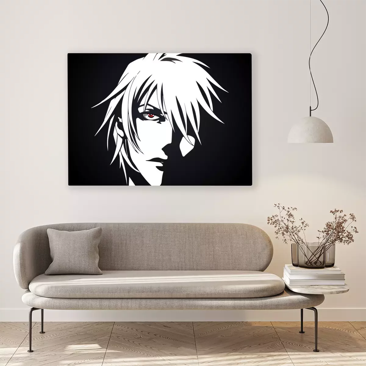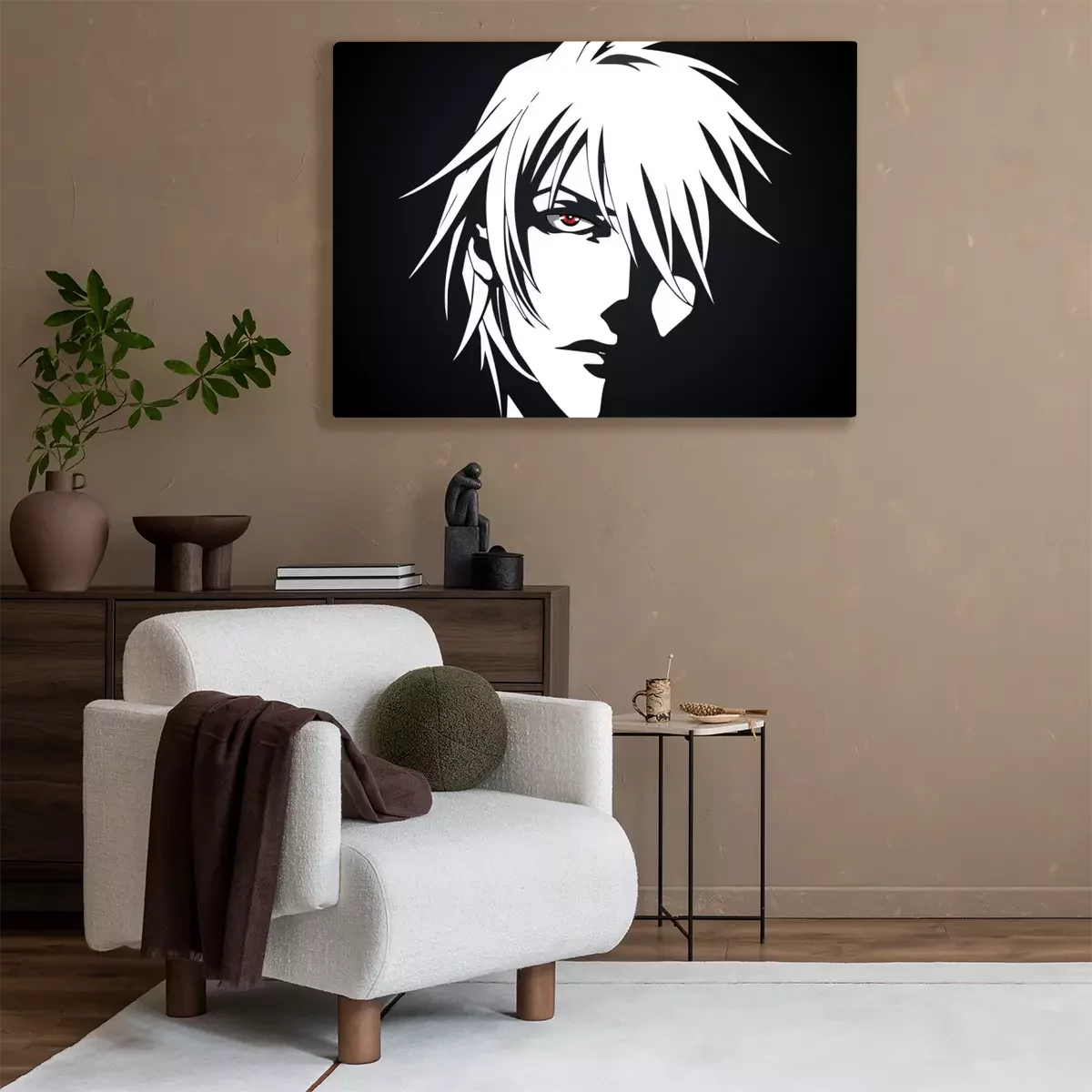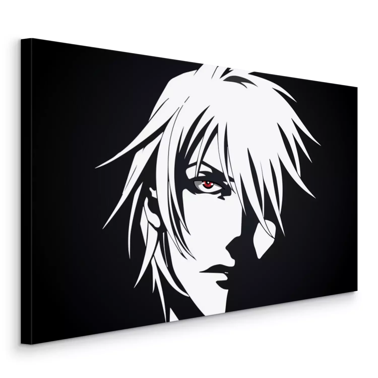 Canvas: Anime-gezicht van beeldverhaal met anime rode ogen op zwart-witte achtergrond. Vector illustratie