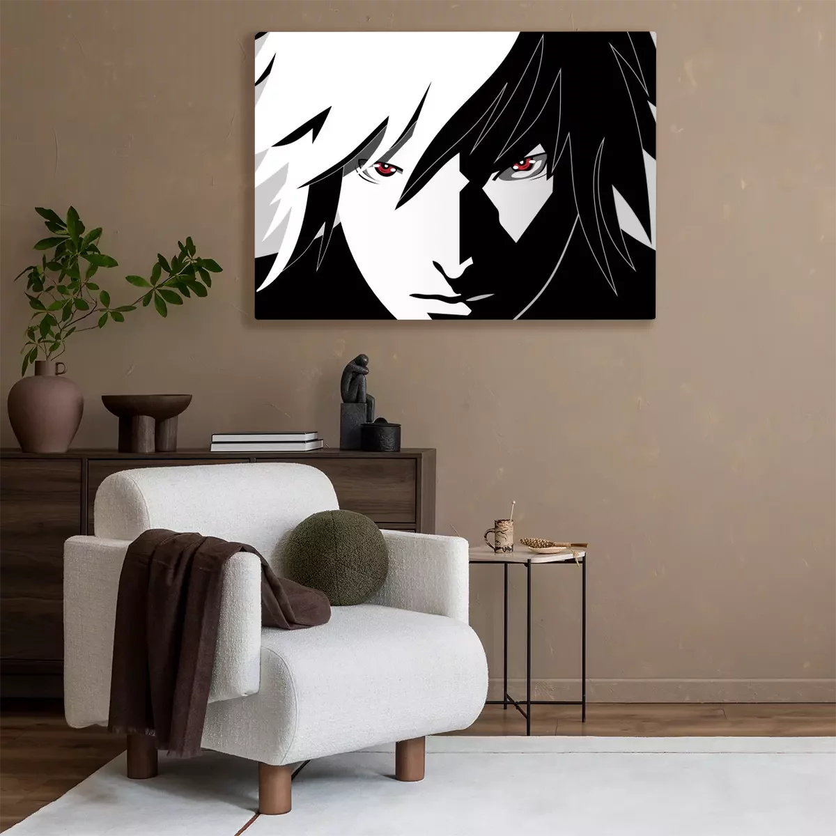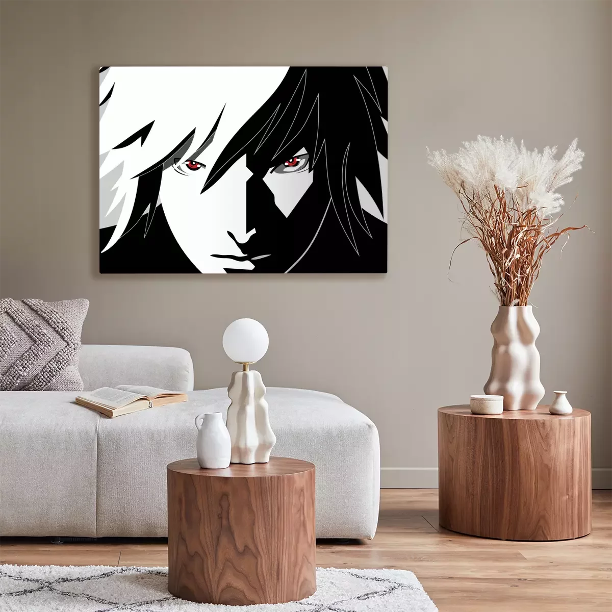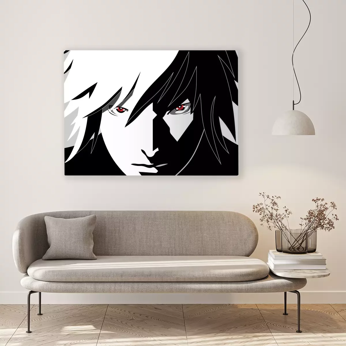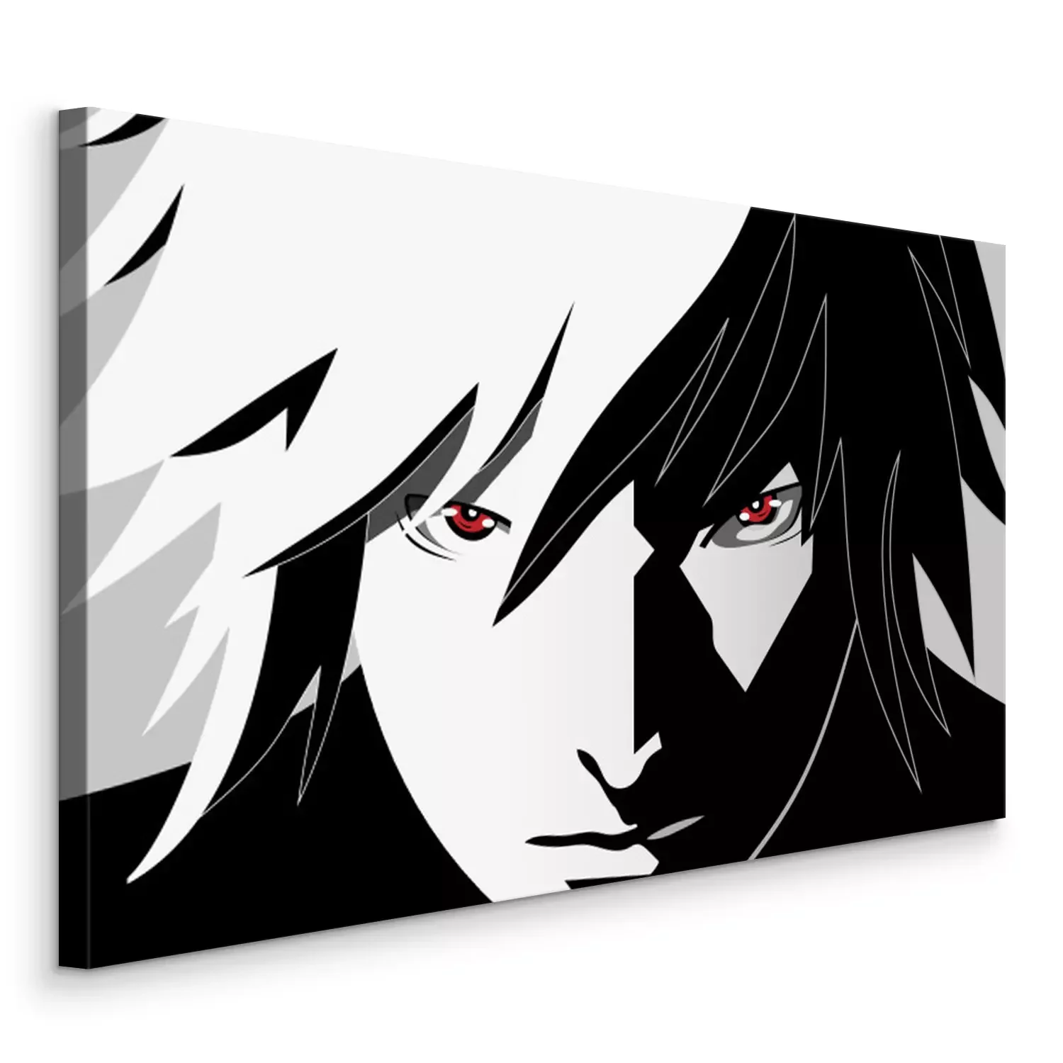 Canvas: Anime ogen. Rode ogen op zwarte en witte achtergrond. Anime gezicht van cartoon. Vector illustratie