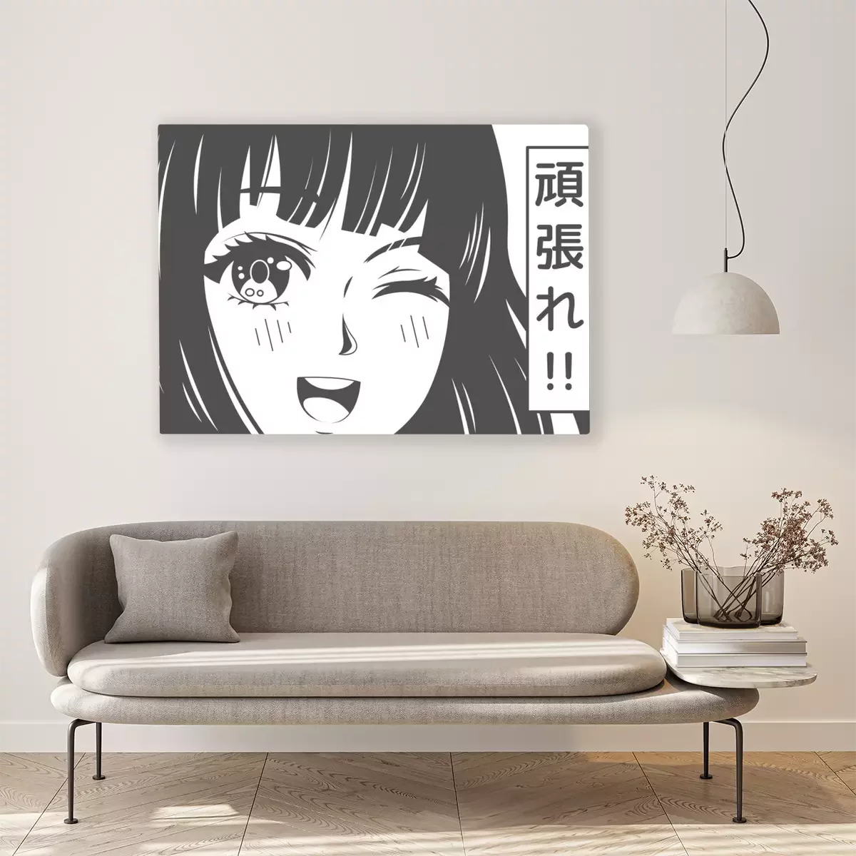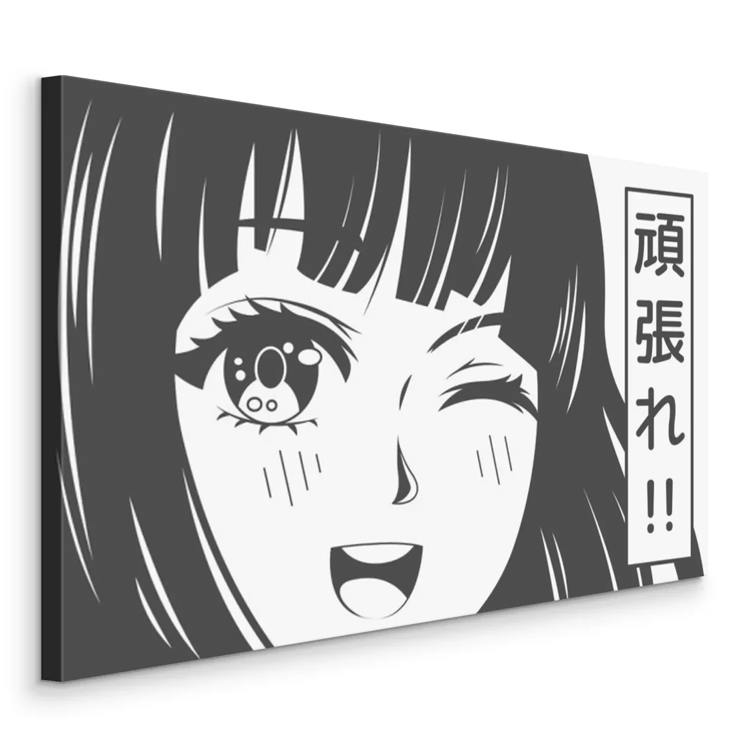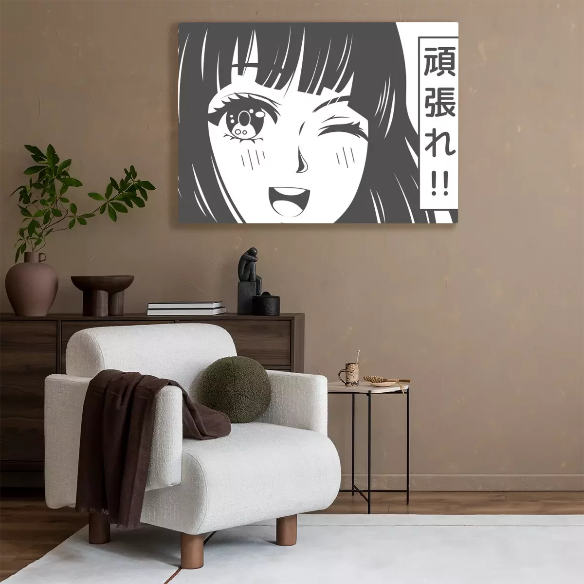 Canvas Anime poster. Kawaii winking school girl face with big eyes in manga style and japanese symbols mean Go for it. T-shirt japan vector print