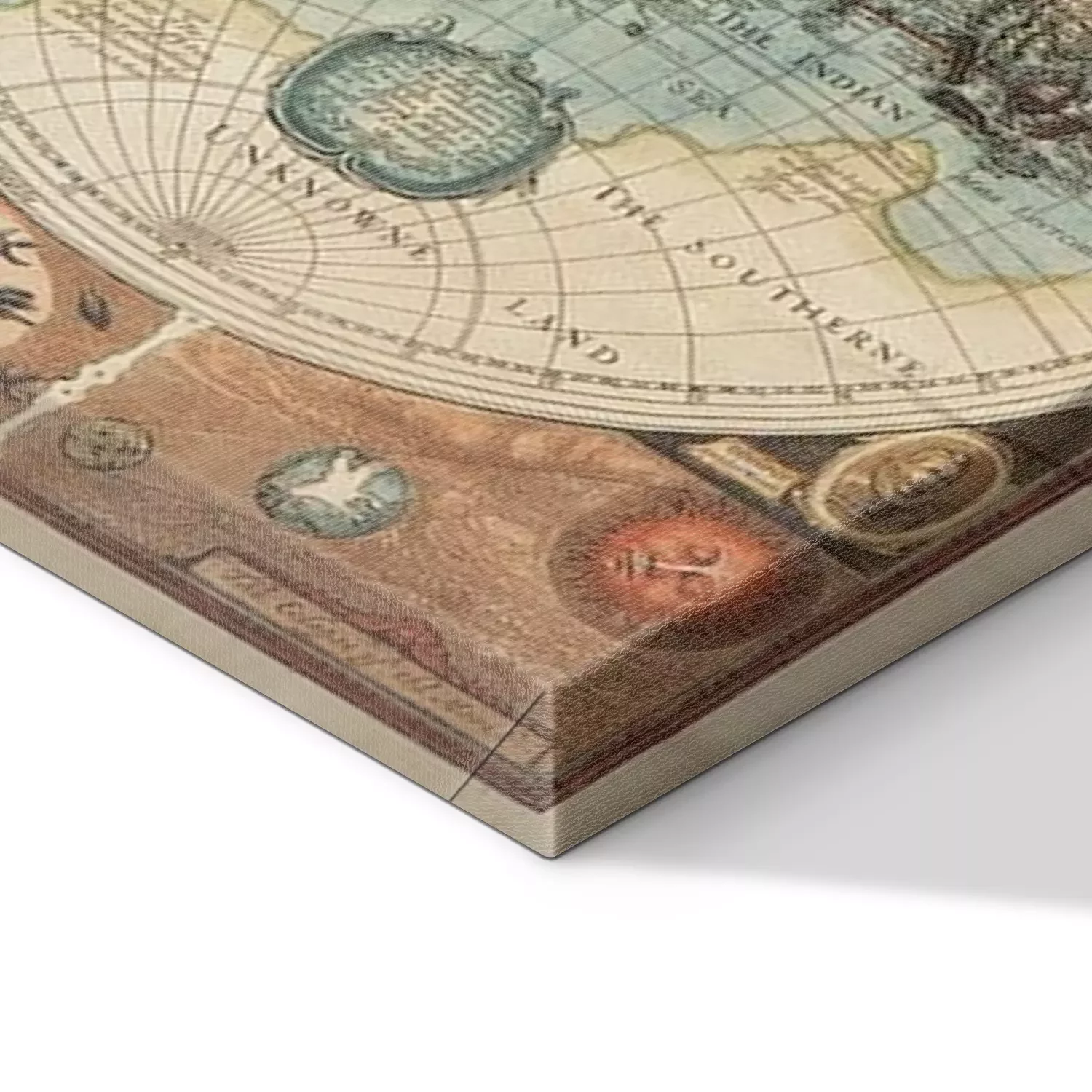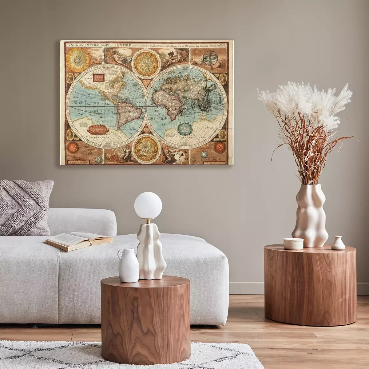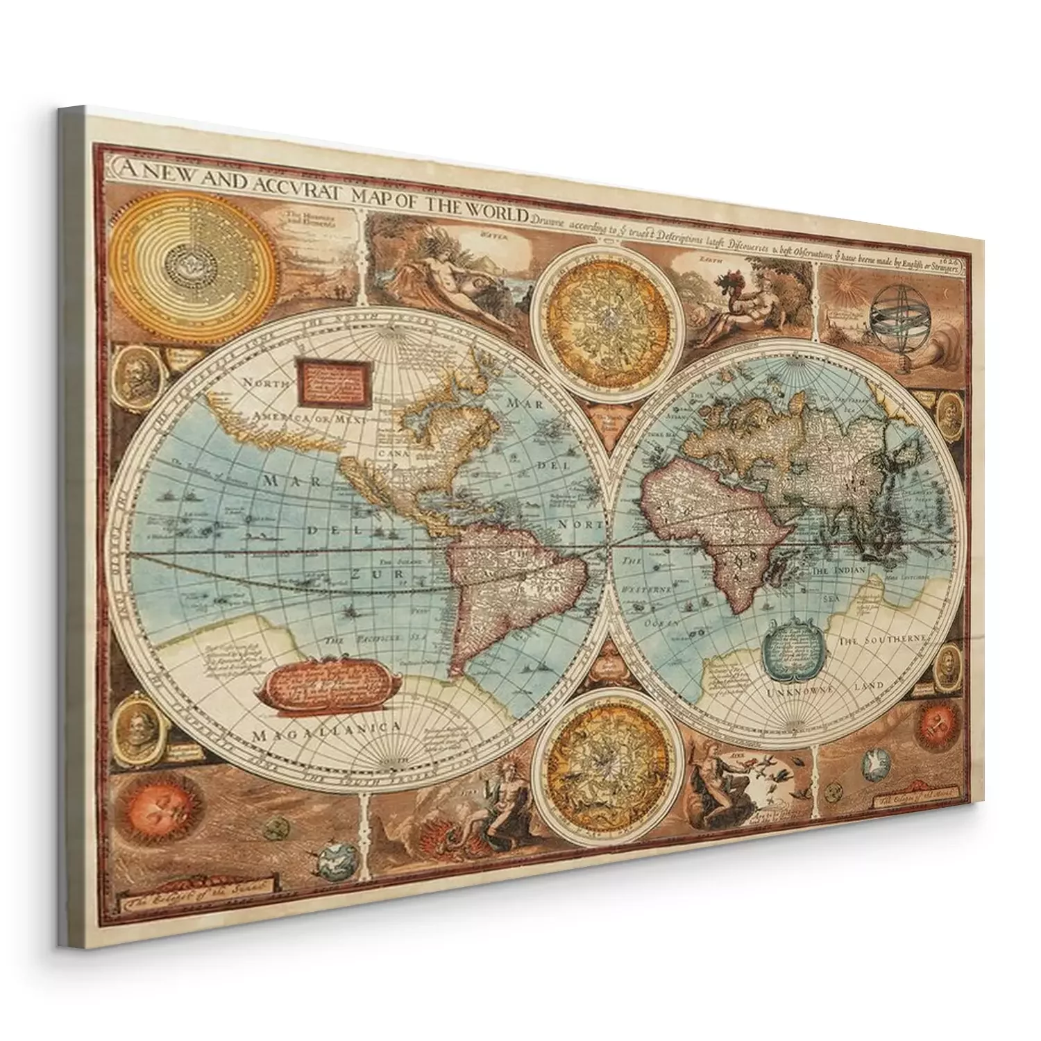 Canvas: Antieke wereldkaart in de stijl van oude gravures met decoraties