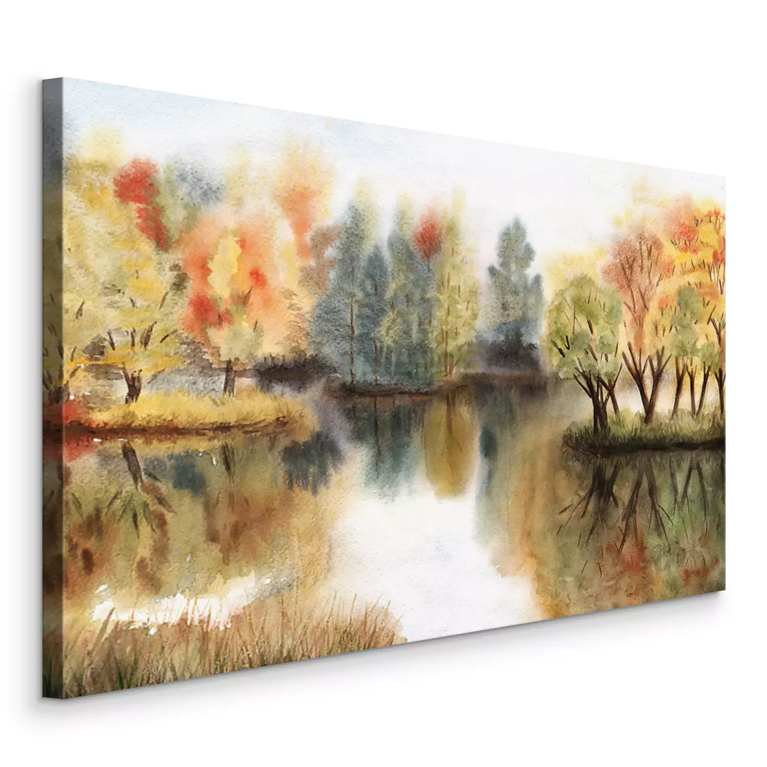 Canvas: Aquarel herfst landschap met bomen op eilanden en hun reflecties in een meer