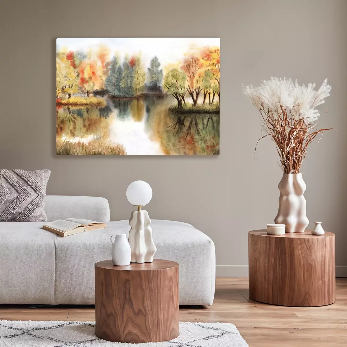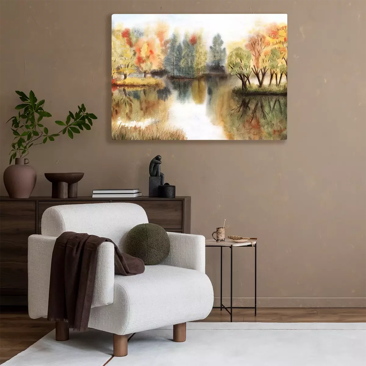 Canvas Aquarel herfst landschap met bomen op eilanden en hun reflecties in een meer