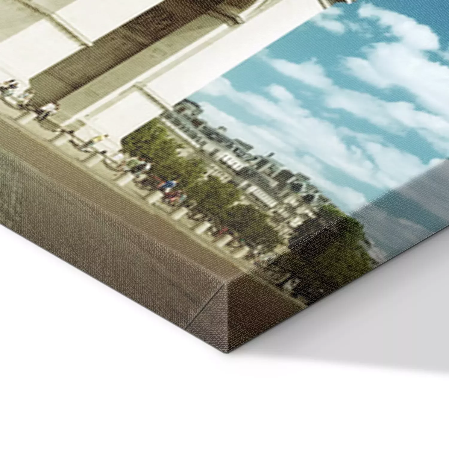 De print wordt aangebracht op hoogwaardig canvas dat op een schildersweefgetouw (spieraam) wordt gespannen. Omdat de print de zijranden bedekt, hoeft het ontwerp niet met een extra kader te worden omlijst. Wij raden ook composities aan die uit meerdere foto's bestaan en zo een coherente compositie vormen.