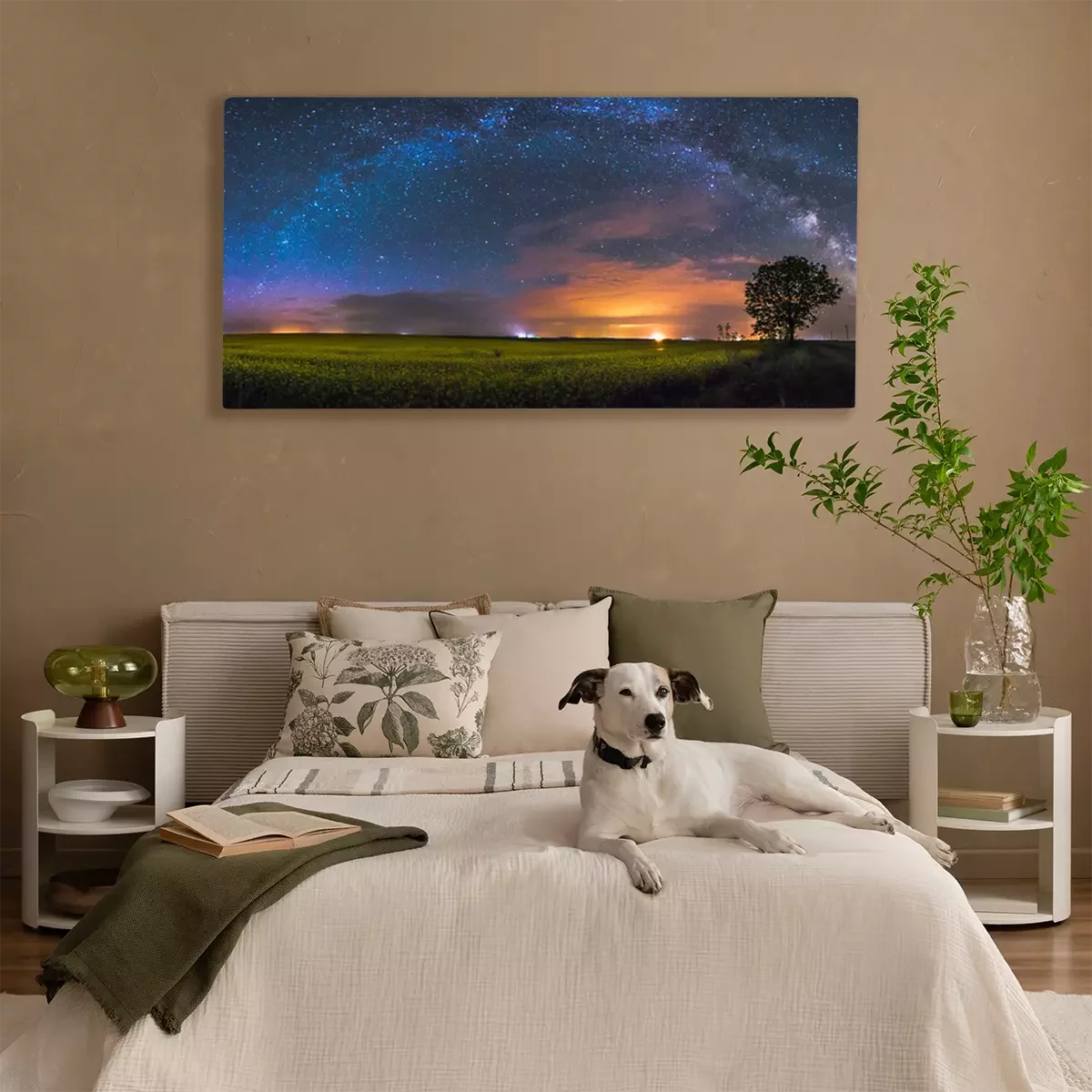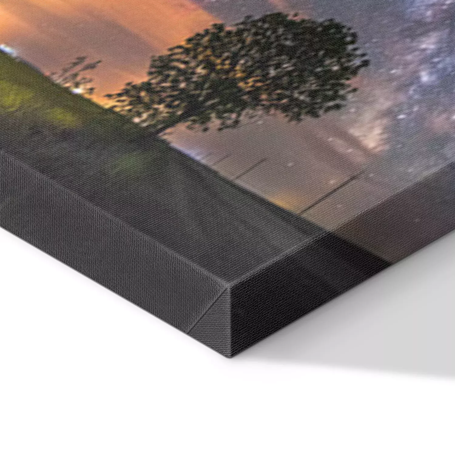 De print wordt aangebracht op hoogwaardig canvas dat op een schildersweefgetouw (spieraam) wordt gespannen. Omdat de print de zijranden bedekt, hoeft het ontwerp niet met een extra kader te worden omlijst. Wij raden ook composities aan die uit meerdere foto's bestaan en zo een coherente compositie vormen.