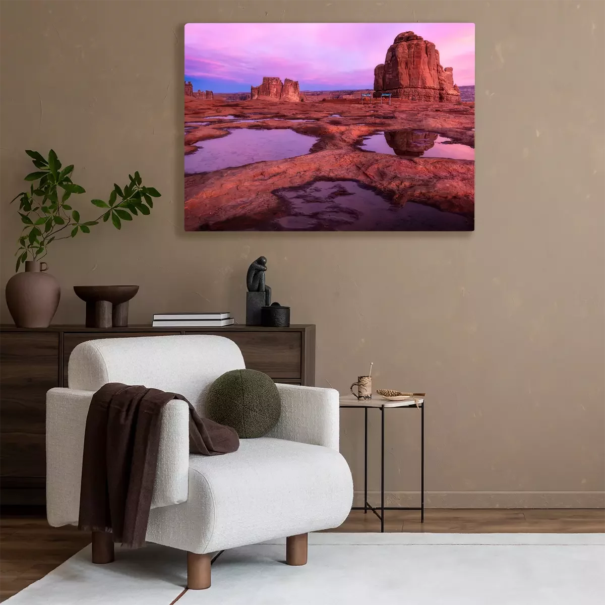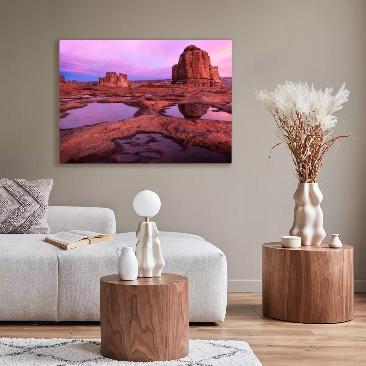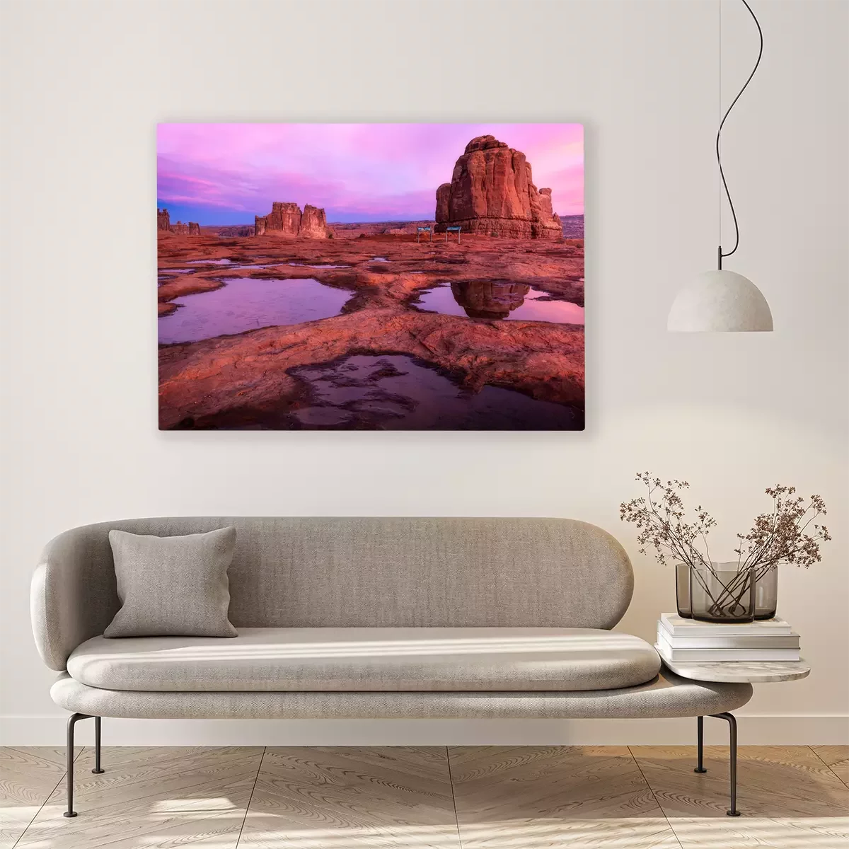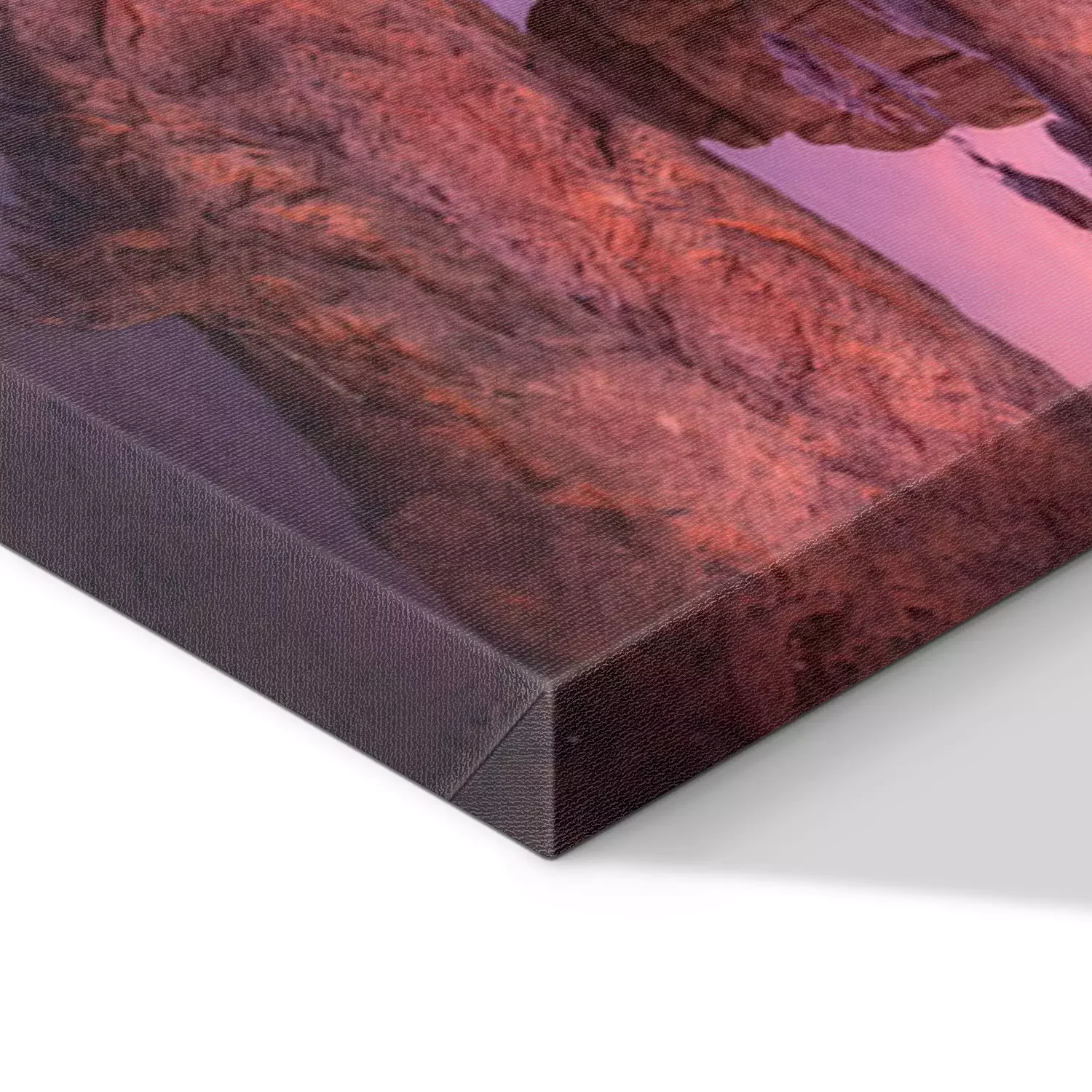 De print wordt aangebracht op hoogwaardig canvas dat op een schildersweefgetouw (spieraam) wordt gespannen. Omdat de print de zijranden bedekt, hoeft het ontwerp niet met een extra kader te worden omlijst. Wij raden ook composities aan die uit meerdere foto's bestaan en zo een coherente compositie vormen.
