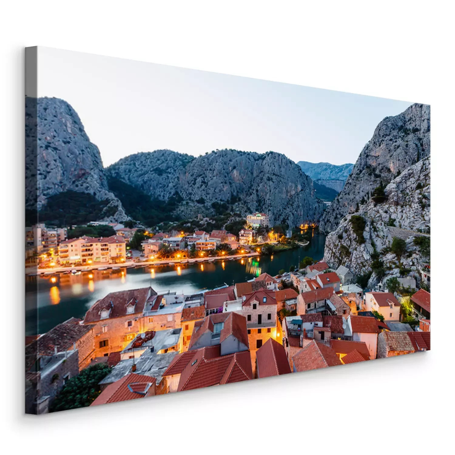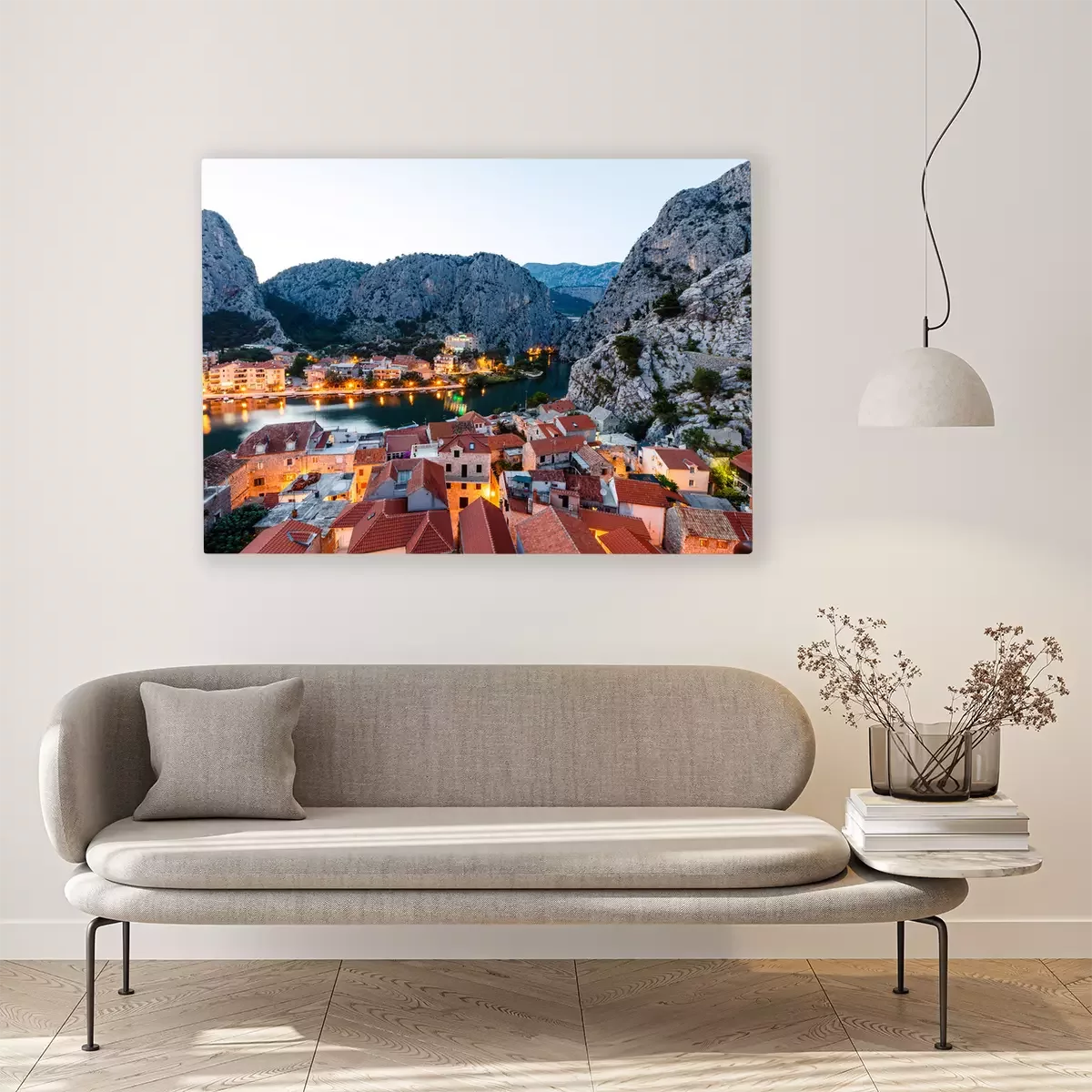 Canvas: Arial op Verlichte Stad van Omis in de Avond, Kroatië