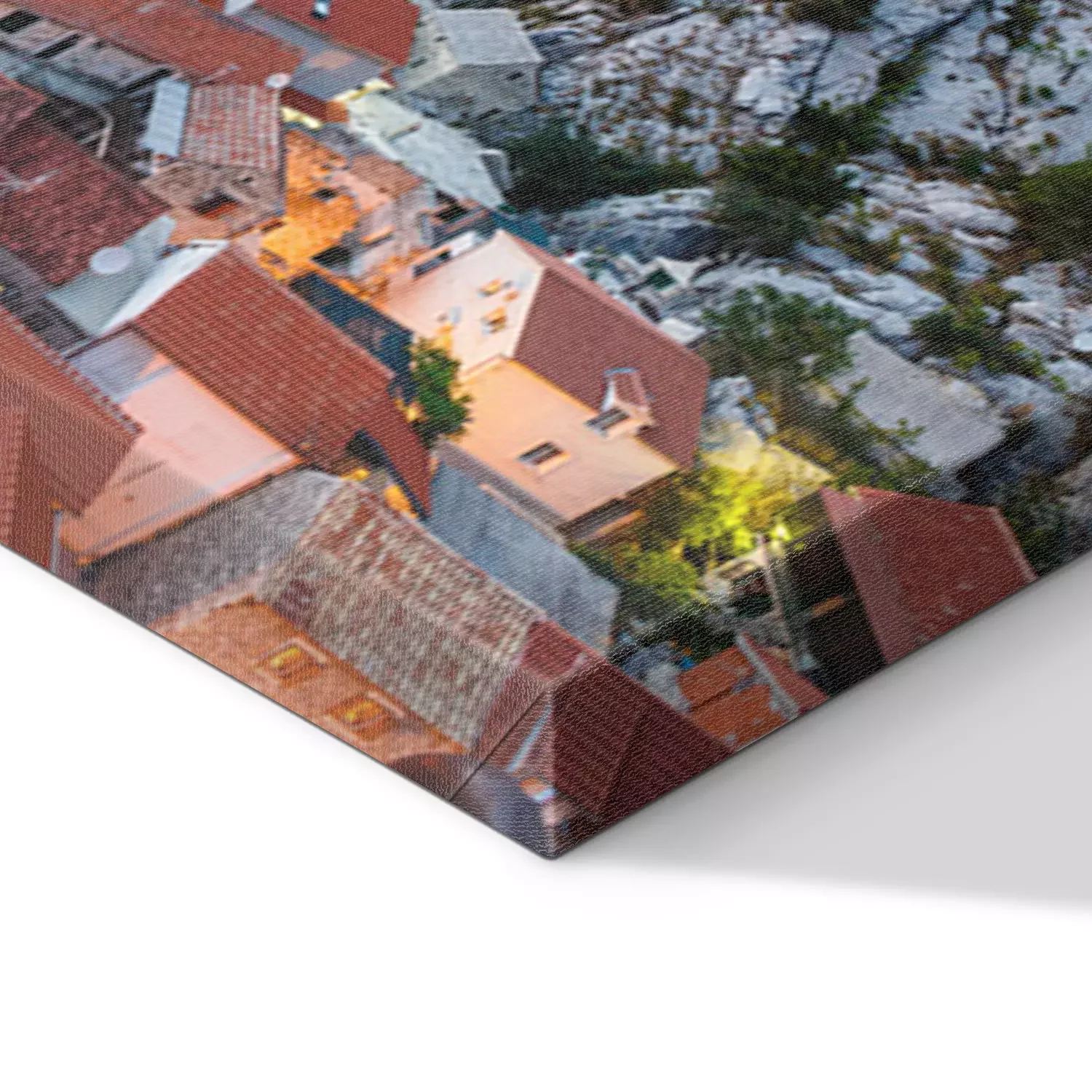 Canvas Arial op Verlichte Stad van Omis in de Avond, Kroatië