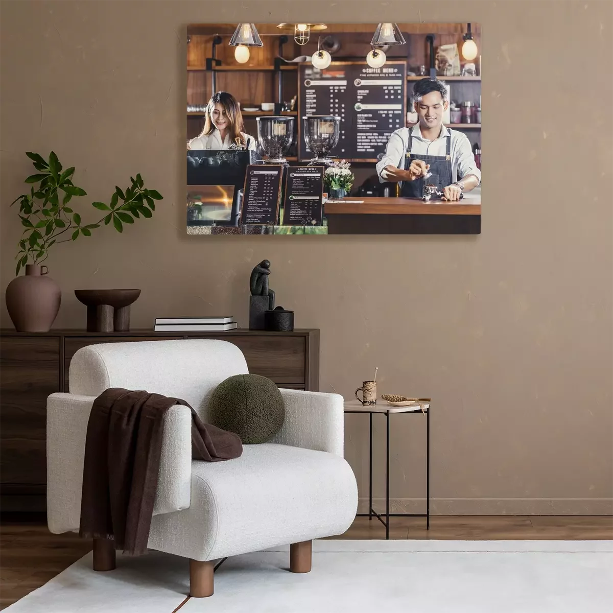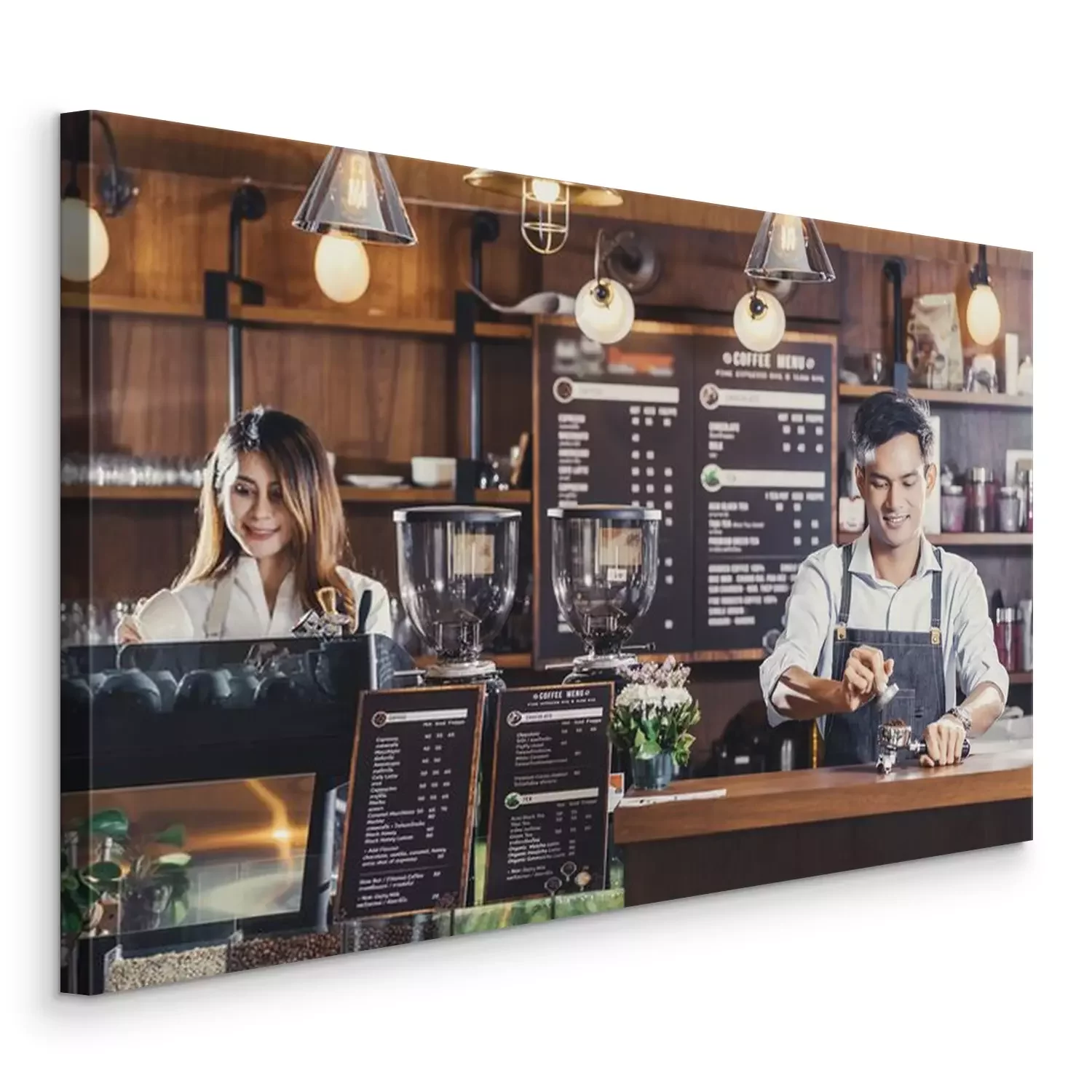 Canvas Asian Barista preparing cup of coffee, espresso with latte or cappuccino for customer order in coffee shop,bartender pouring milk,Small business owner and startup in coffee shop and restaurant concept