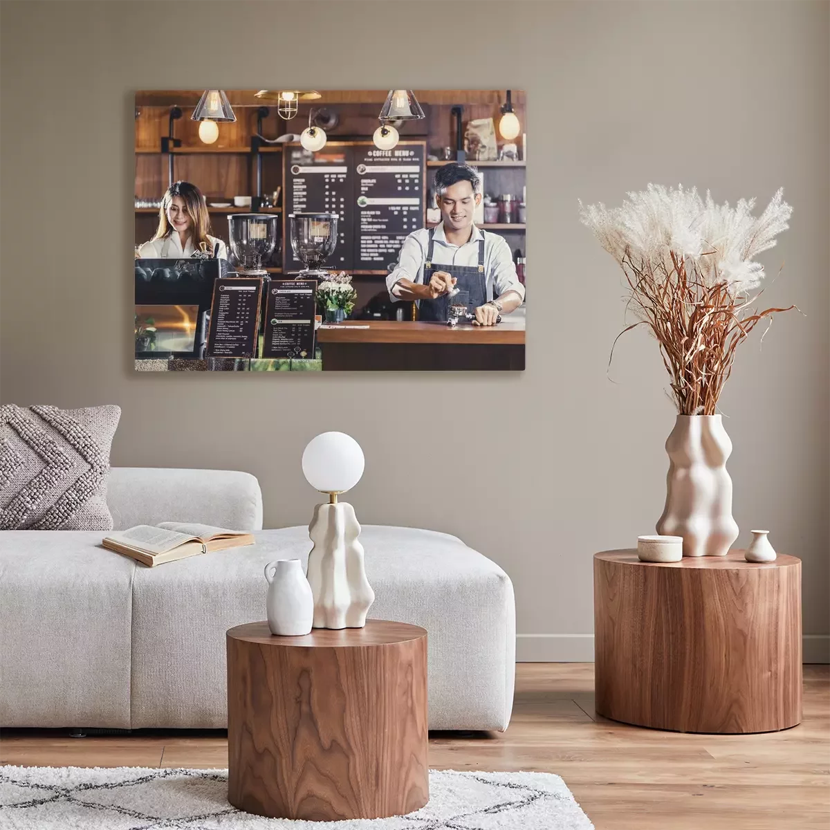 De print wordt aangebracht op hoogwaardig canvas dat op een schildersweefgetouw (spieraam) wordt gespannen. Omdat de print de zijranden bedekt, hoeft het ontwerp niet met een extra kader te worden omlijst. Wij raden ook composities aan die uit meerdere foto's bestaan en zo een coherente compositie vormen.