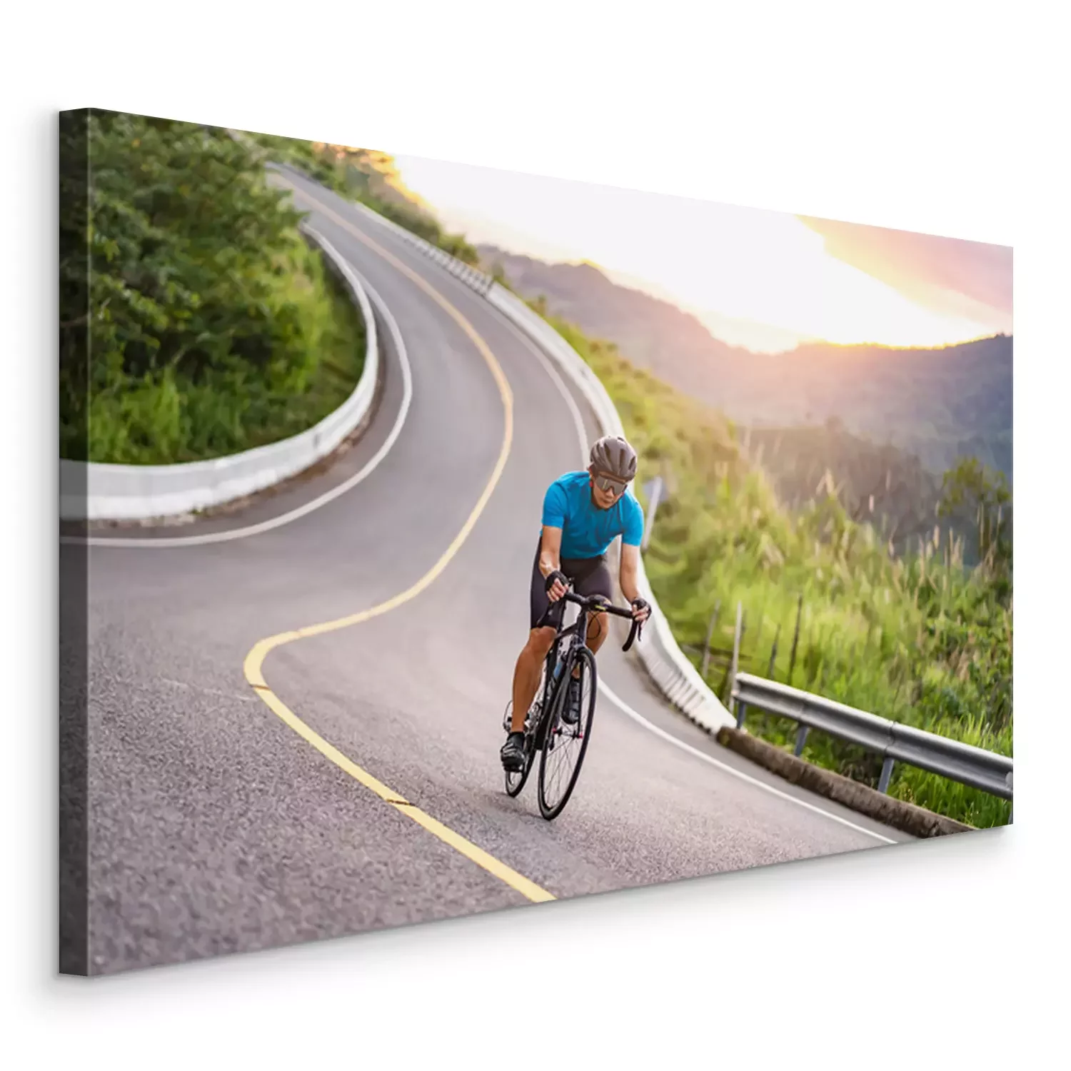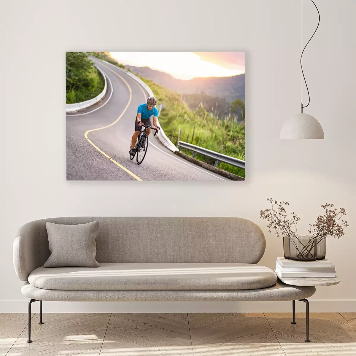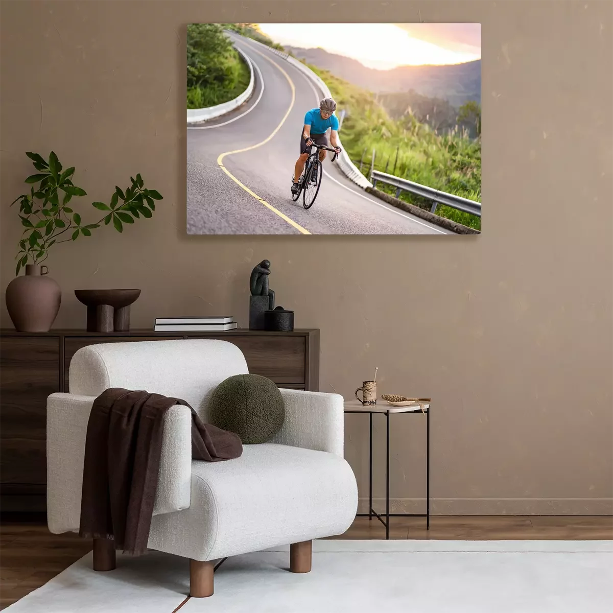 Canvas asian male riding on a black bicycle along the winding road up a hill, wearing a cycling blue jersey, crash helmet and goggles, sunset light, grey sky, and forest trees and mountains in the background