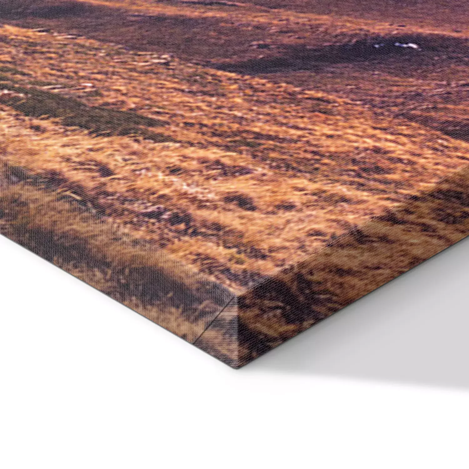 De print wordt aangebracht op hoogwaardig canvas dat op een schildersweefgetouw (spieraam) wordt gespannen. Omdat de print de zijranden bedekt, hoeft het ontwerp niet met een extra kader te worden omlijst. Wij raden ook composities aan die uit meerdere foto's bestaan en zo een coherente compositie vormen.