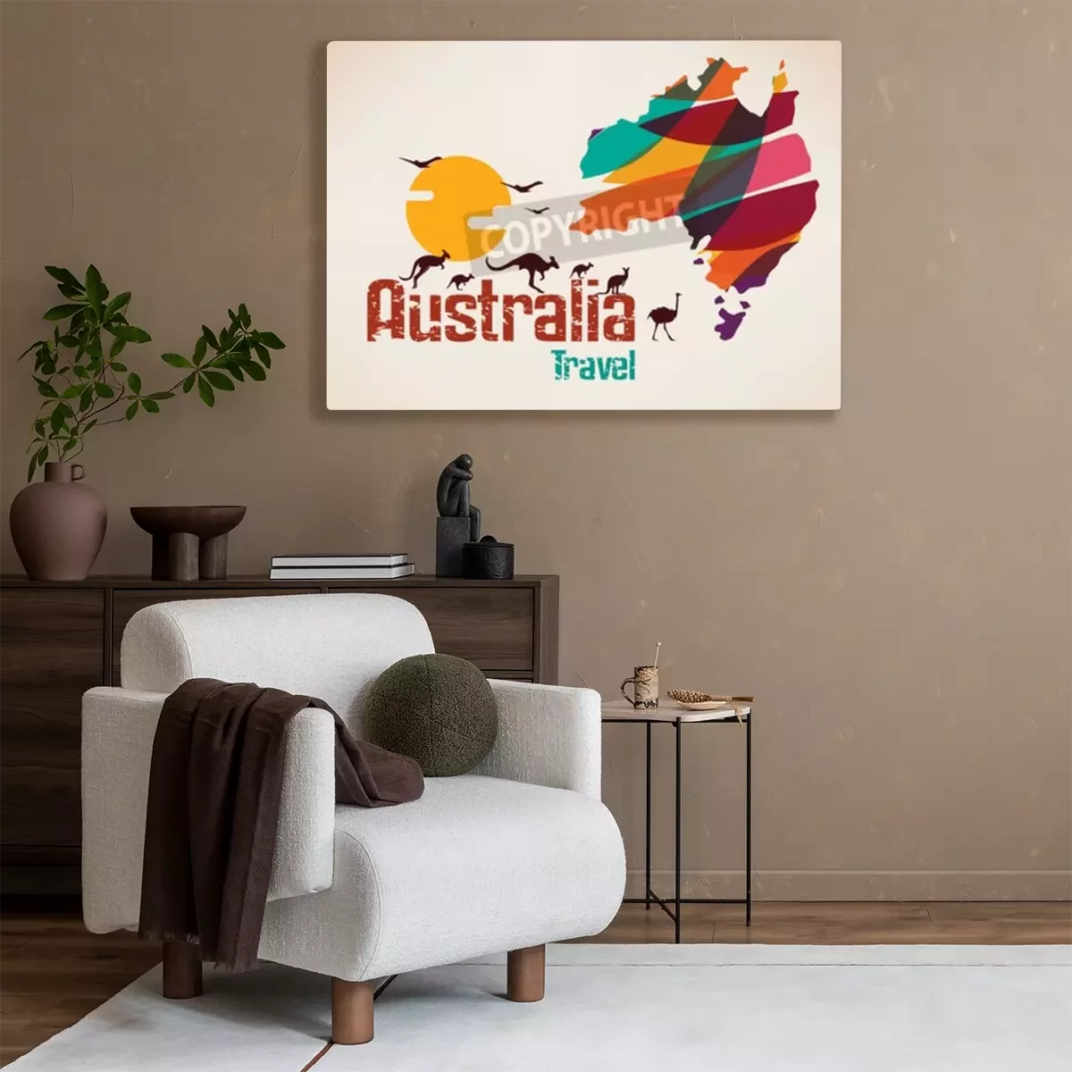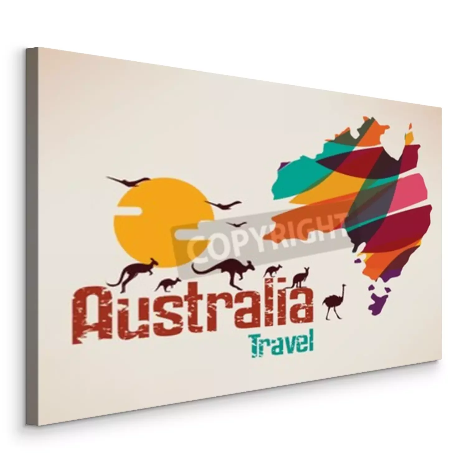 Canvas: Australische reiskaart, decratief symbool van Australië continent met springende kangoeroes silhouetten