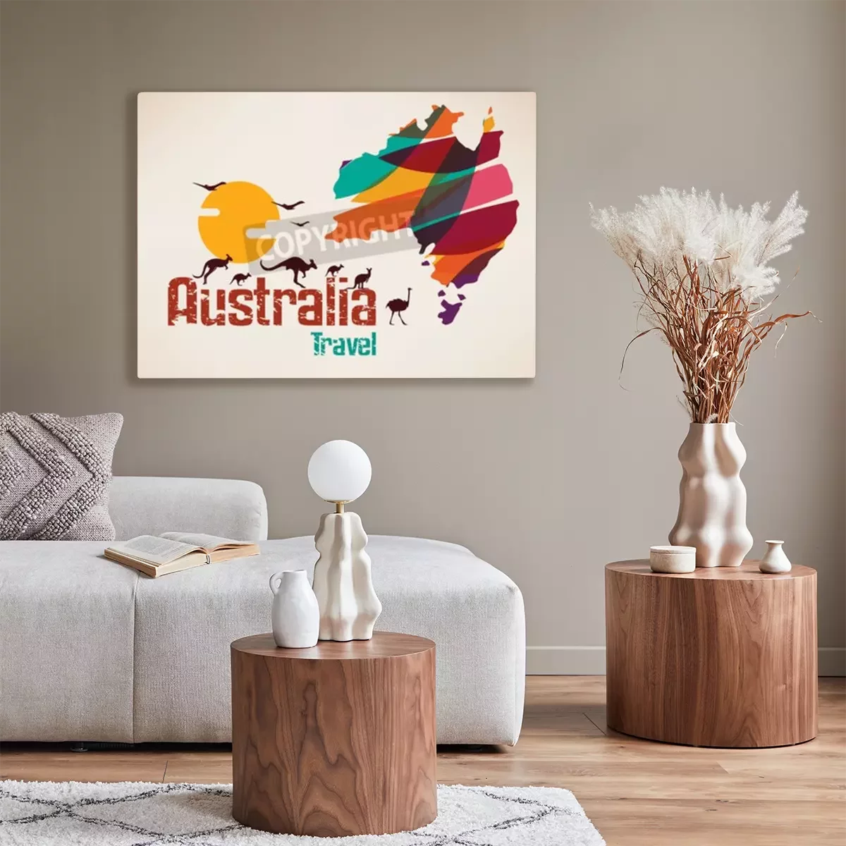 Canvas Australische reiskaart, decratief symbool van Australië continent met springende kangoeroes silhouetten