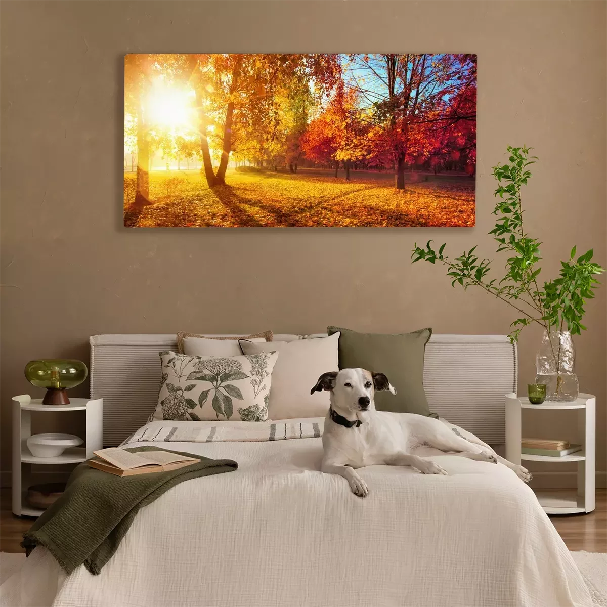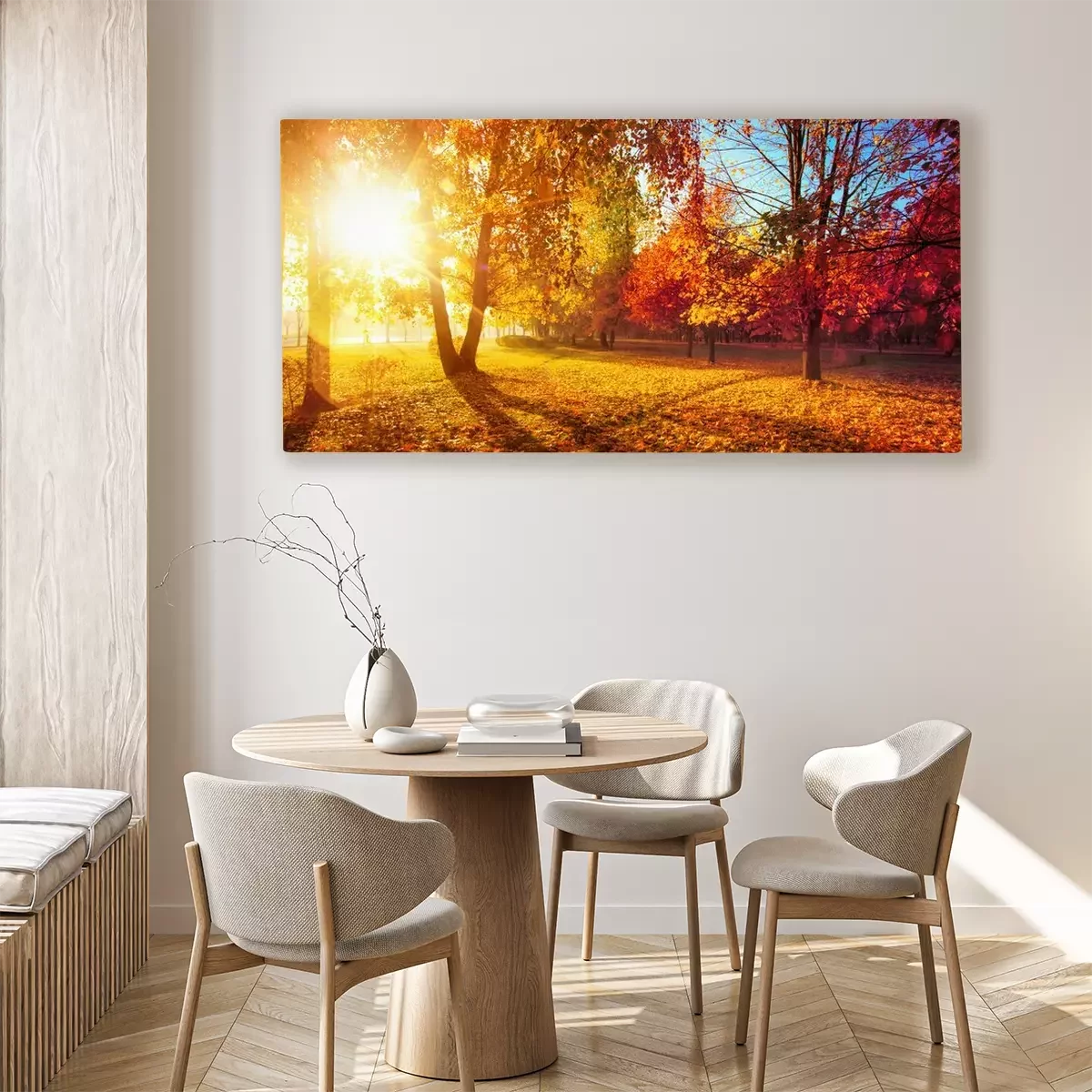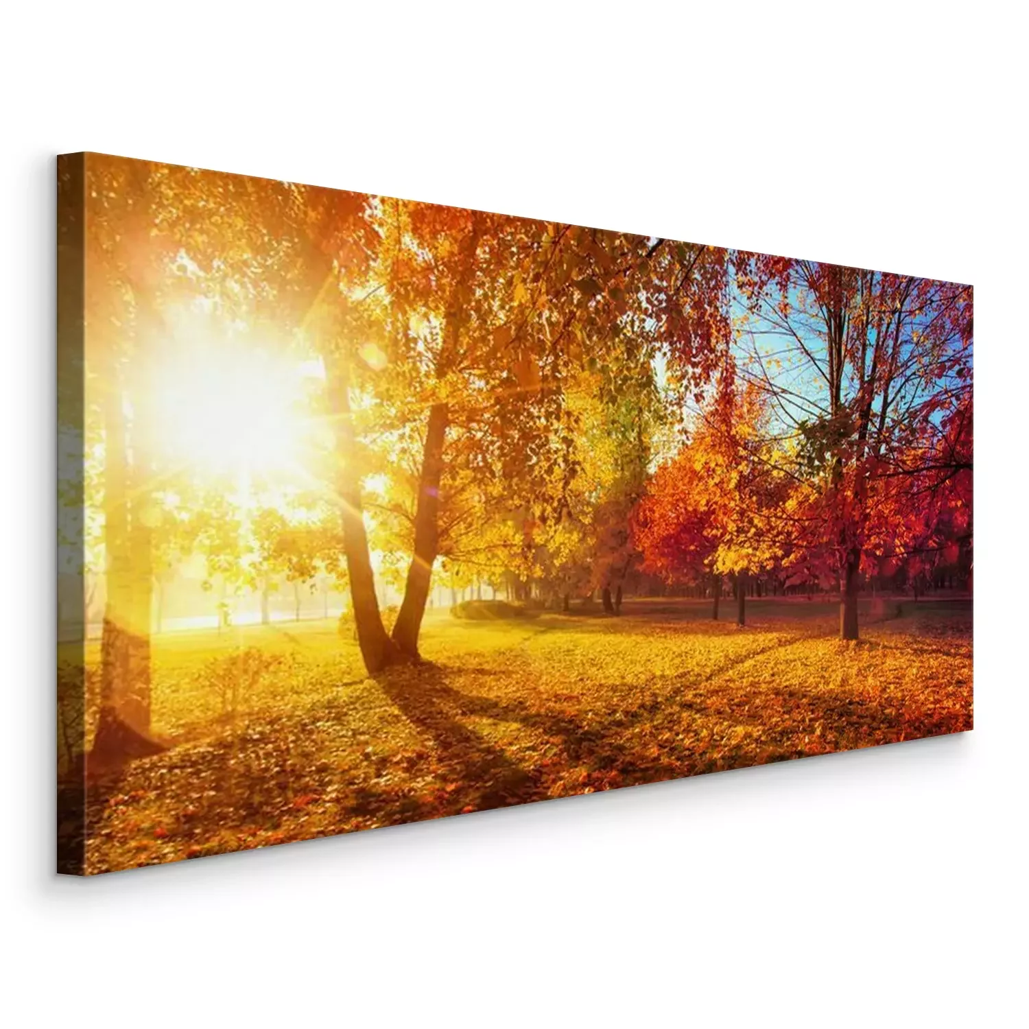 Canvas: Autumn Landscape. Fall Scene.Trees and Leaves in Sunlight Rays