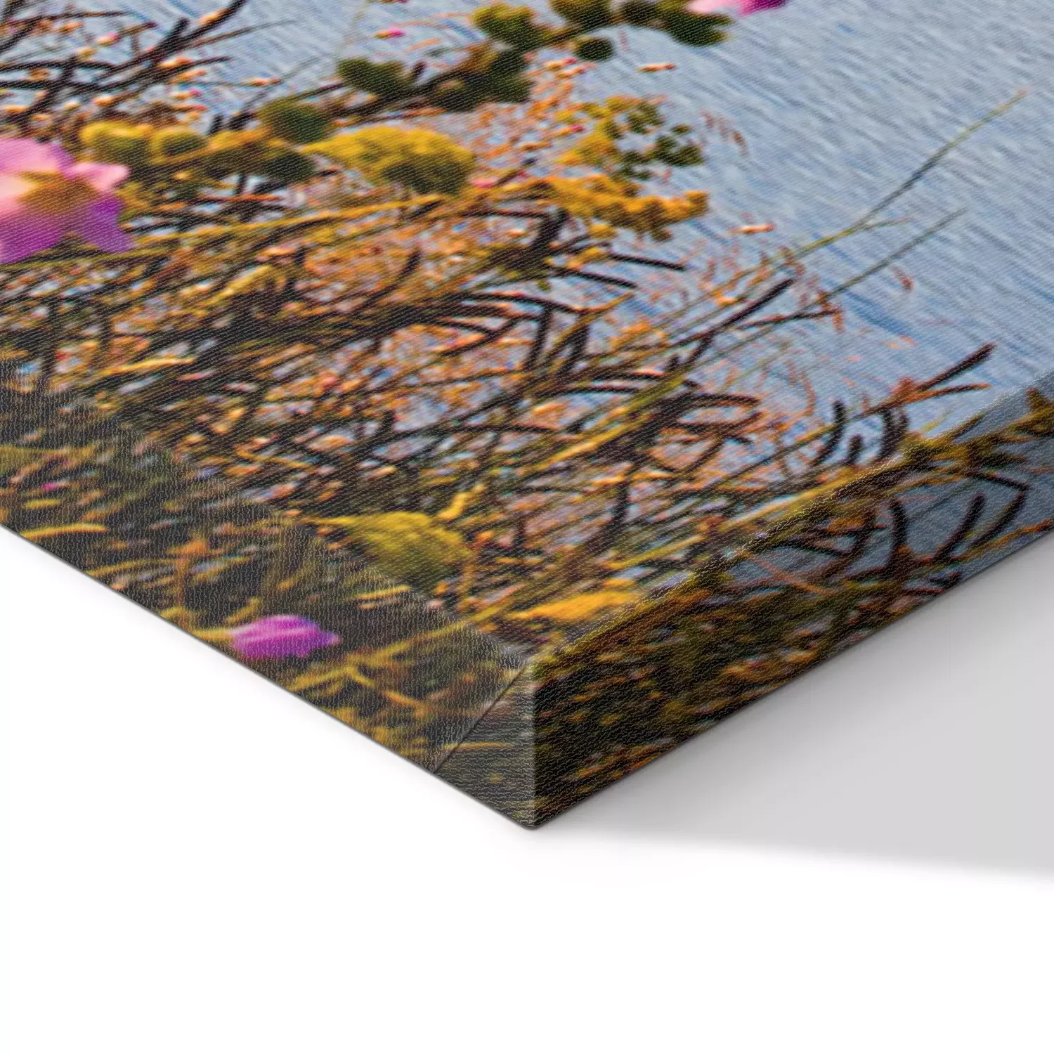 De print wordt aangebracht op hoogwaardig canvas dat op een schildersweefgetouw (spieraam) wordt gespannen. Omdat de print de zijranden bedekt, hoeft het ontwerp niet met een extra kader te worden omlijst. Wij raden ook composities aan die uit meerdere foto's bestaan en zo een coherente compositie vormen.