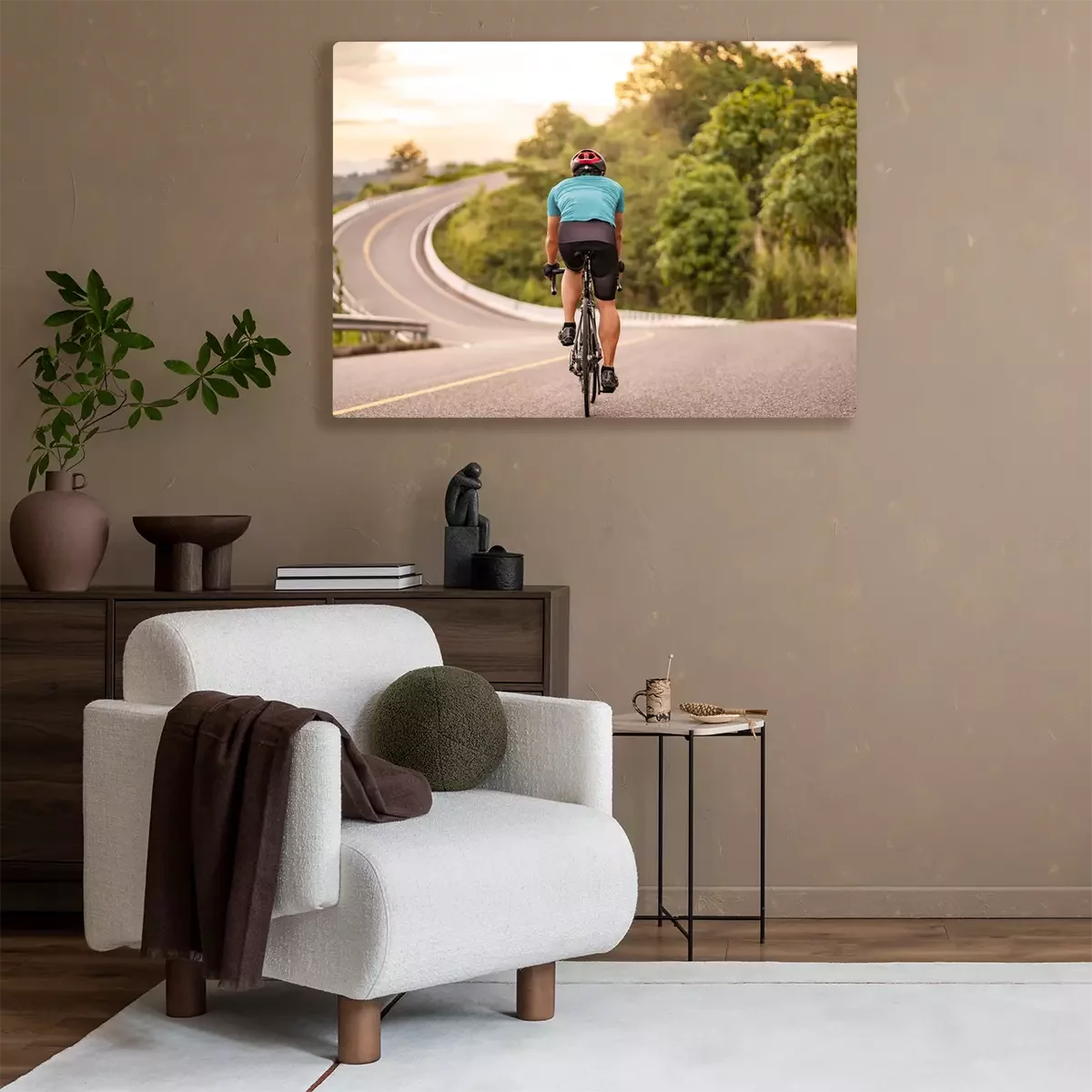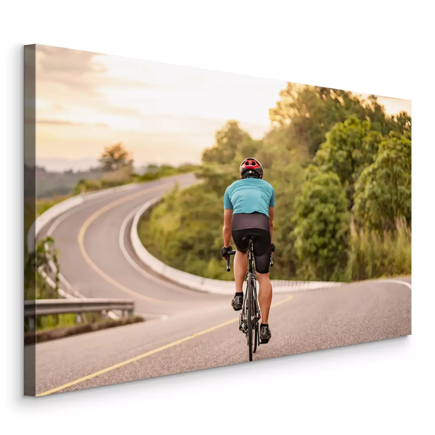 Canvas back view of a cyclist on top of a mountains winding road, riding a black bicycle down a hill, wearing bike helmet and blue cycling jersey, with grey clouds sunset sky and forest in the background.