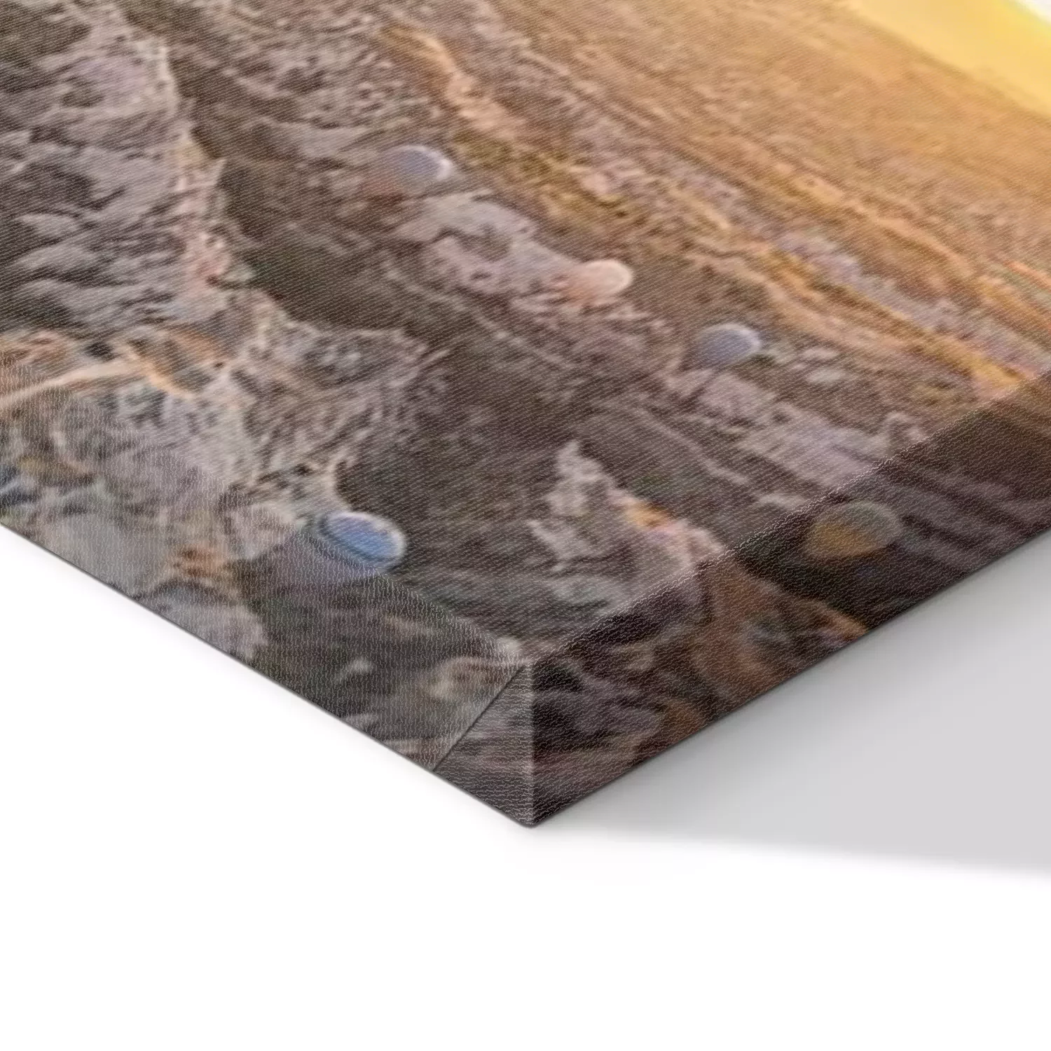 De print wordt aangebracht op hoogwaardig canvas dat op een schildersweefgetouw (spieraam) wordt gespannen. Omdat de print de zijranden bedekt, hoeft het ontwerp niet met een extra kader te worden omlijst. Wij raden ook composities aan die uit meerdere foto's bestaan en zo een coherente compositie vormen.