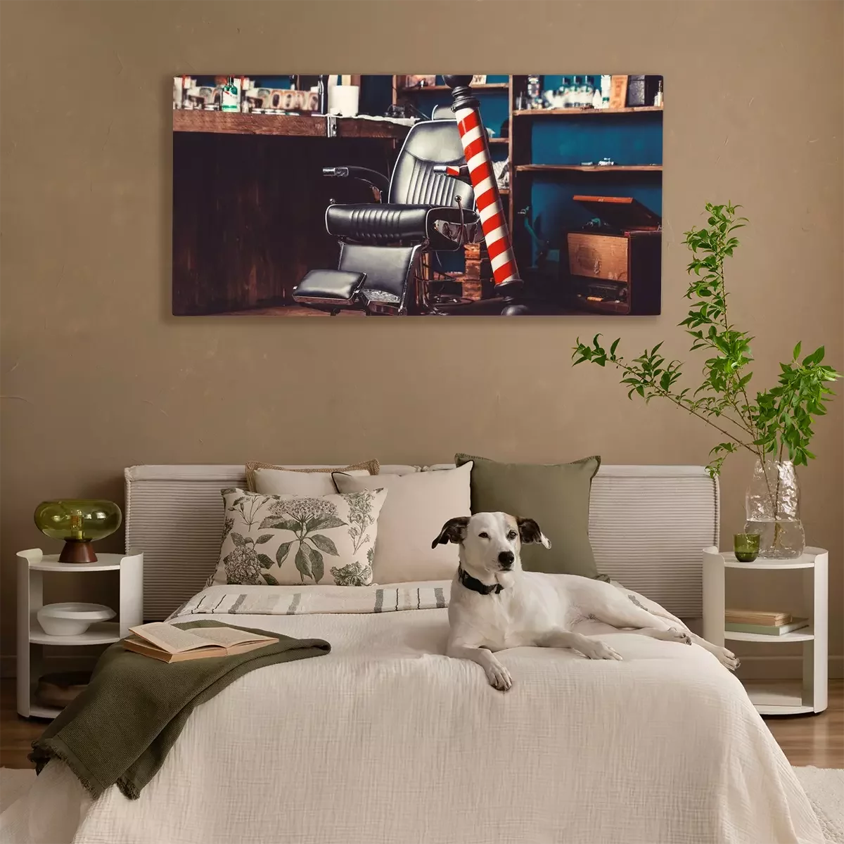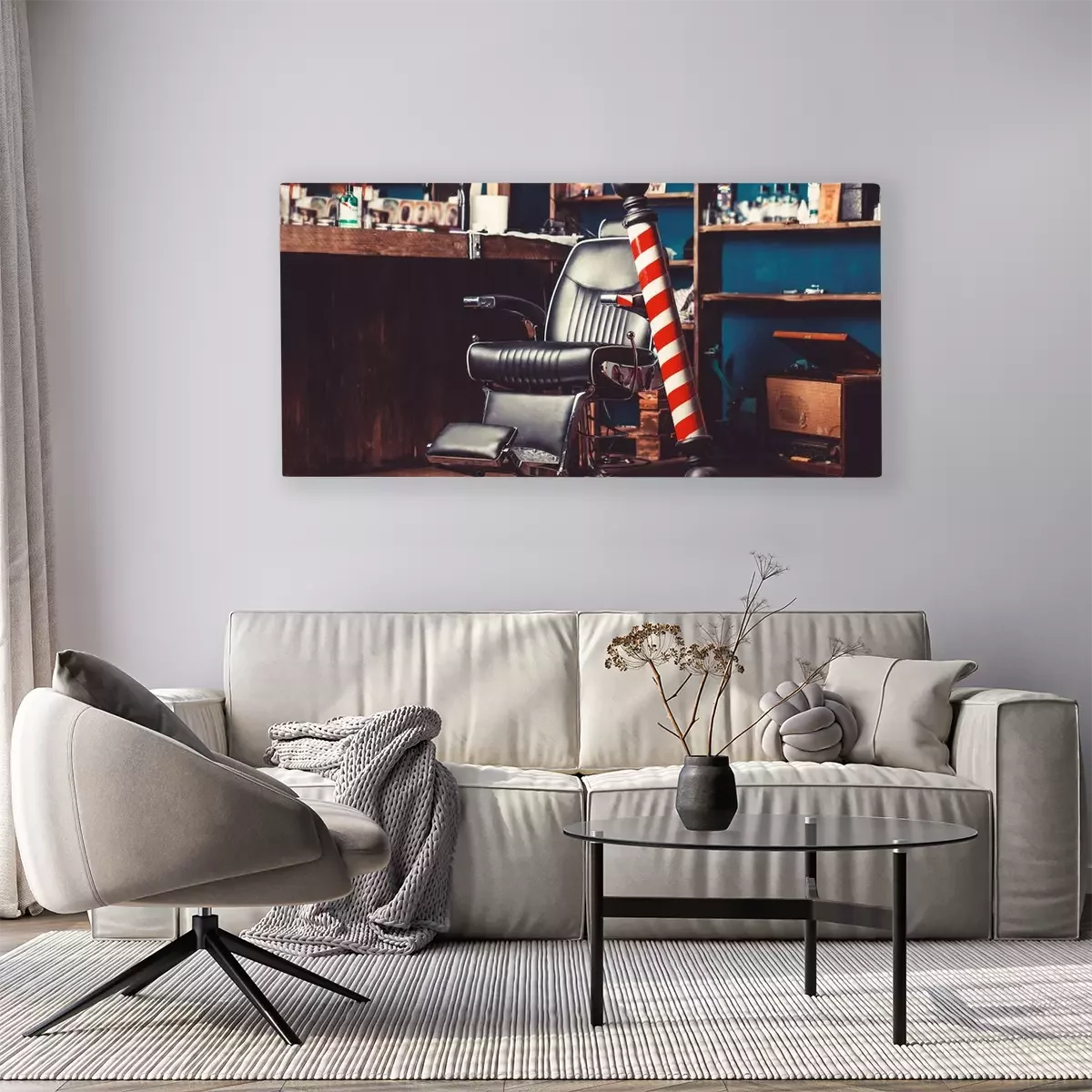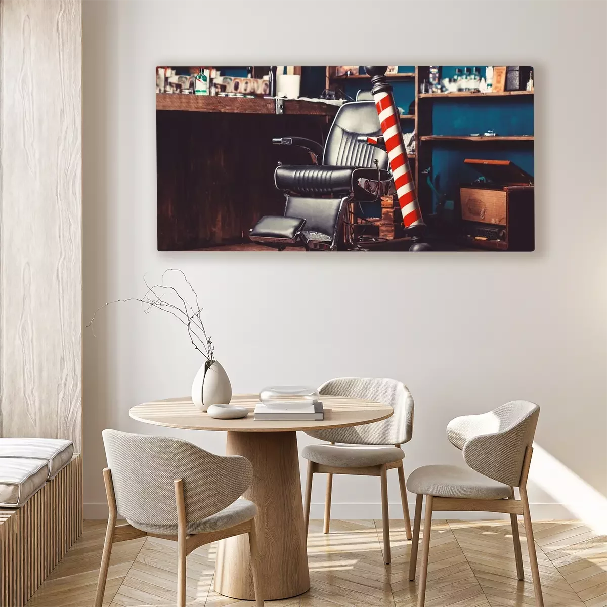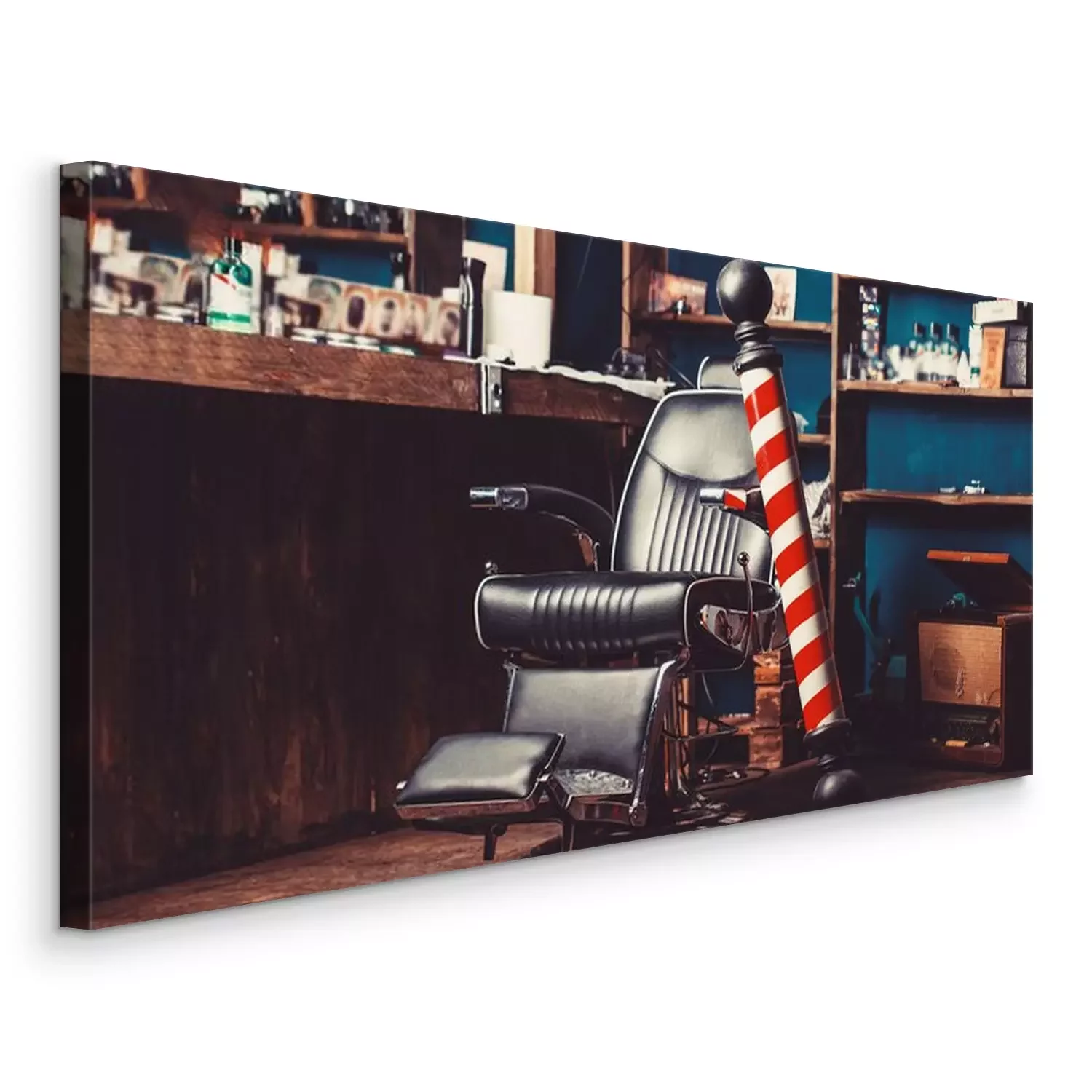 Canvas: Barber shop pole. Logo of the barbershop, symbol. Stylish vintage barber chair. Hairstylist in barbershop interior. Barber shop chair. Barbershop armchair, hairdresser, hair salon, barber shop for men