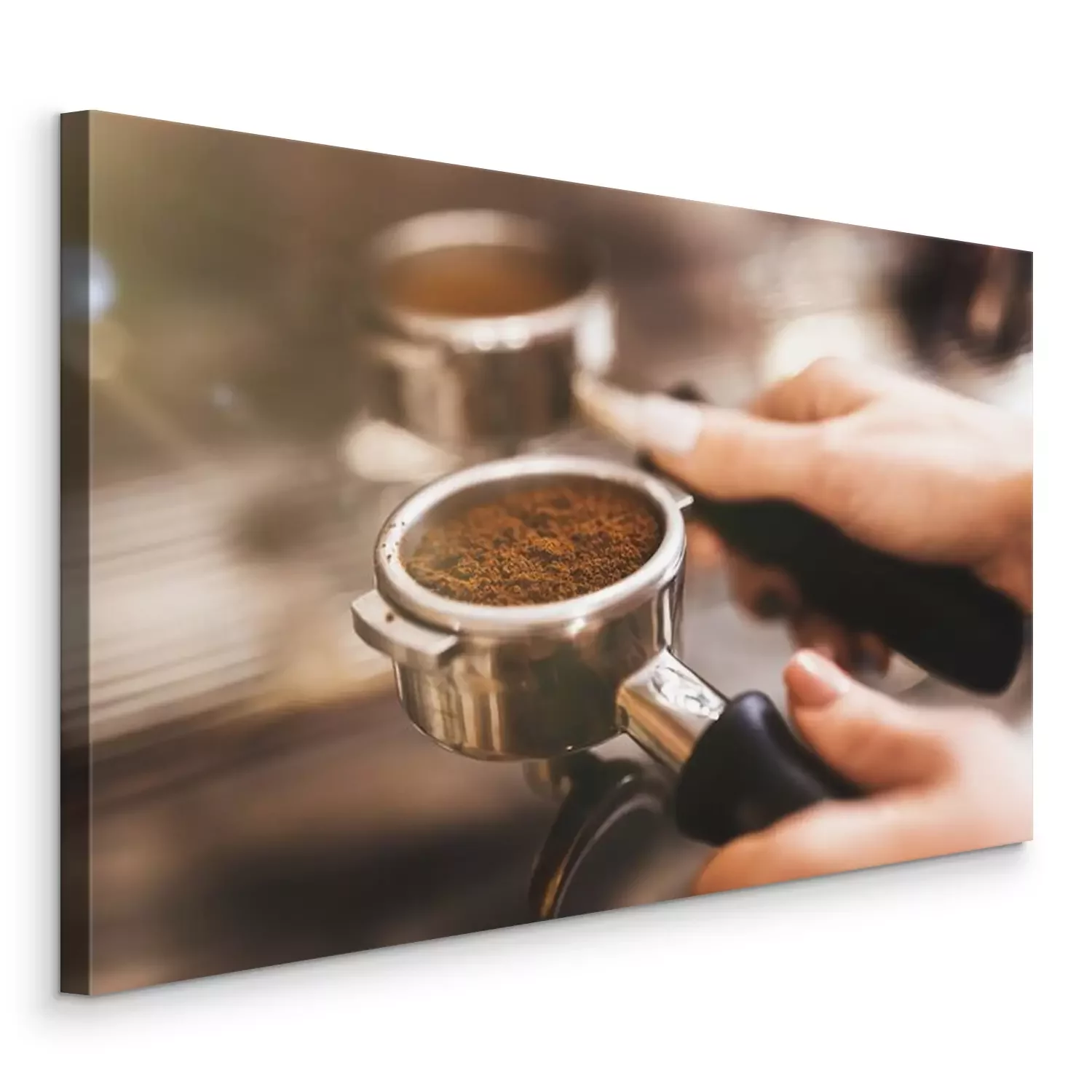Canvas Barista woman holding coffee holder with ground coffee near professional coffee machine close up