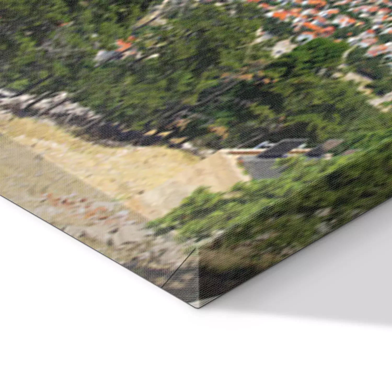 De print wordt aangebracht op hoogwaardig canvas dat op een schildersweefgetouw (spieraam) wordt gespannen. Omdat de print de zijranden bedekt, hoeft het ontwerp niet met een extra kader te worden omlijst. Wij raden ook composities aan die uit meerdere foto's bestaan en zo een coherente compositie vormen.