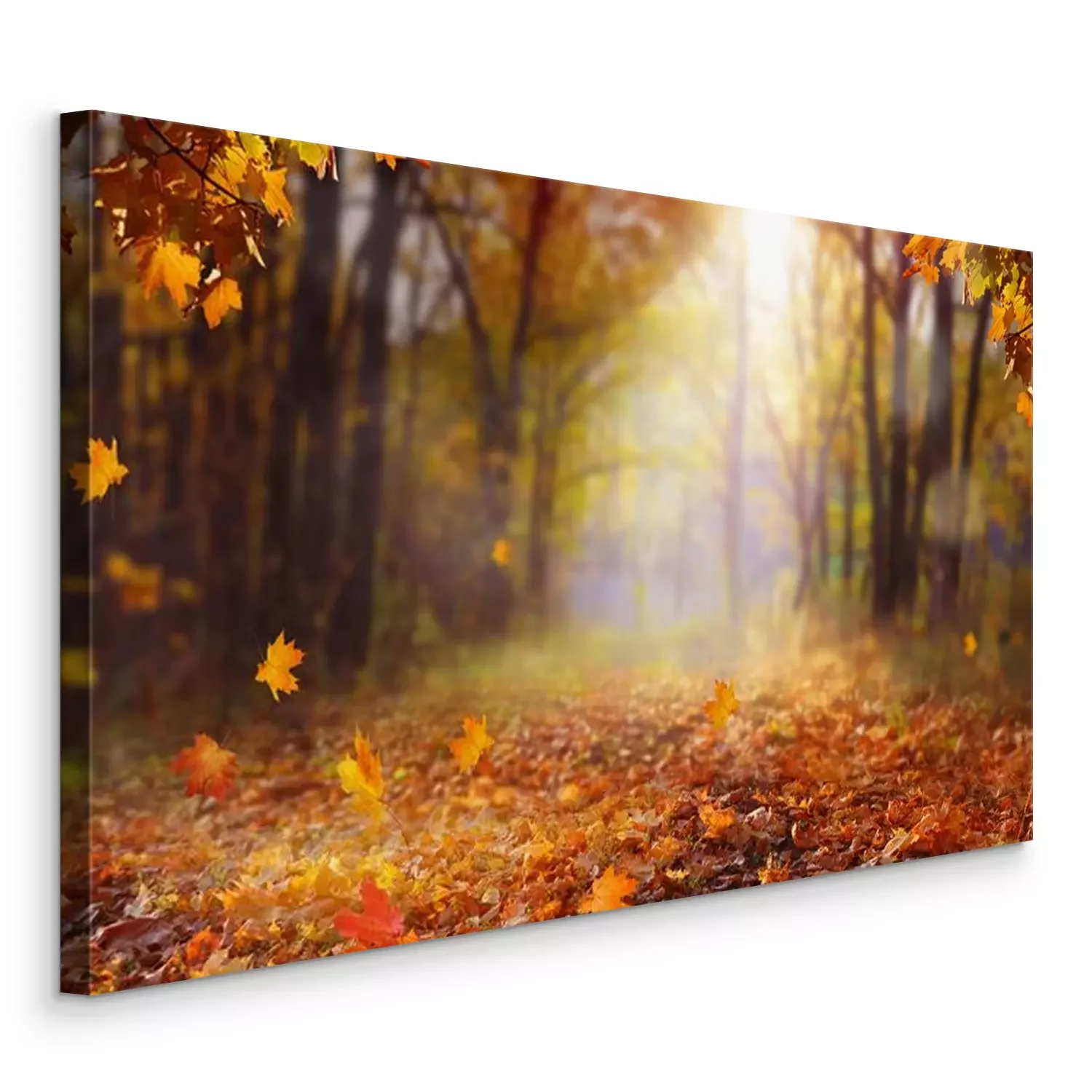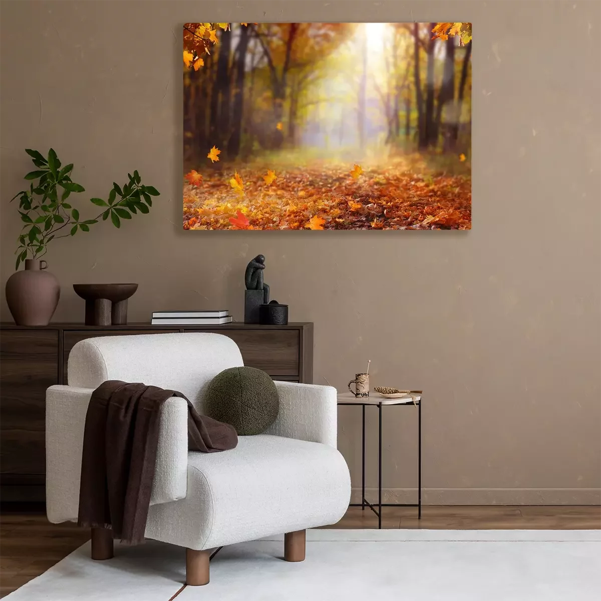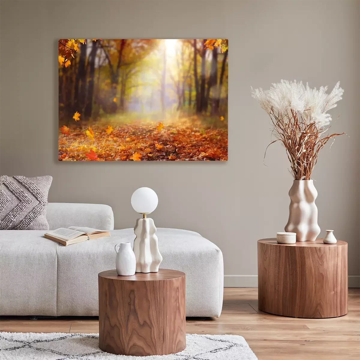 Canvas: Beautiful autumn landscape with yellow trees and sun. Colorful foliage in the park. Falling leaves natural background .Autumn season concept