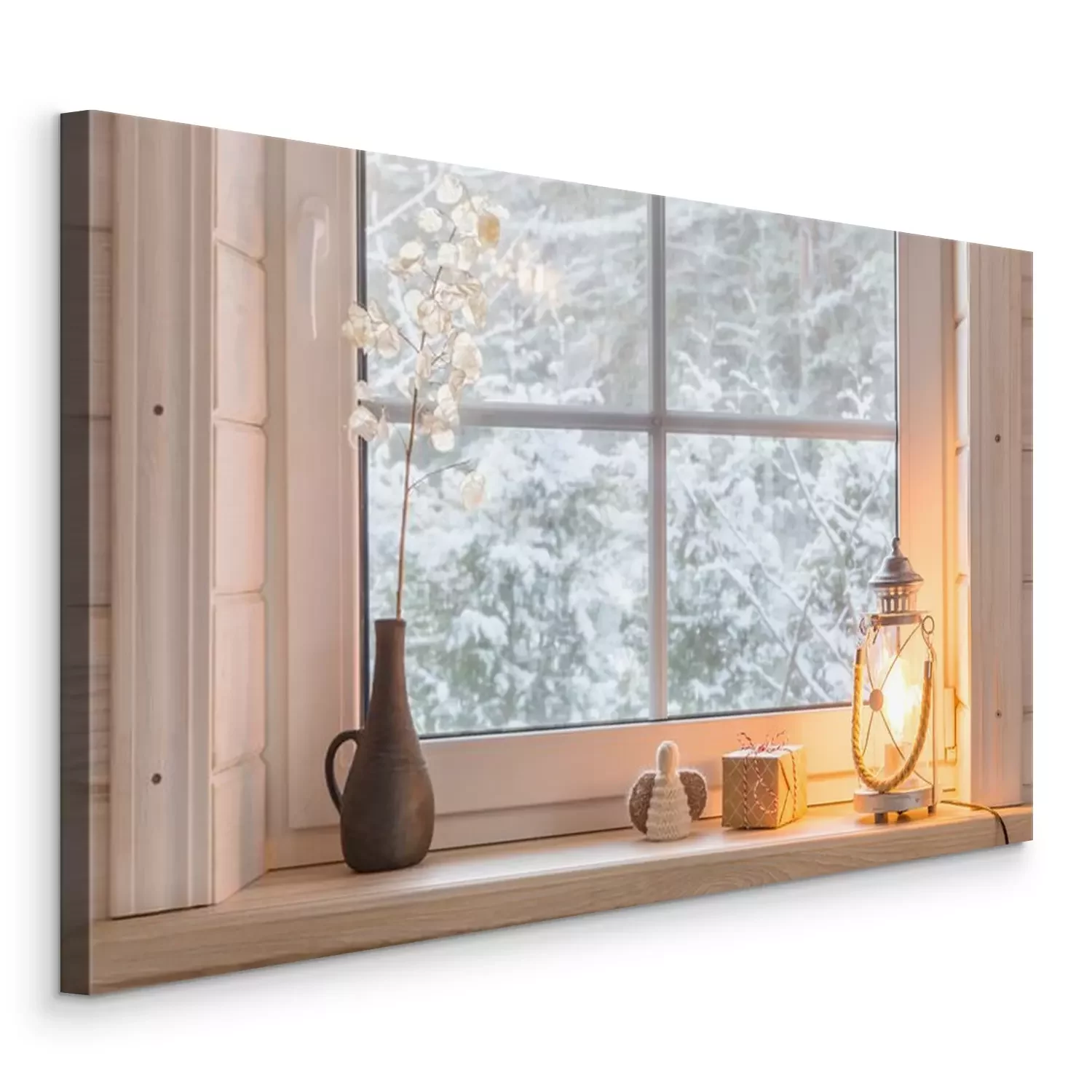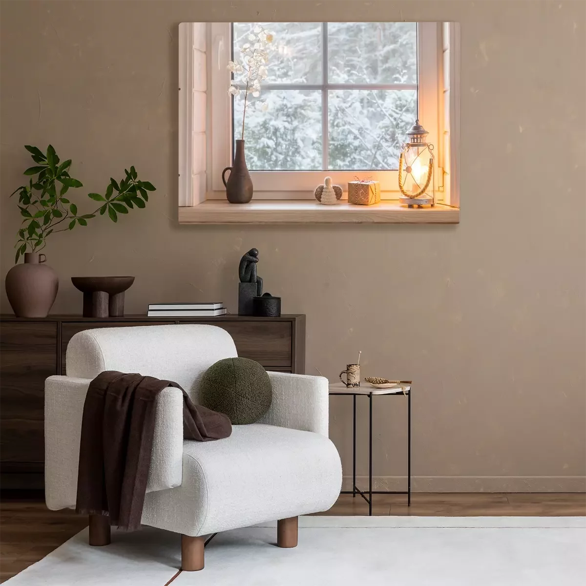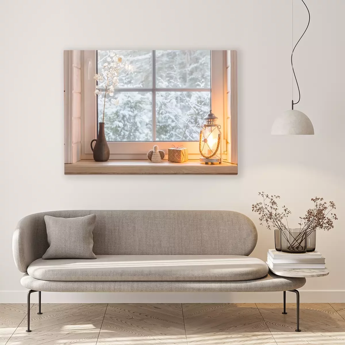 Canvas Beautiful burning candles and fairy lights on windowsill indoors