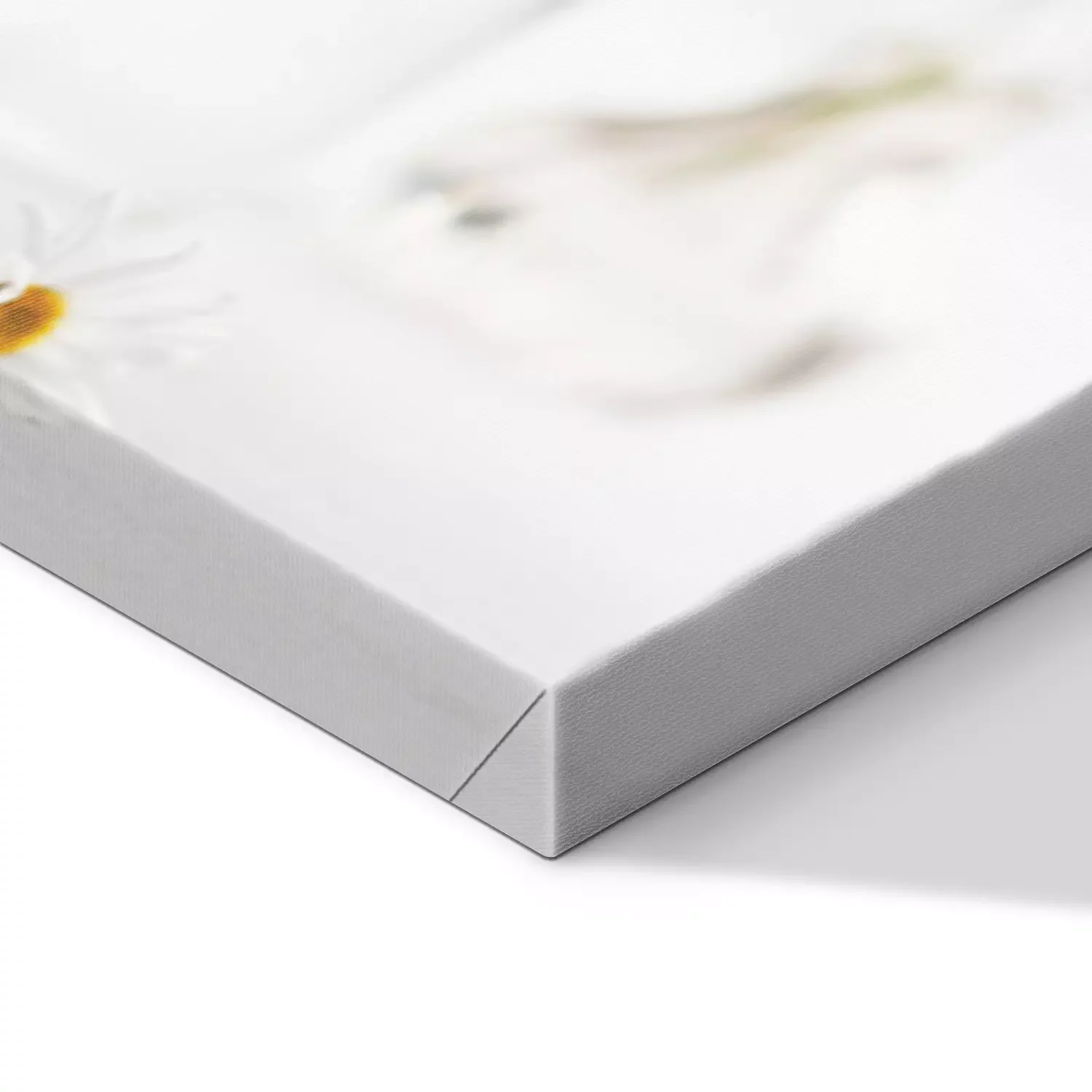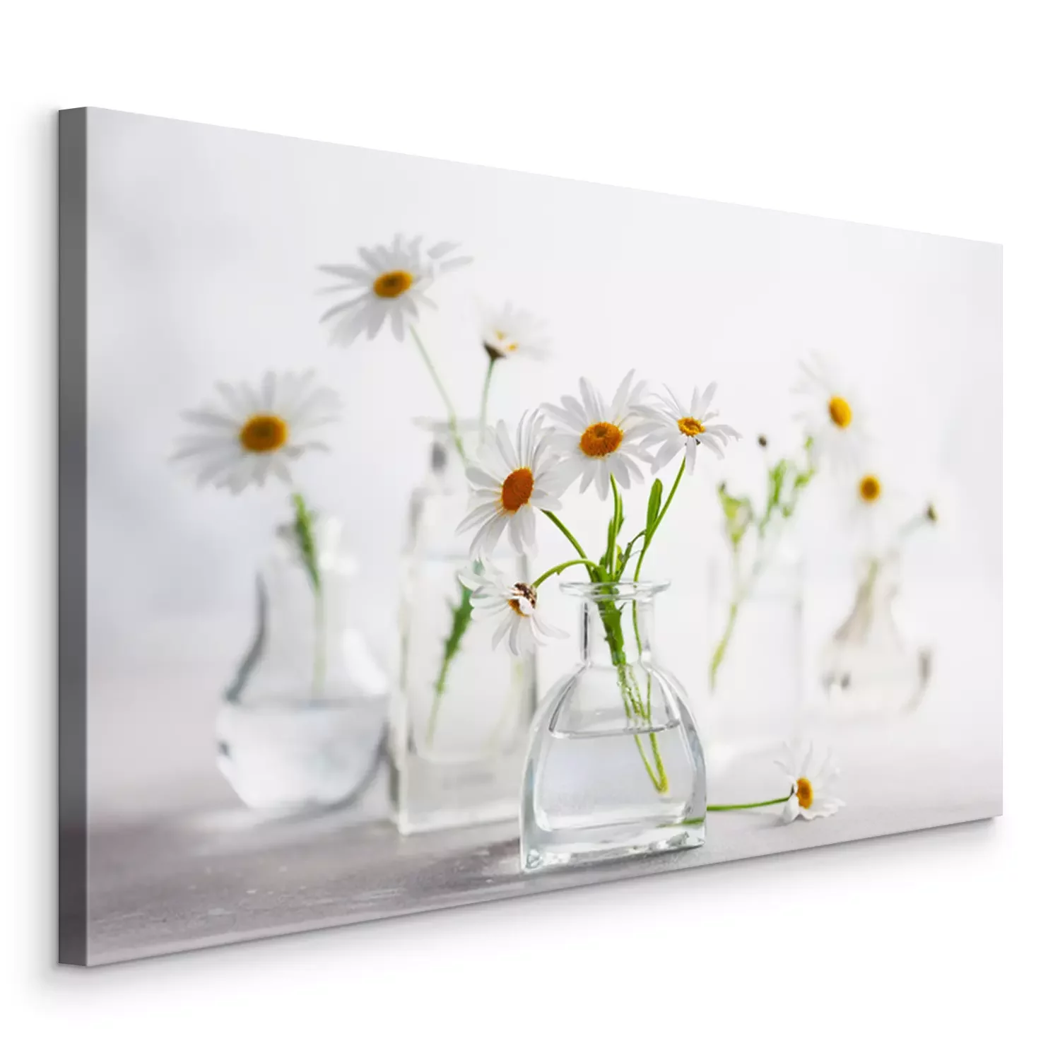 Canvas: Beautiful daisy flowers in glass vases on light background. Floral composition in home interior.