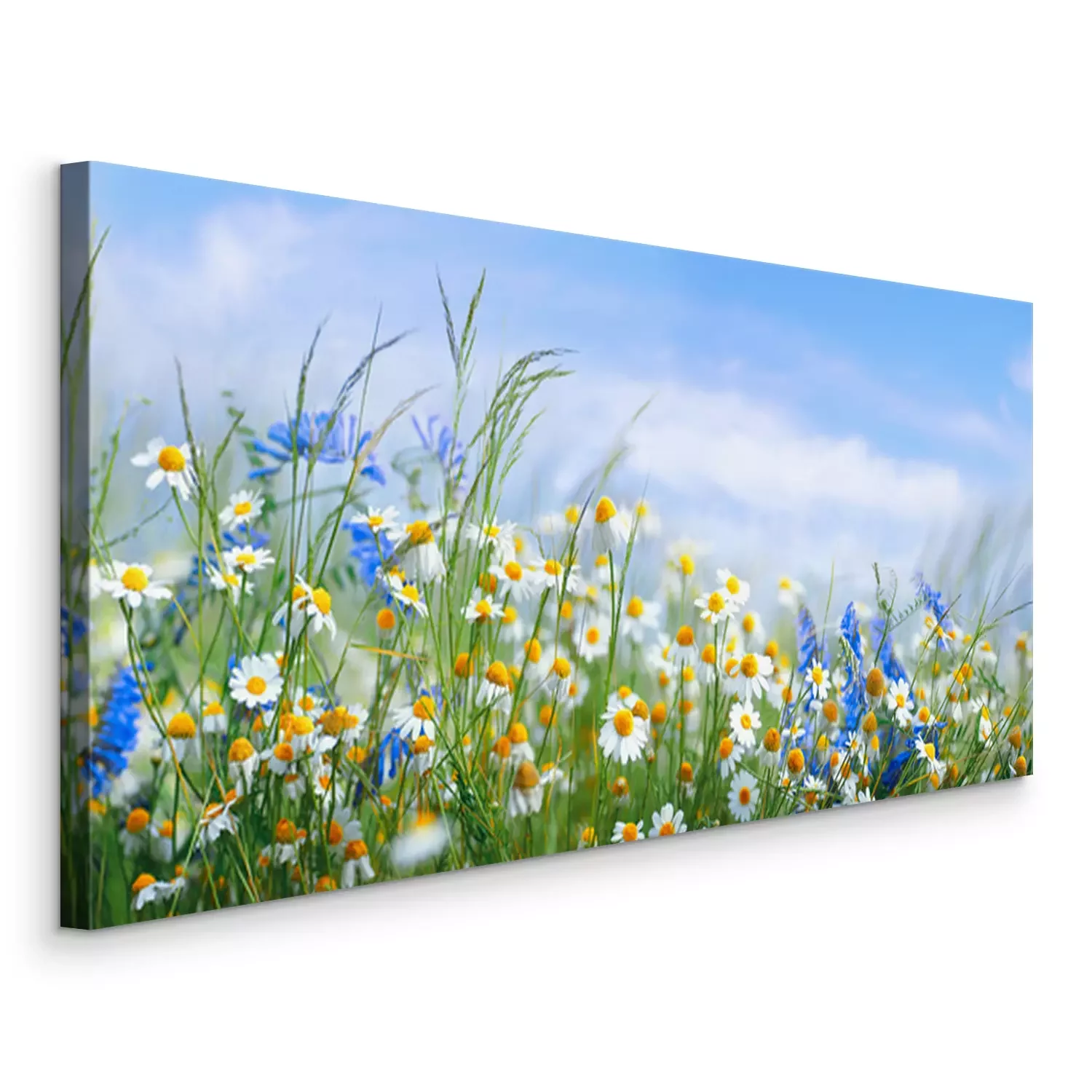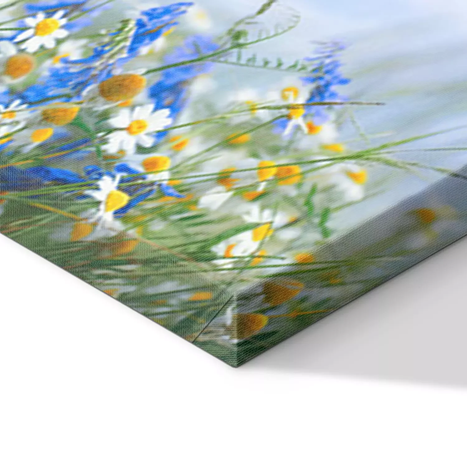 Canvas Beautiful field meadow flowers chamomile, blue wild peas in morning against blue sky with clouds, nature landscape, close-up macro. Wide format, copy space. Delightful pastoral airy artistic image.
