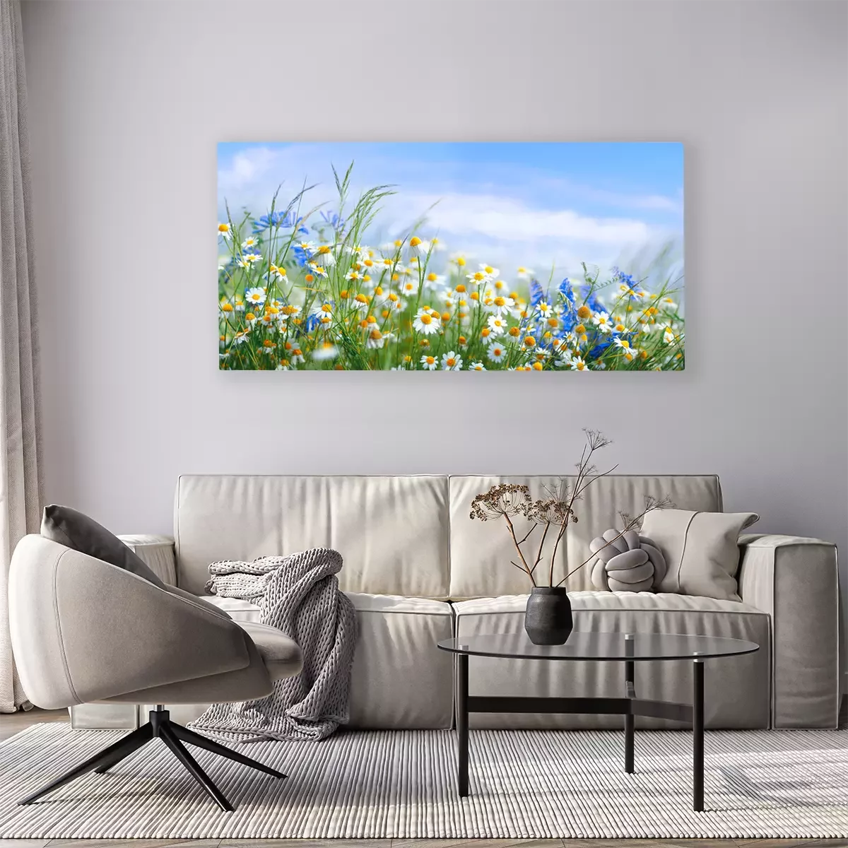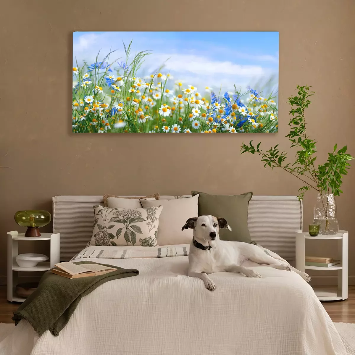Canvas: Beautiful field meadow flowers chamomile, blue wild peas in morning against blue sky with clouds, nature landscape, close-up macro. Wide format, copy space. Delightful pastoral airy artistic image.