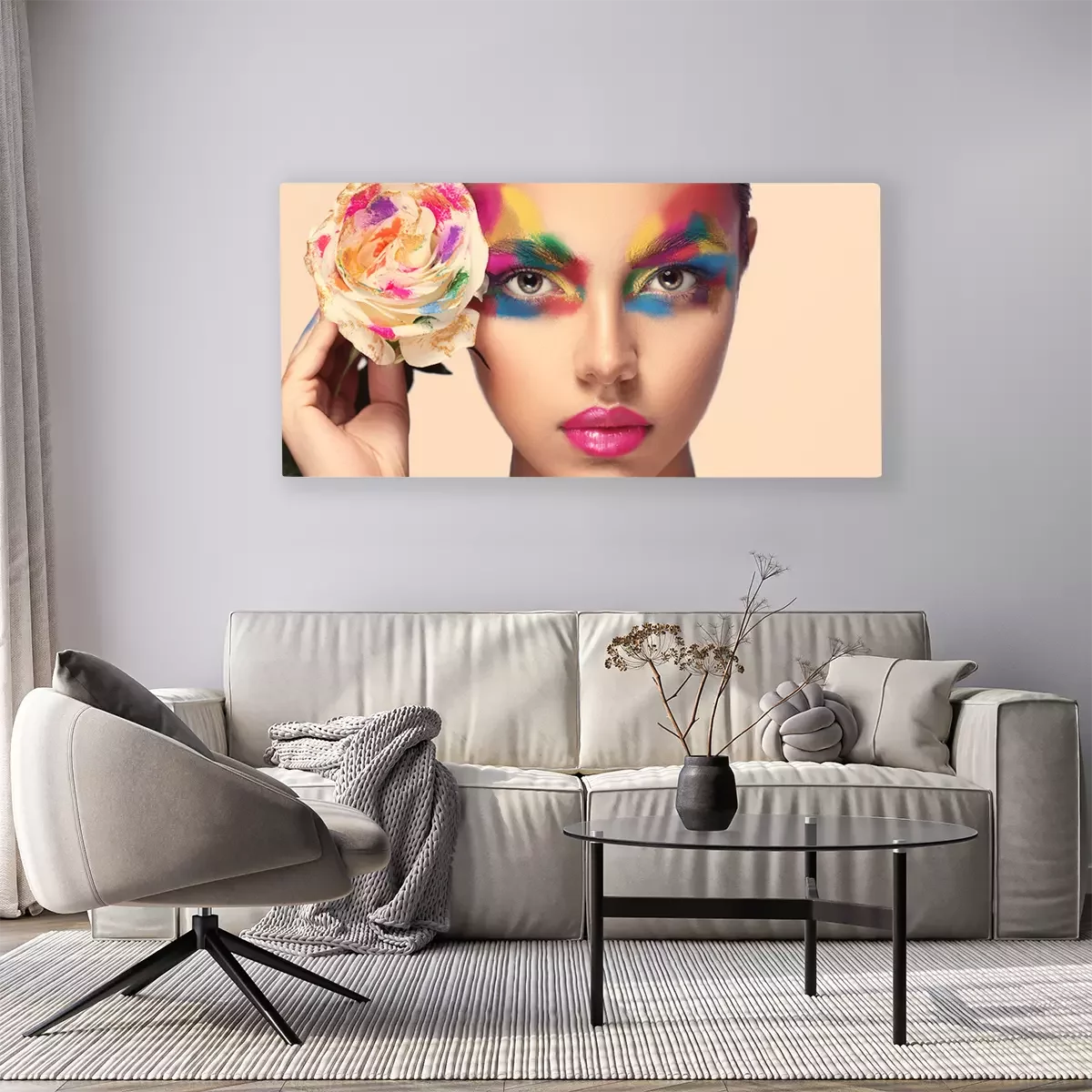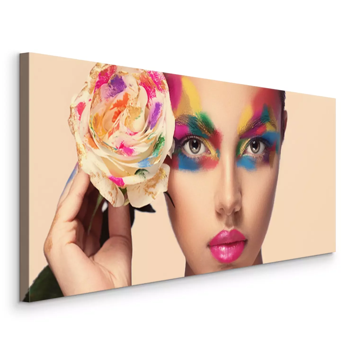 Canvas Beautiful girl model with multi-colored paints on her face. Woman with rose flower and bright color make-up. Cosmetics, beauty and makeup.  Spring and summer flowering  shopping
