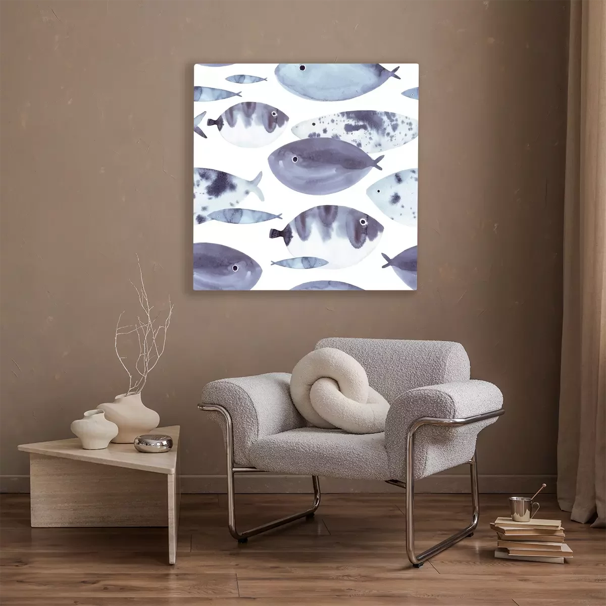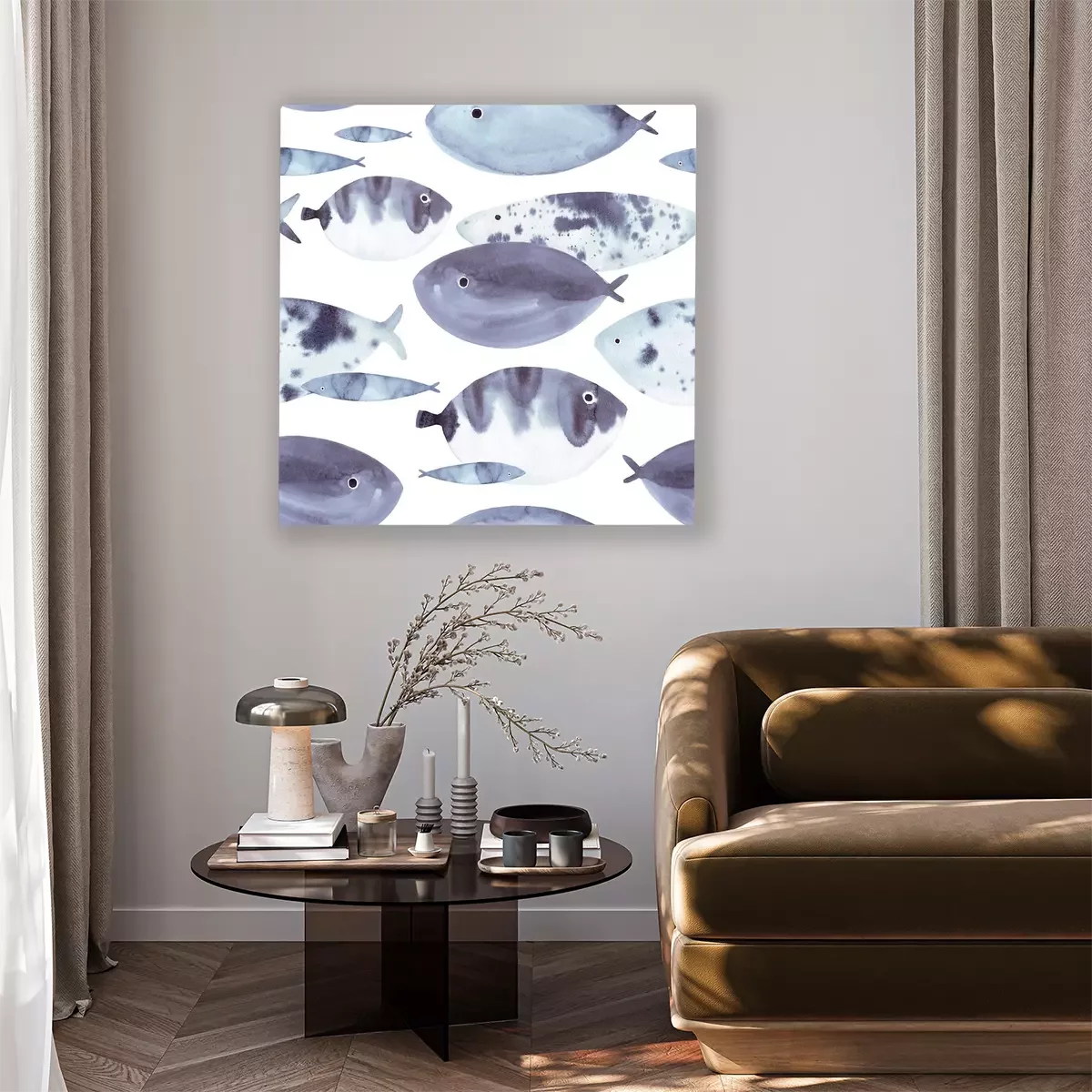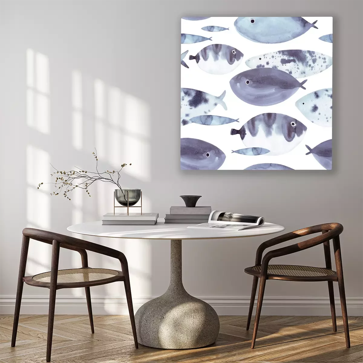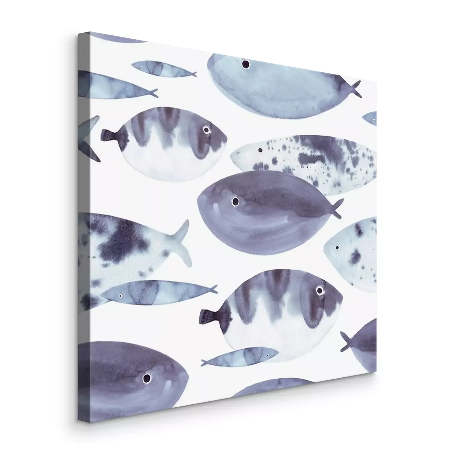 Canvas: Beautiful hand drawn watercolor seamless pattern with blue sea fish on the white background. Marine life texture.