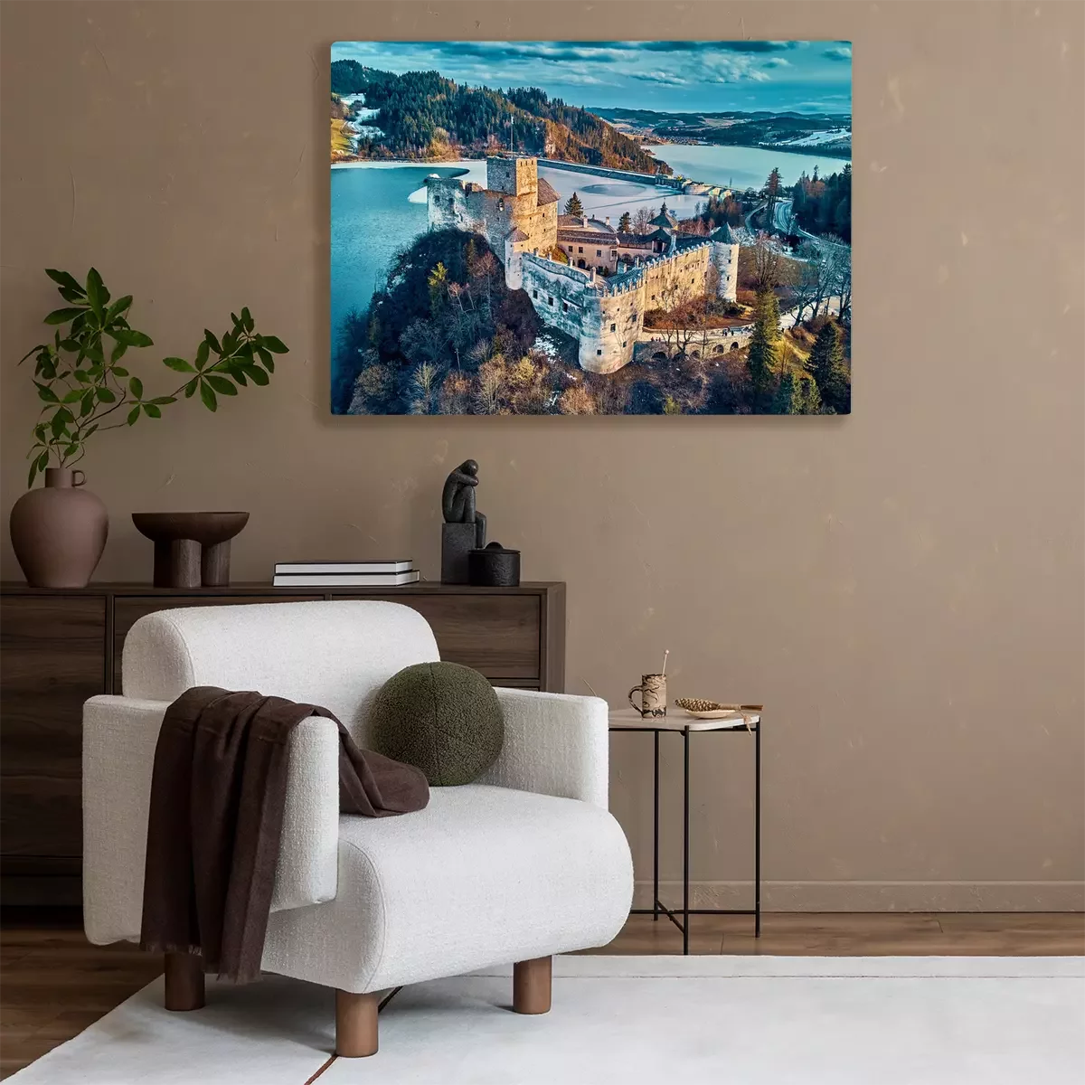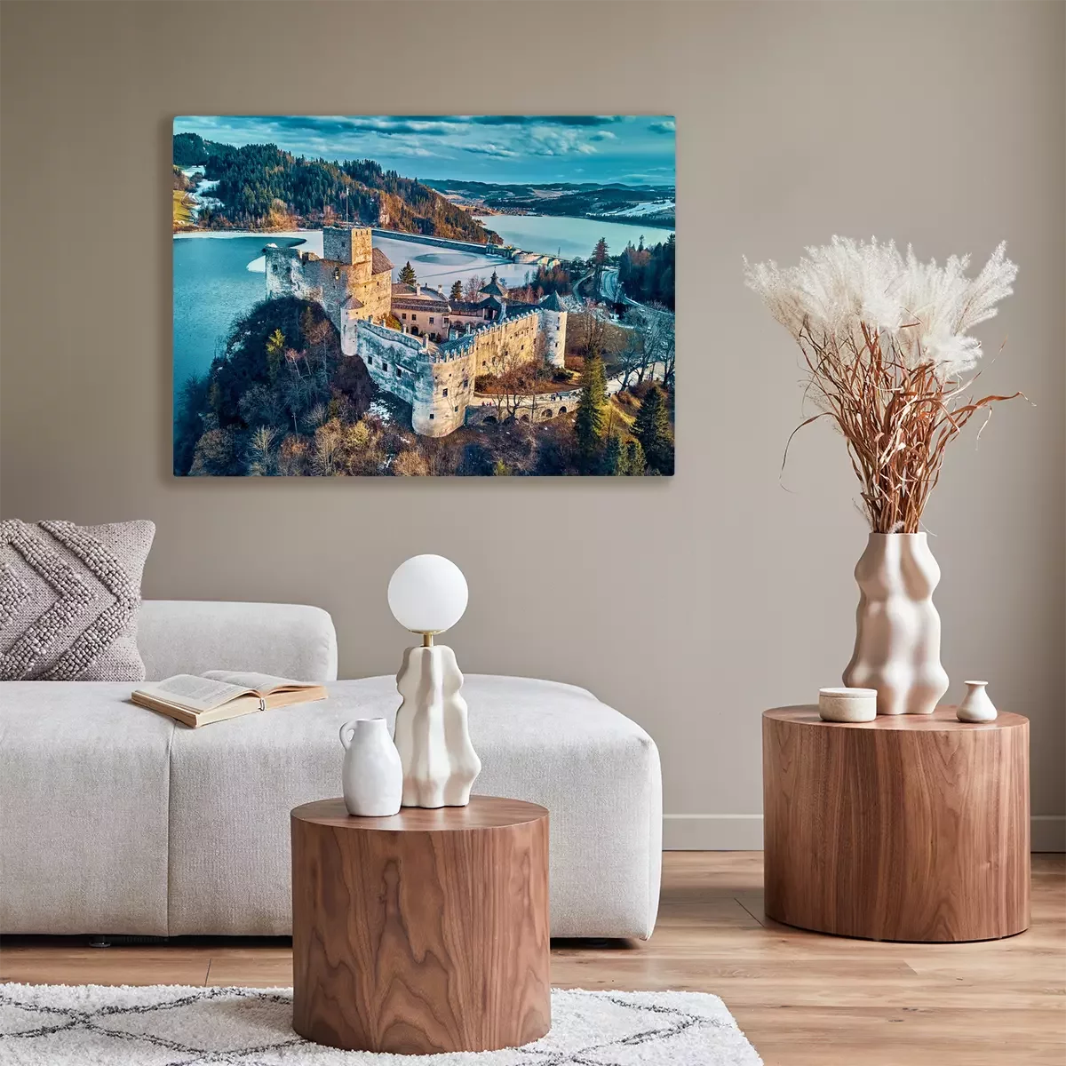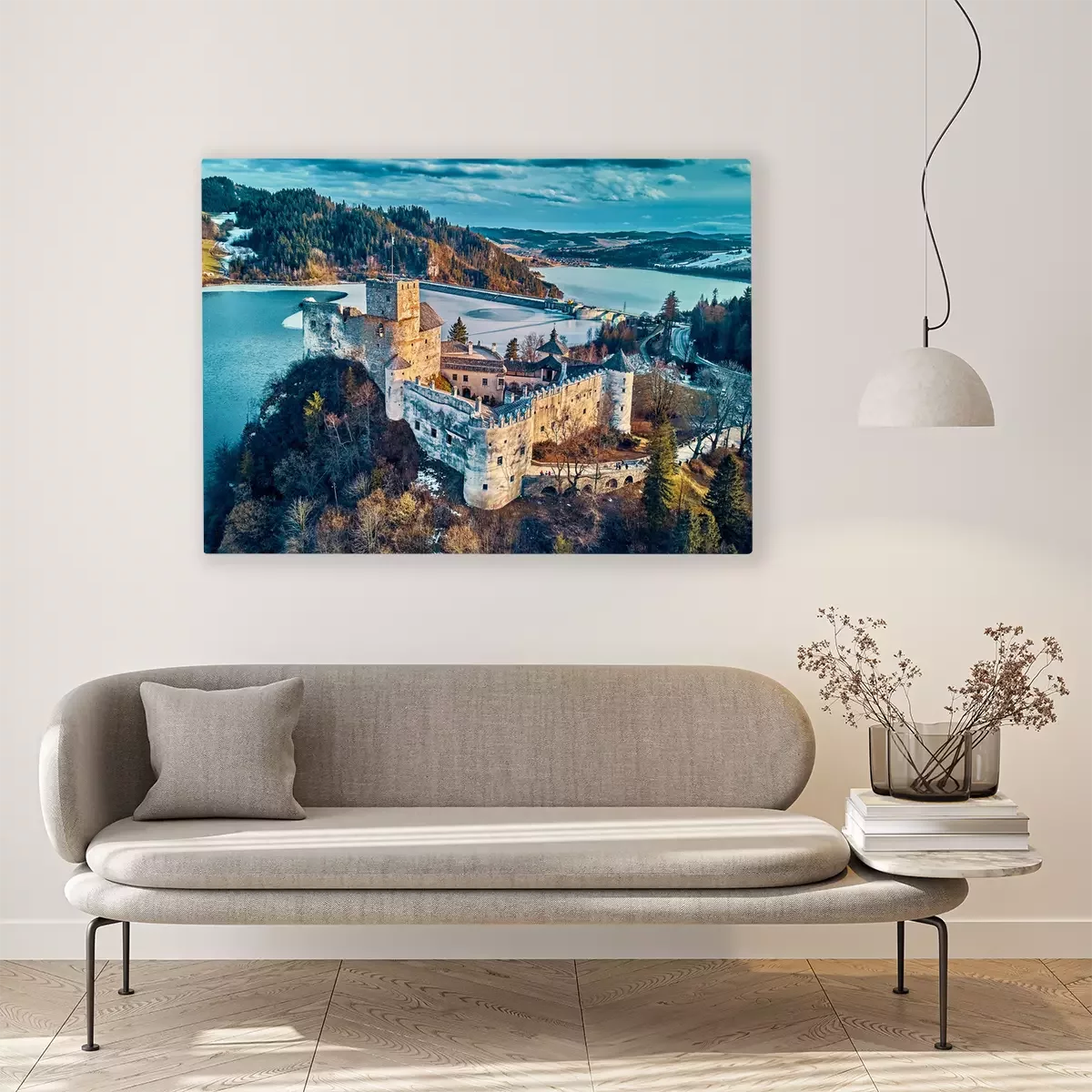 Canvas: Beautiful panoramic aerial drone view to the Niedzica Castle also known as Dunajec Castle, located in the southernmost part of Poland in Niedzica, Nowy Targ County, Dunajec River, Lake Czorsztyn