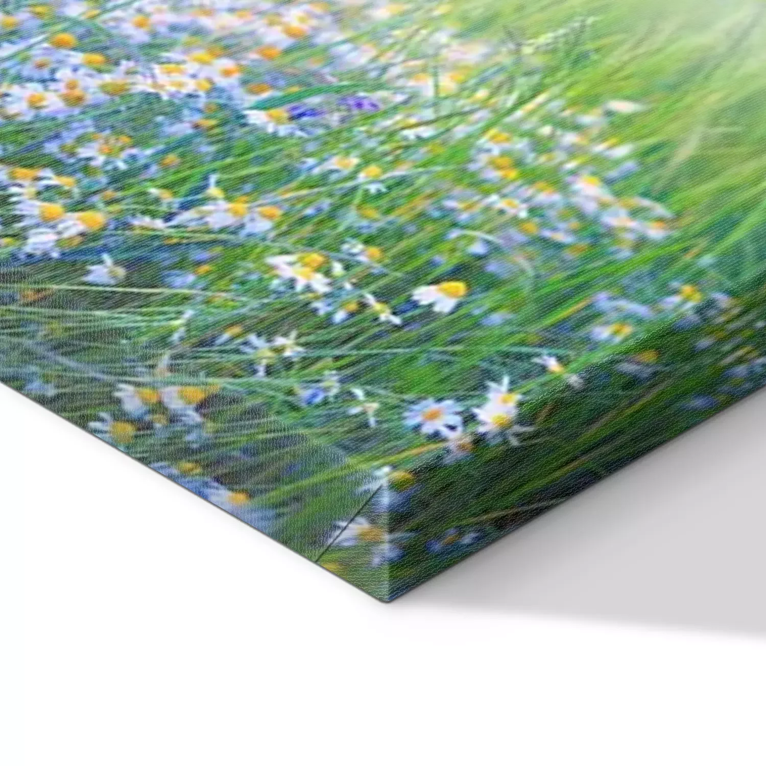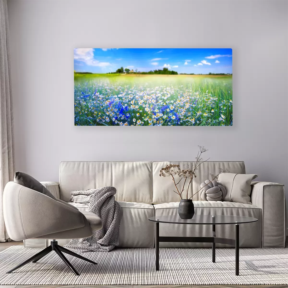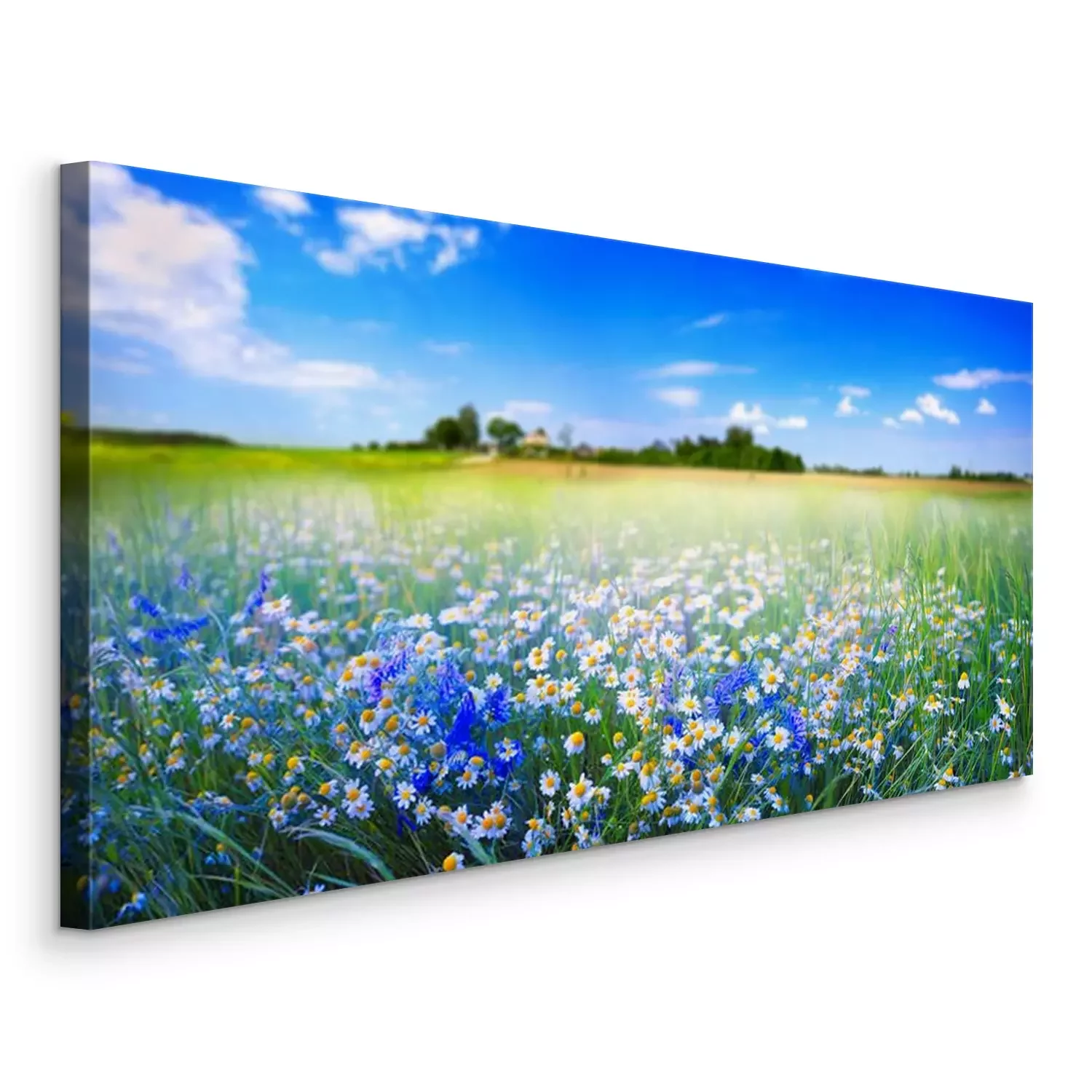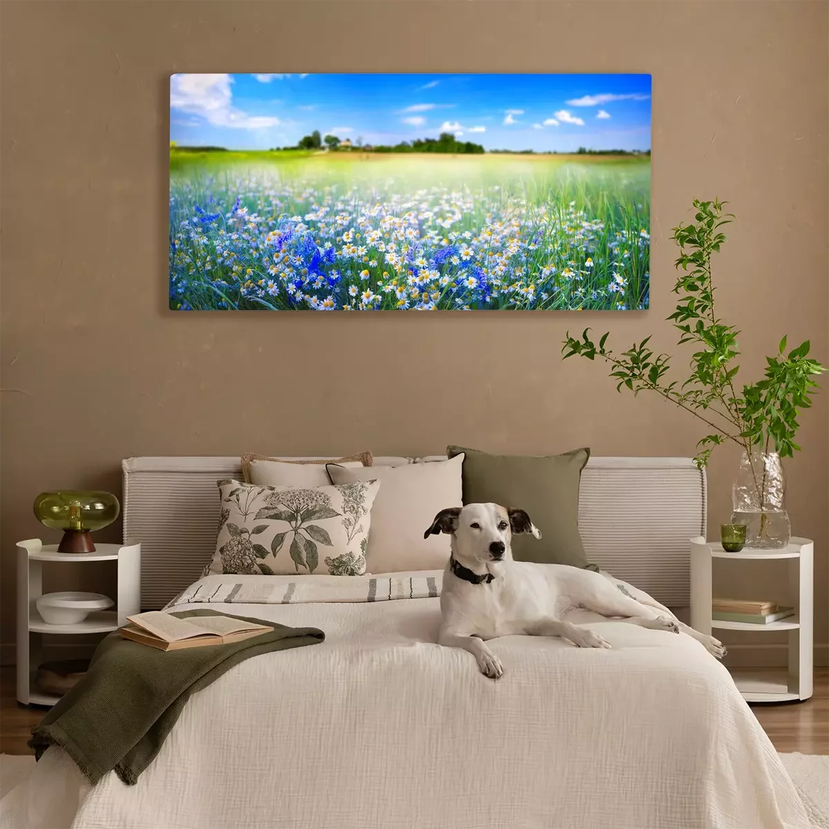 Canvas: Beautiful pastoral natural spring summer landscape with daisies and blue bells in field against blue sky with white clouds on sunny day. Chamomile in meadow in nature, panoramic view.