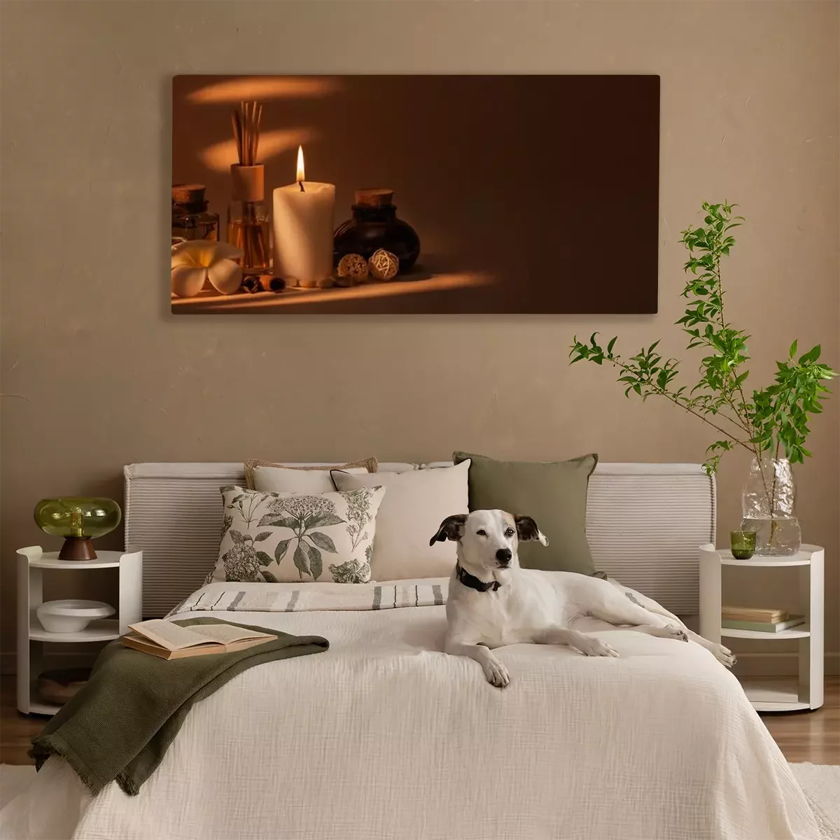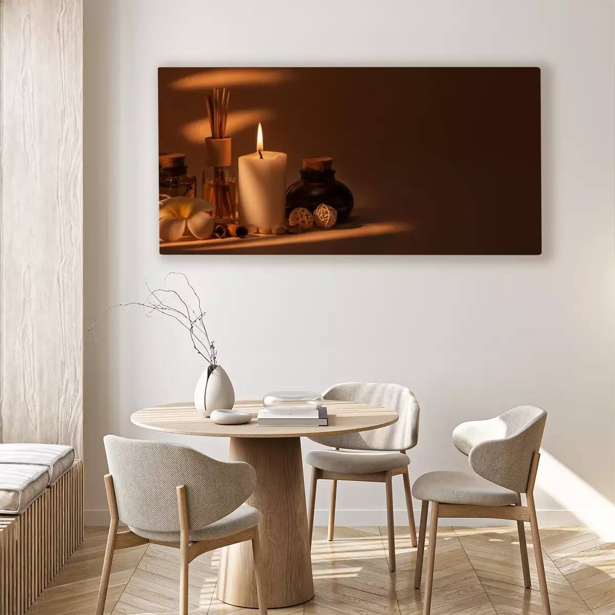 Canvas: Beautiful spa composition with candles, frangipani flower, oil flasks and other decor elements.