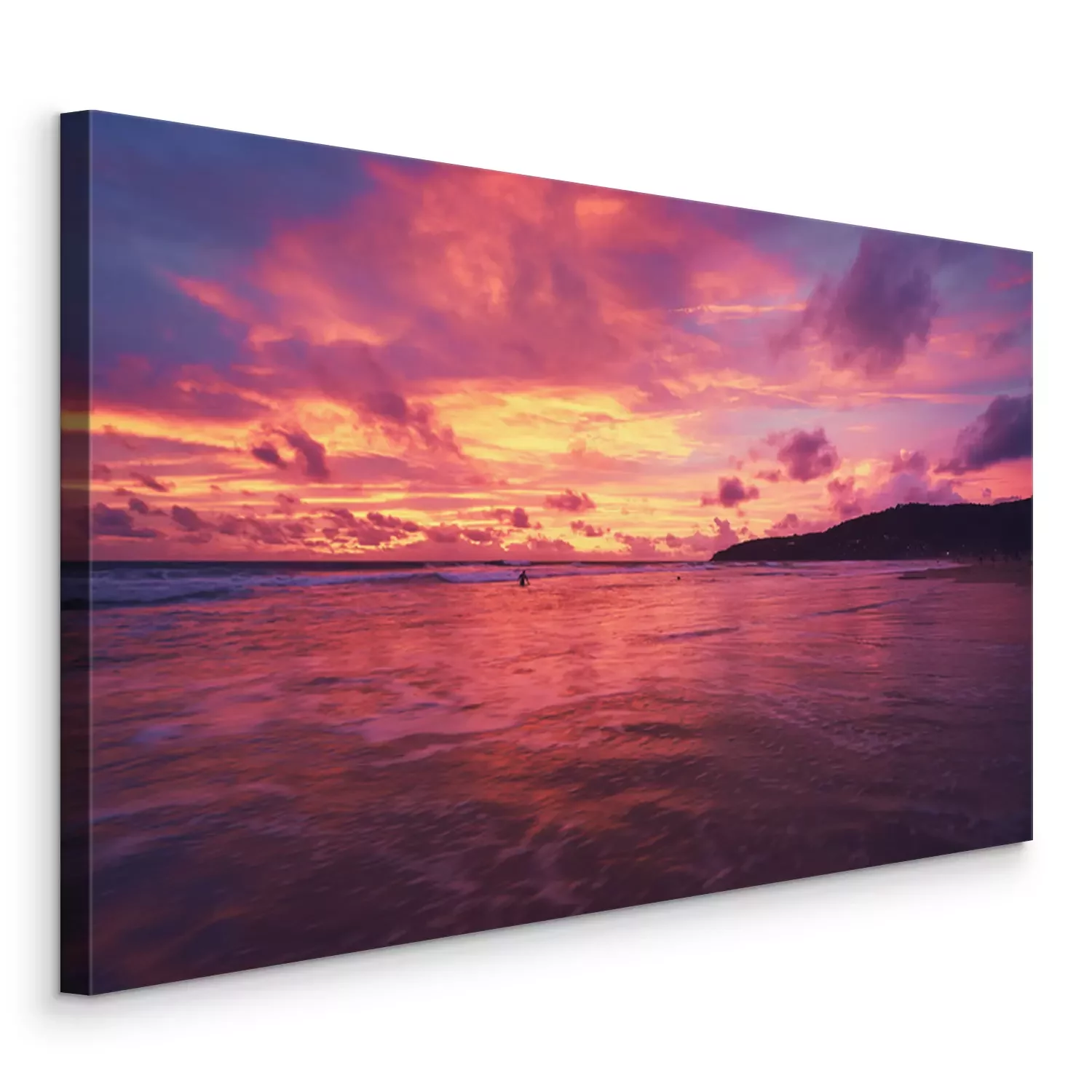 Canvas Beautiful sunset on ocean beach. Sky is reflecting at water.