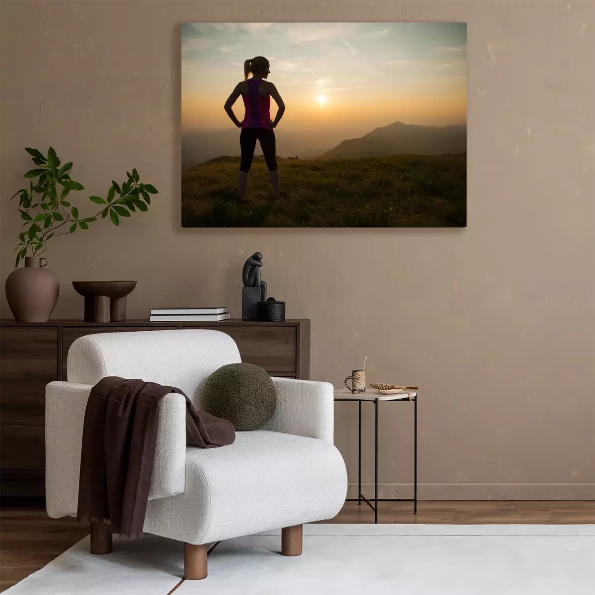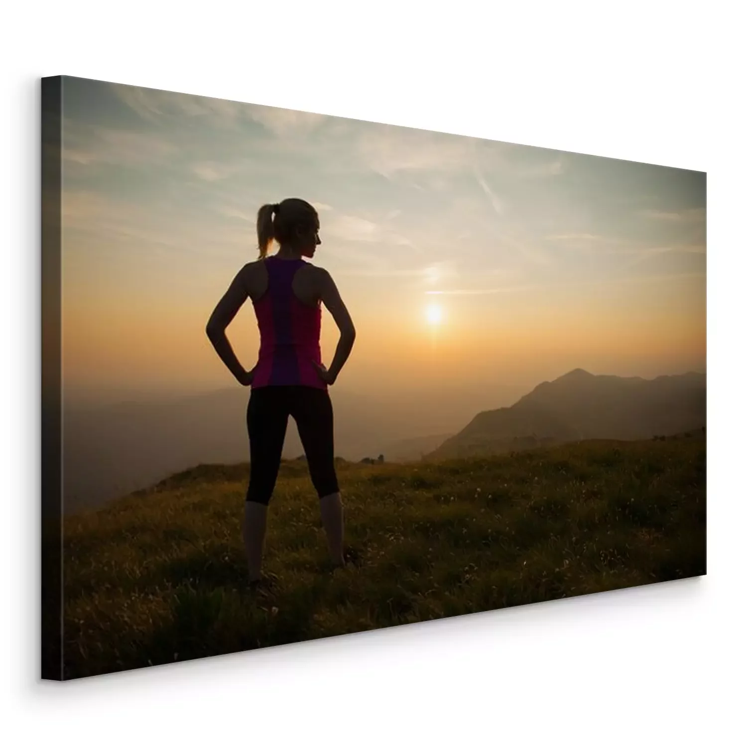 Canvas: beautiful young woman runns cross country on a mountian path at