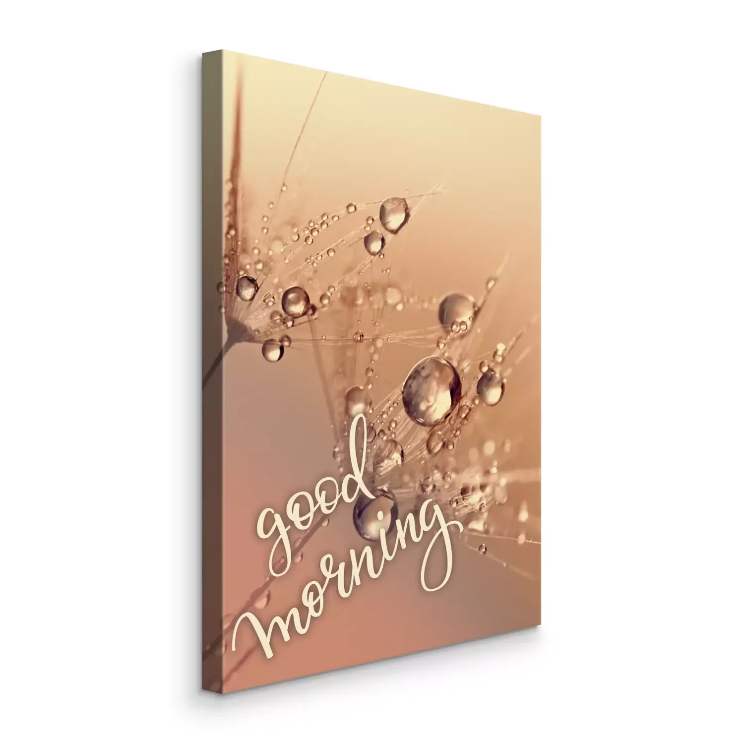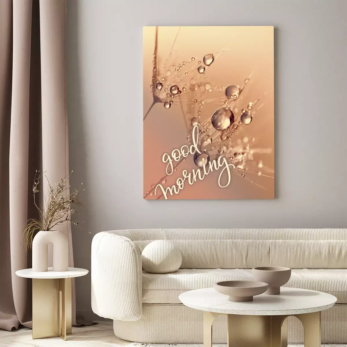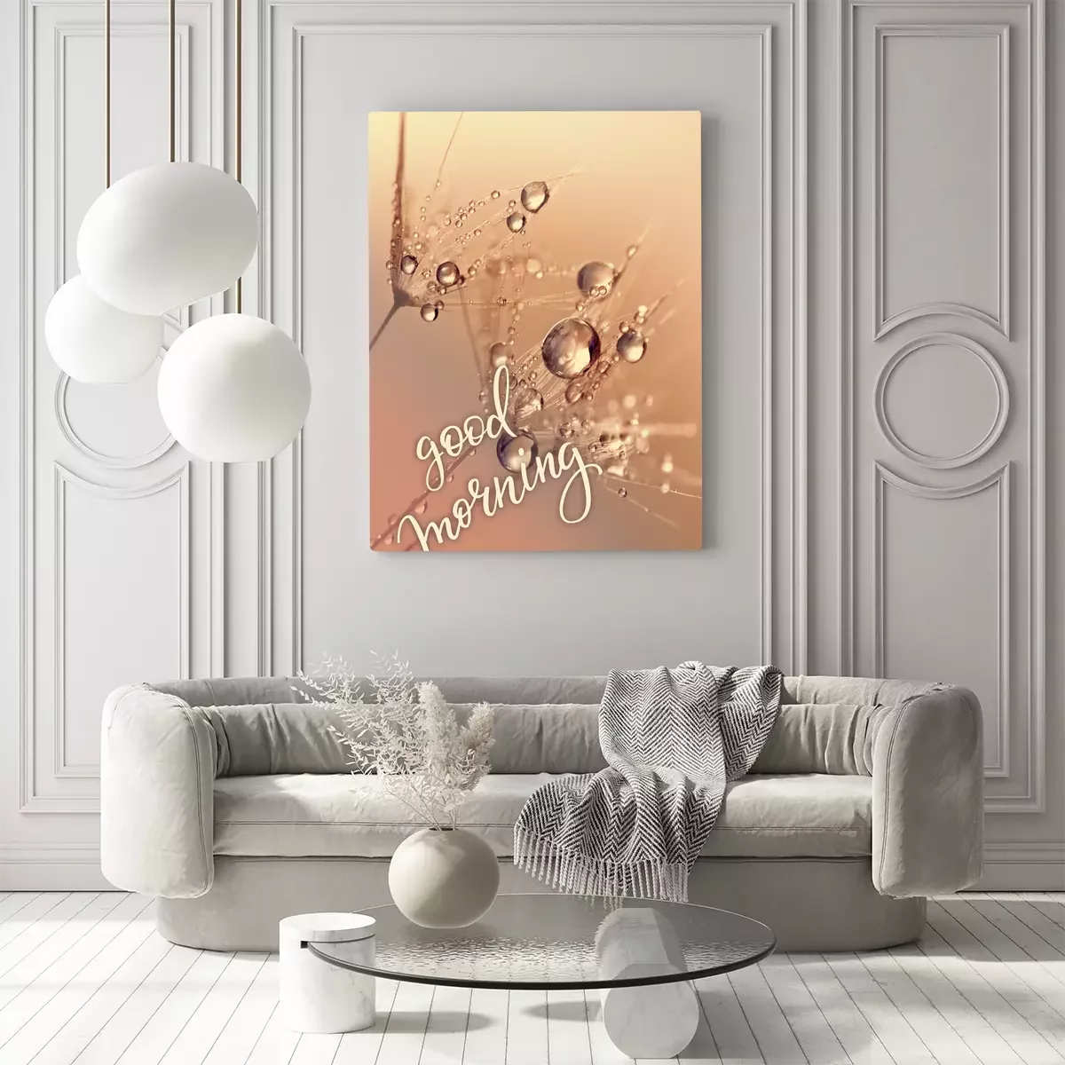 Beige paardenbloemen met dauw en de woorden goedemorgen