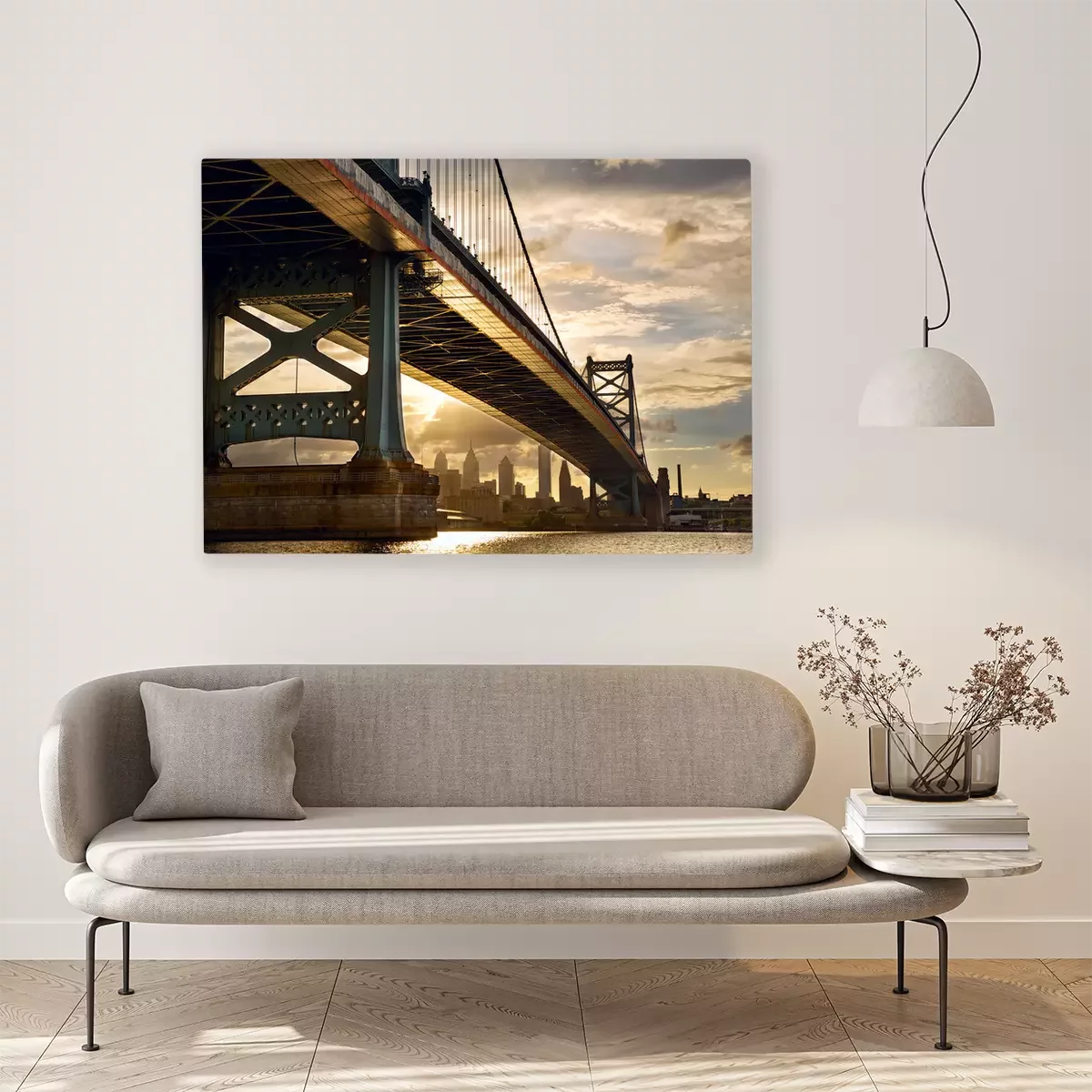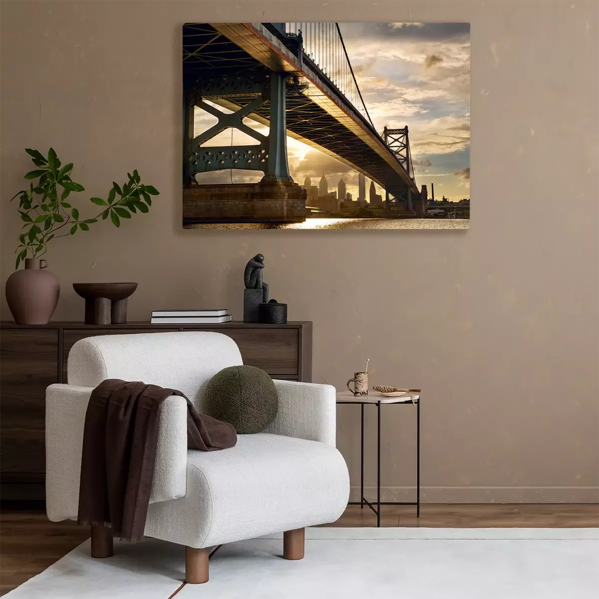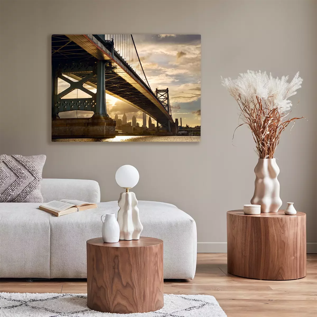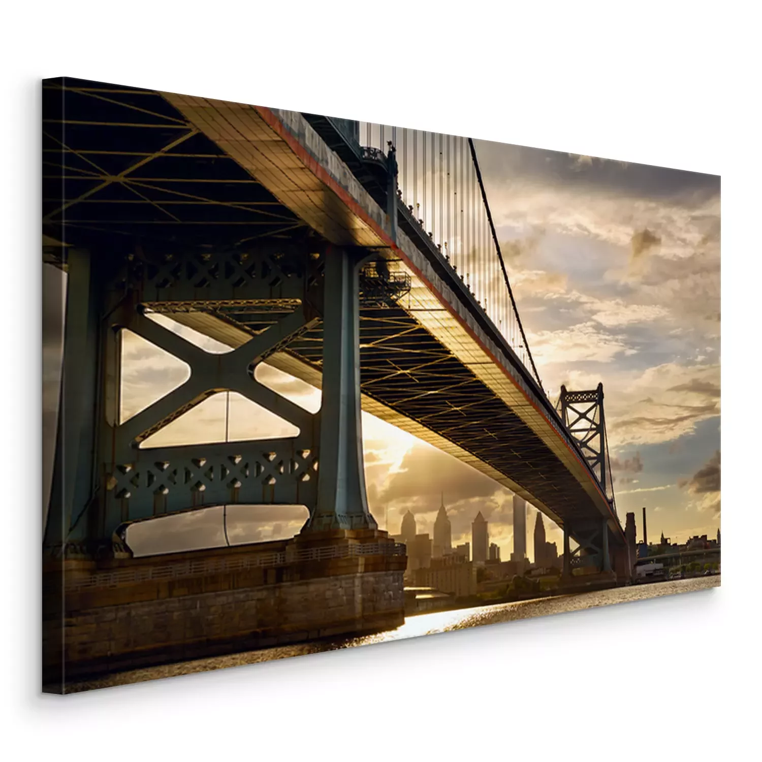 Canvas: Ben Franklin Bridge boven Philadelphia skyline bij zonsondergang, US