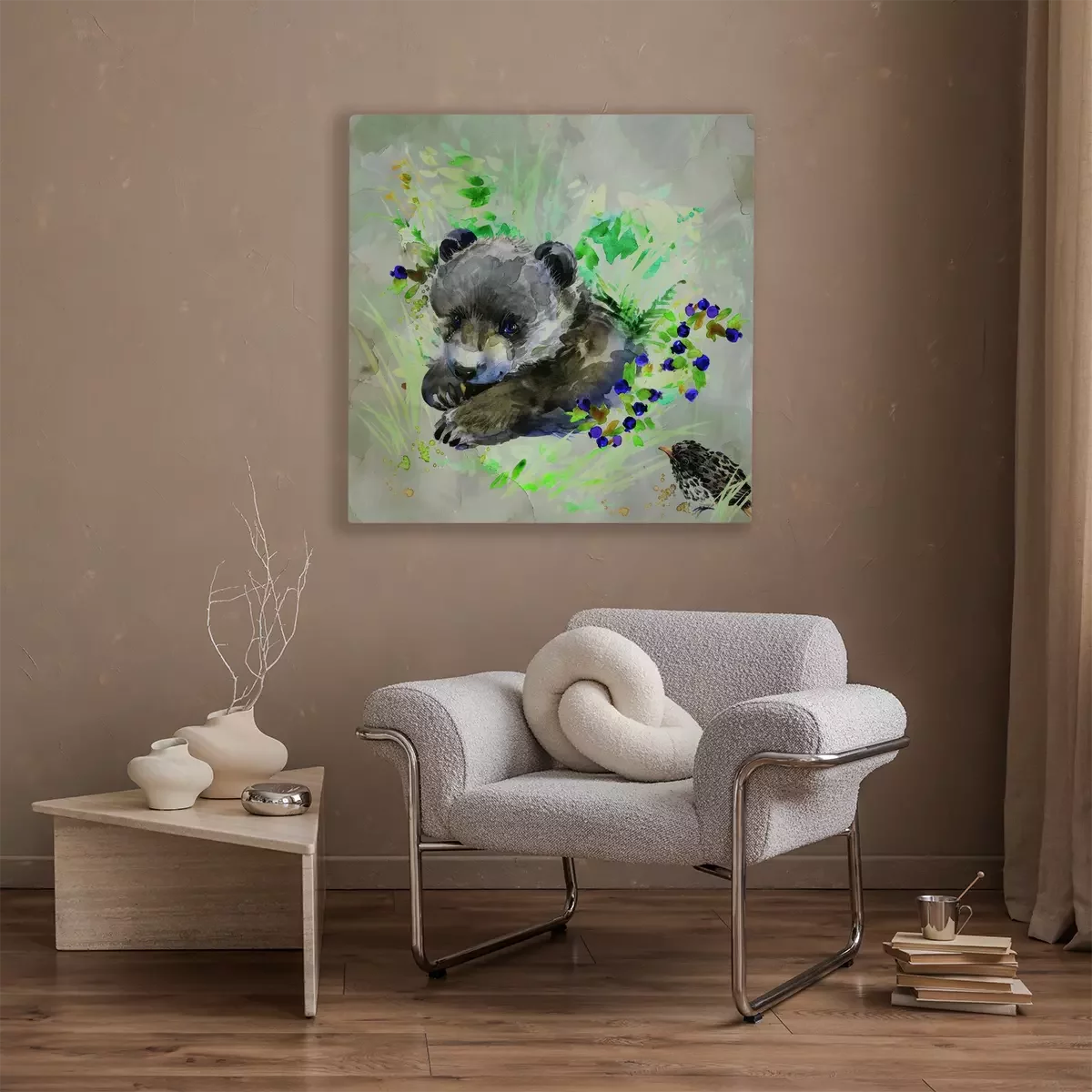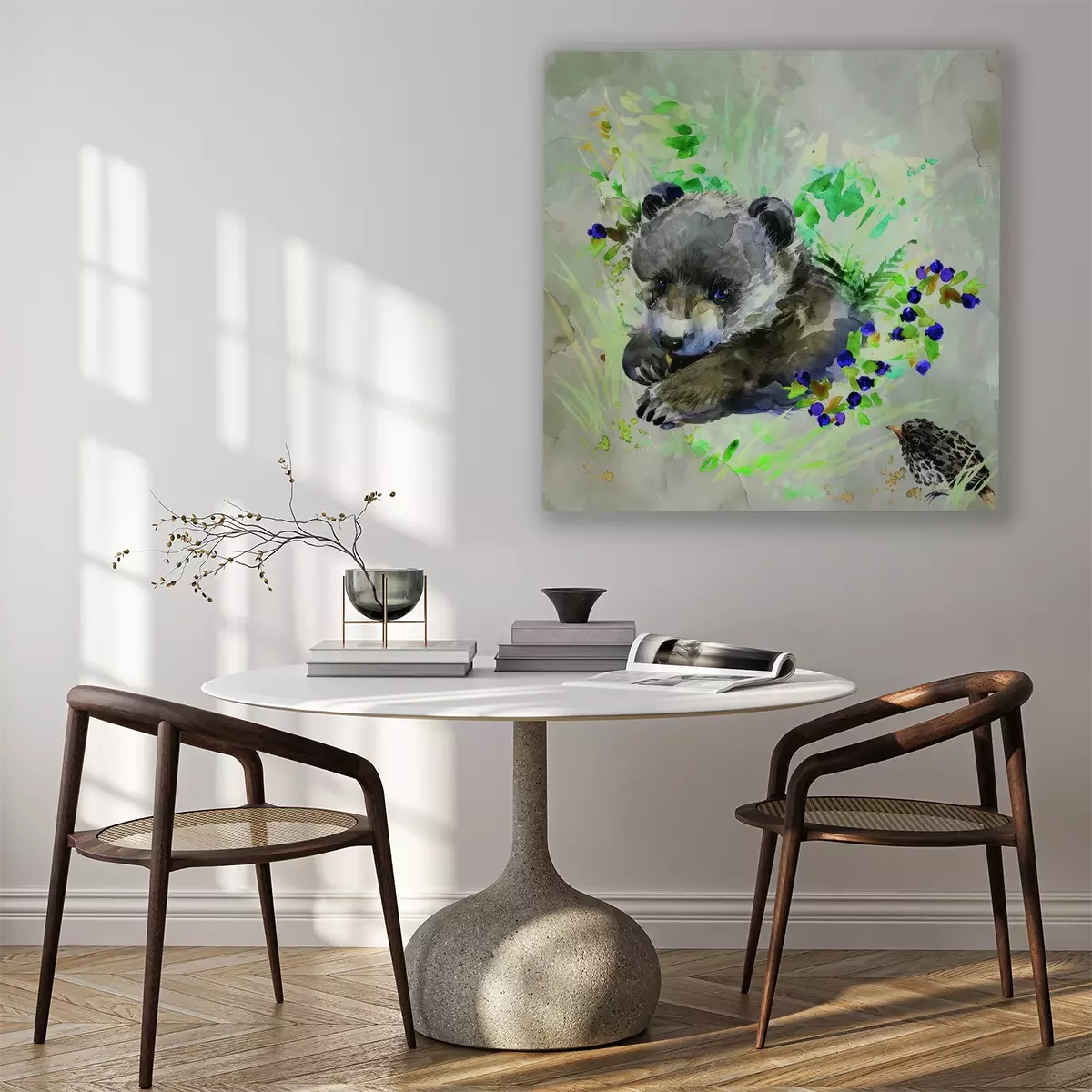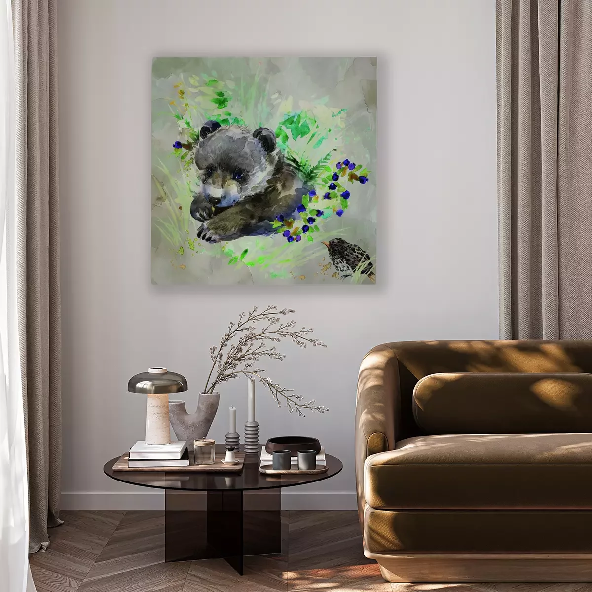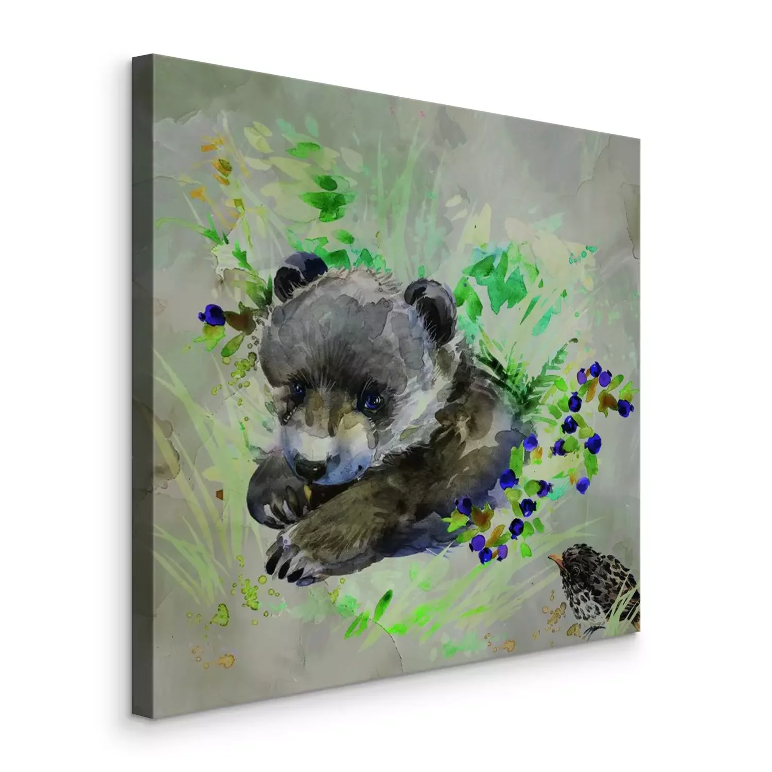 Beren met een vogel in een subtiele aquarel