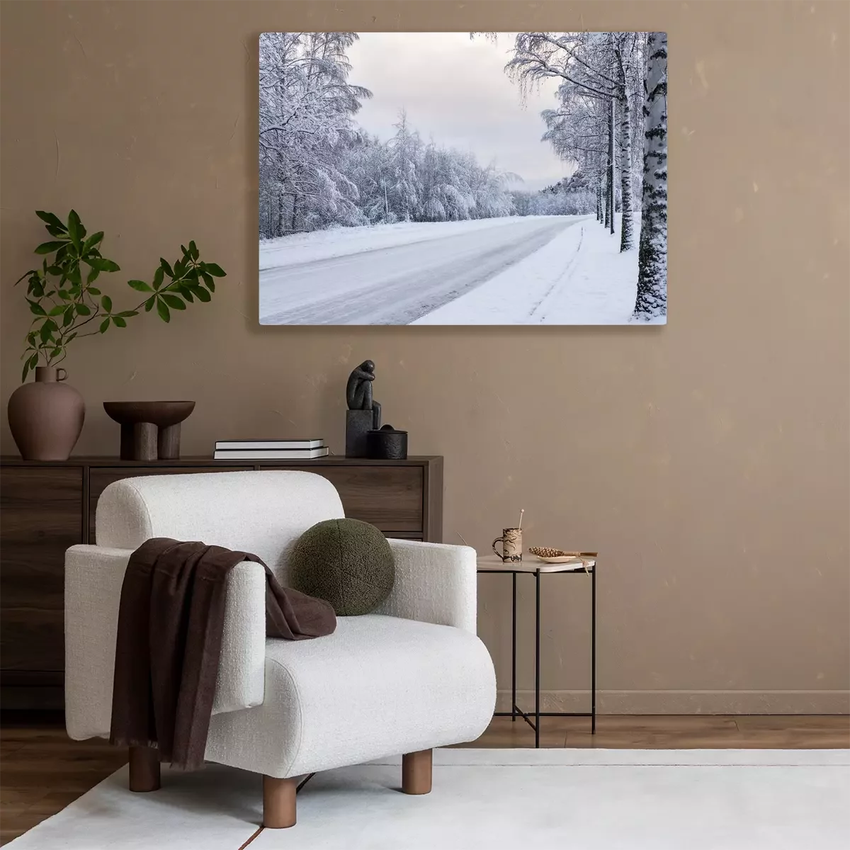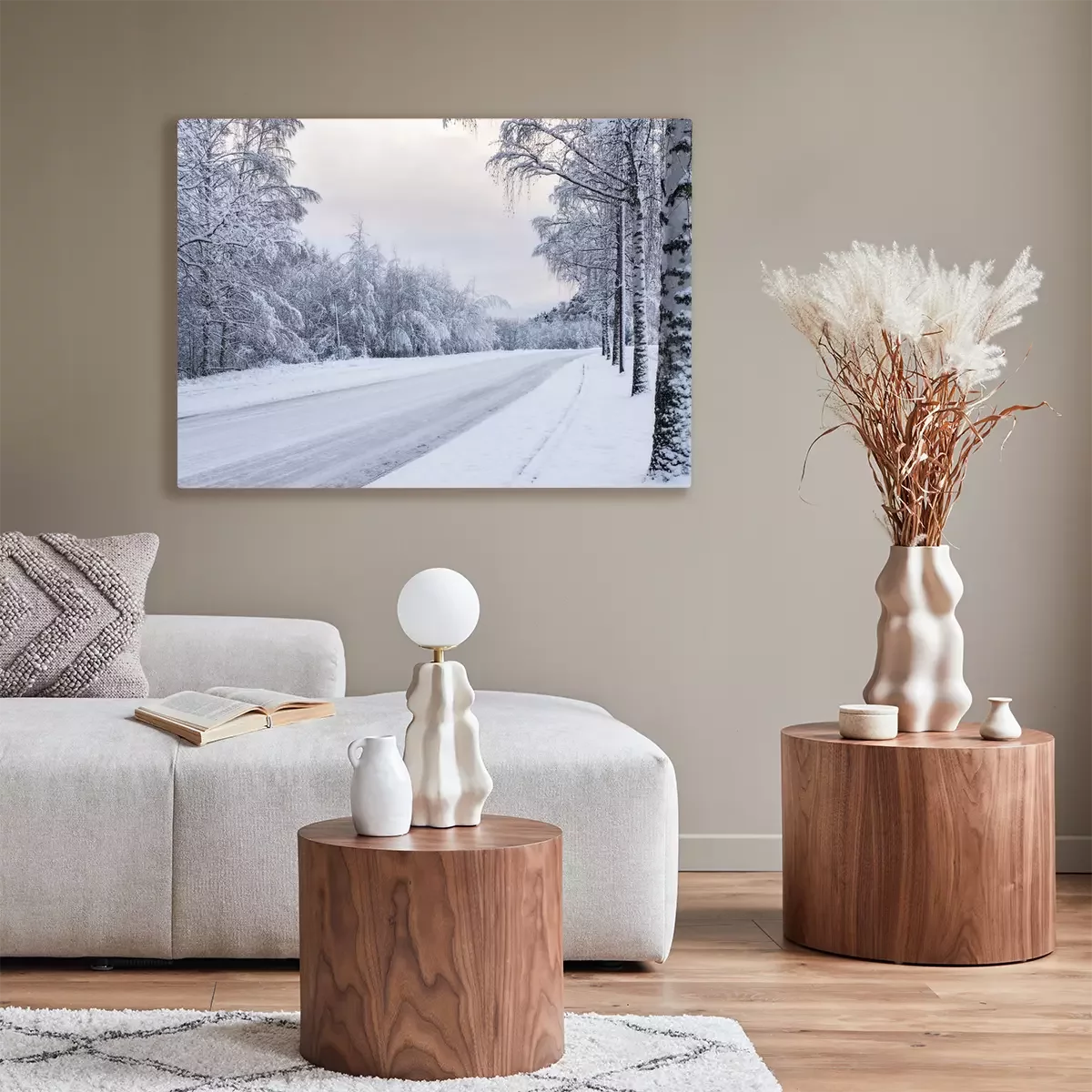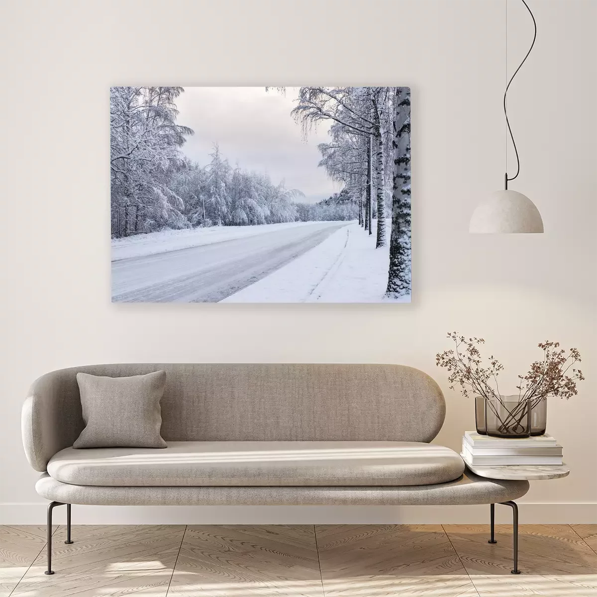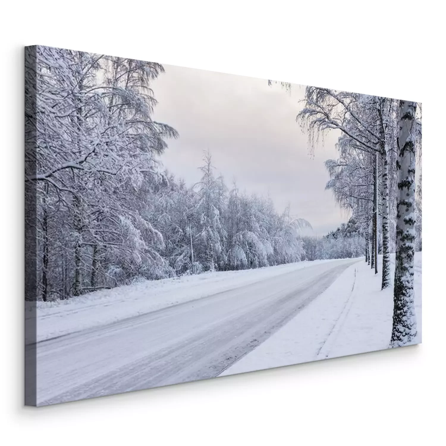 Canvas: Berken langs de weg bedekt met sneeuw