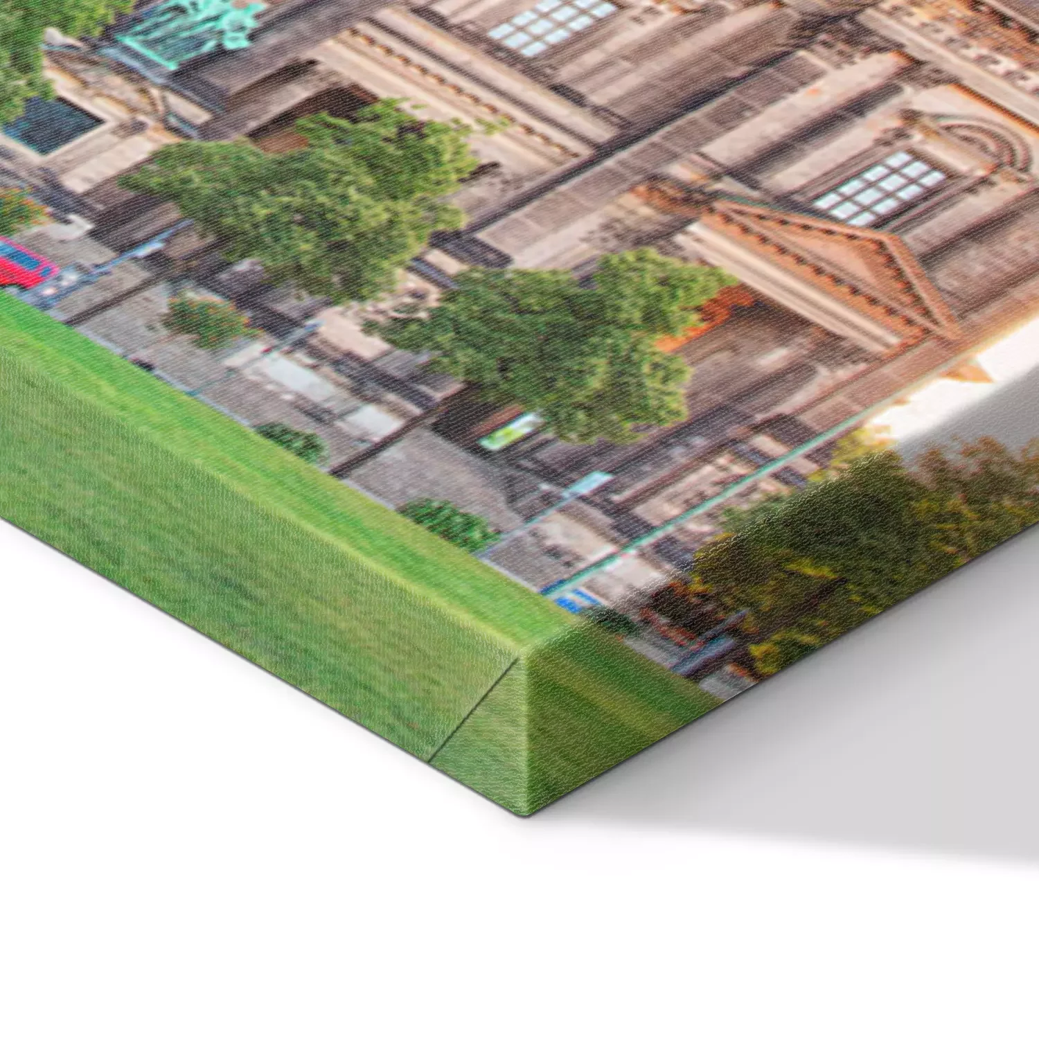 De print wordt aangebracht op hoogwaardig canvas dat op een schildersweefgetouw (spieraam) wordt gespannen. Omdat de print de zijranden bedekt, hoeft het ontwerp niet met een extra kader te worden omlijst. Wij raden ook composities aan die uit meerdere foto's bestaan en zo een coherente compositie vormen.