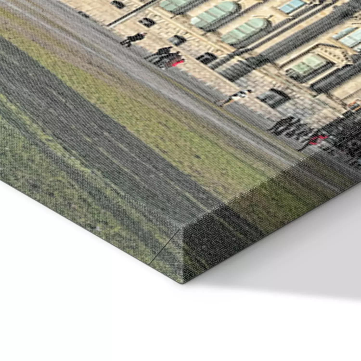 De print wordt aangebracht op hoogwaardig canvas dat op een schildersweefgetouw (spieraam) wordt gespannen. Omdat de print de zijranden bedekt, hoeft het ontwerp niet met een extra kader te worden omlijst. Wij raden ook composities aan die uit meerdere foto's bestaan en zo een coherente compositie vormen.