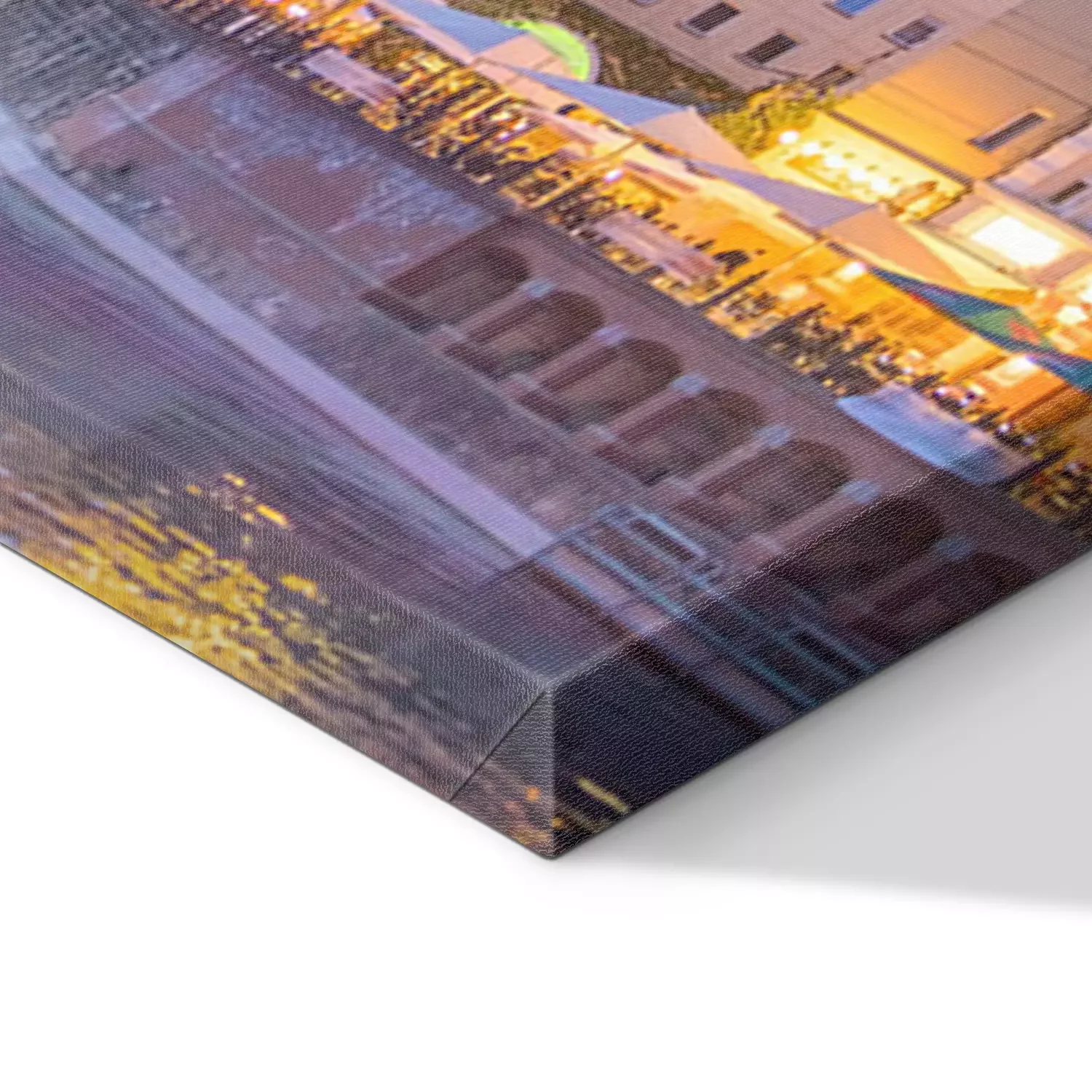 De print wordt aangebracht op hoogwaardig canvas dat op een schildersweefgetouw (spieraam) wordt gespannen. Omdat de print de zijranden bedekt, hoeft het ontwerp niet met een extra kader te worden omlijst. Wij raden ook composities aan die uit meerdere foto's bestaan en zo een coherente compositie vormen.