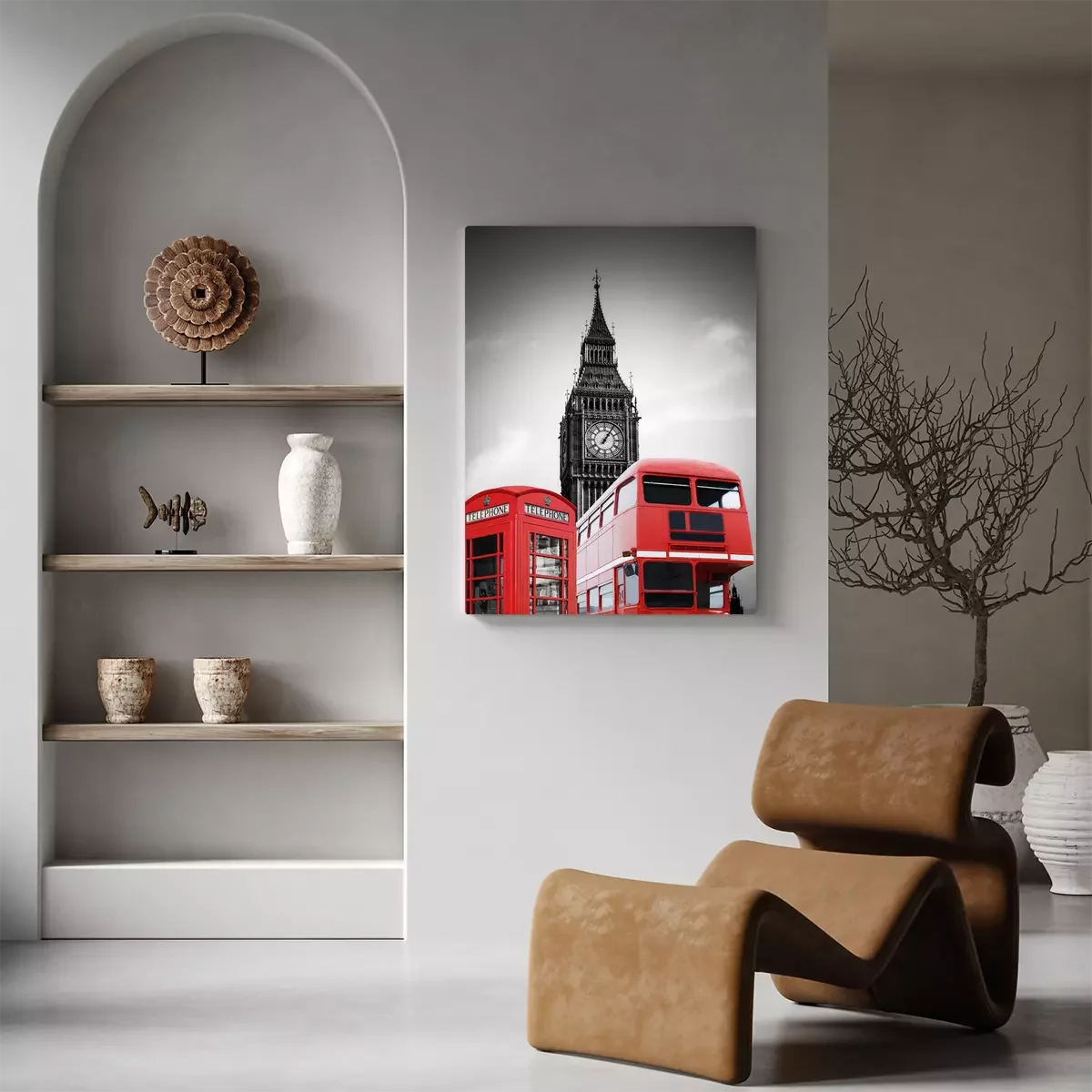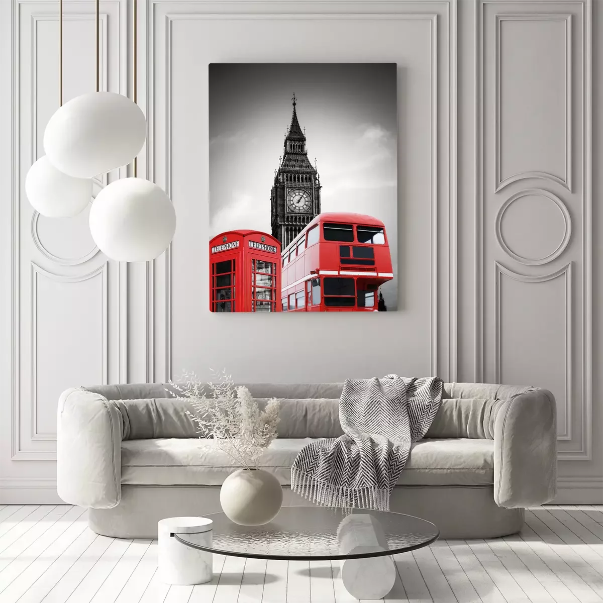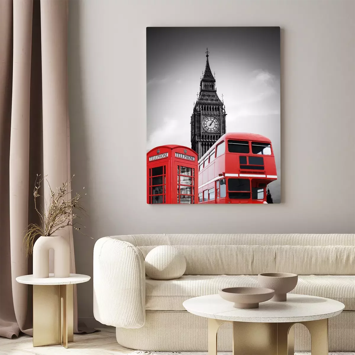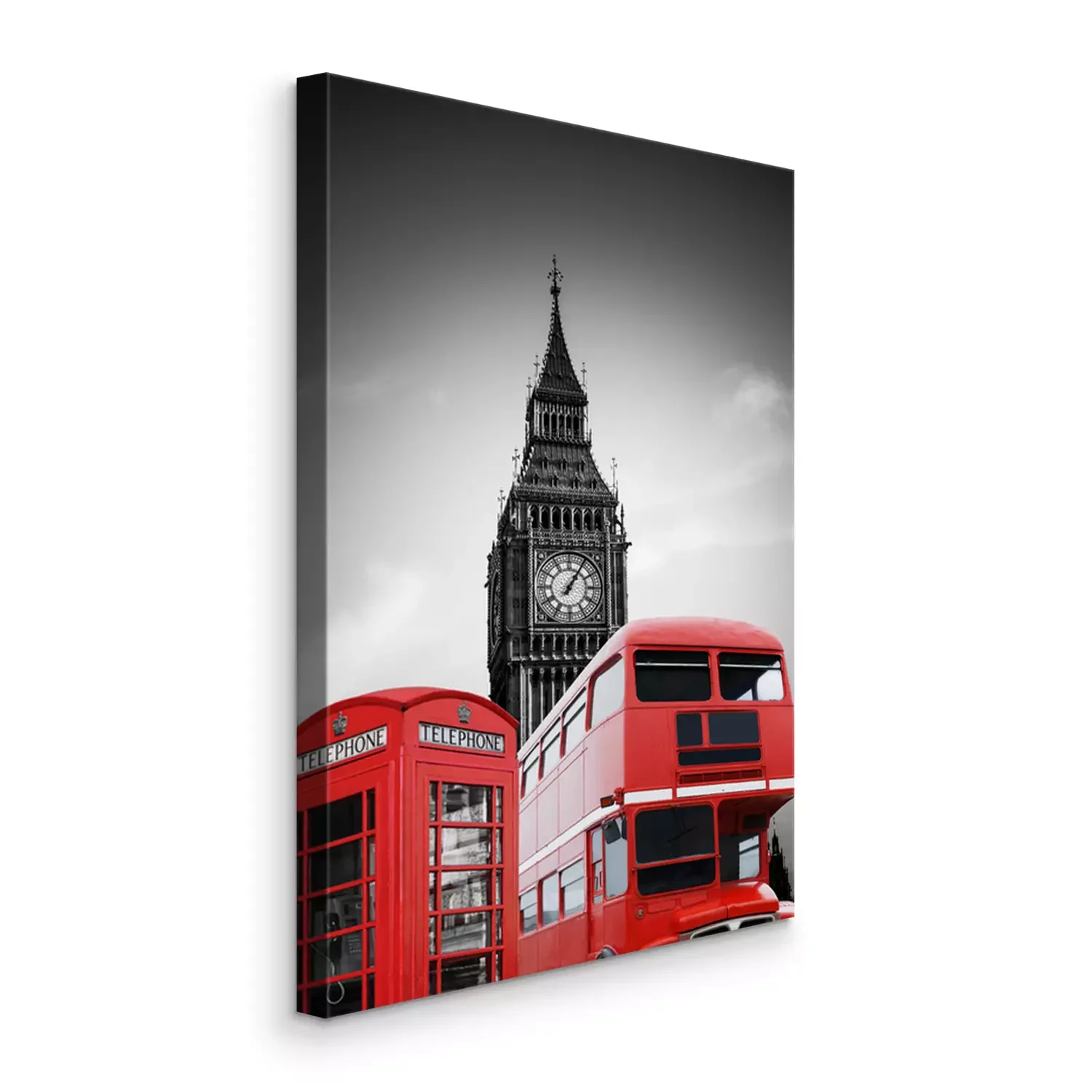 Canvas: Big Ben in Londen mit roter Telefonzelle und Bus