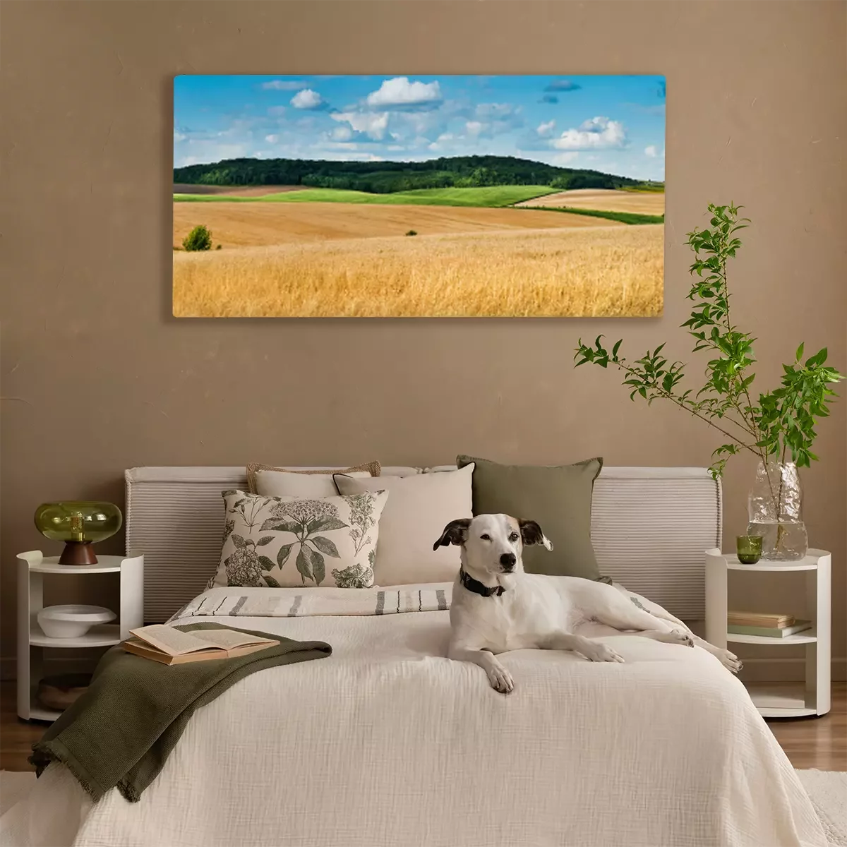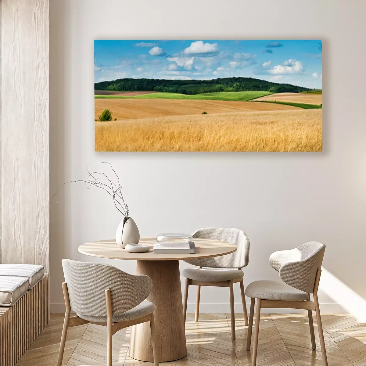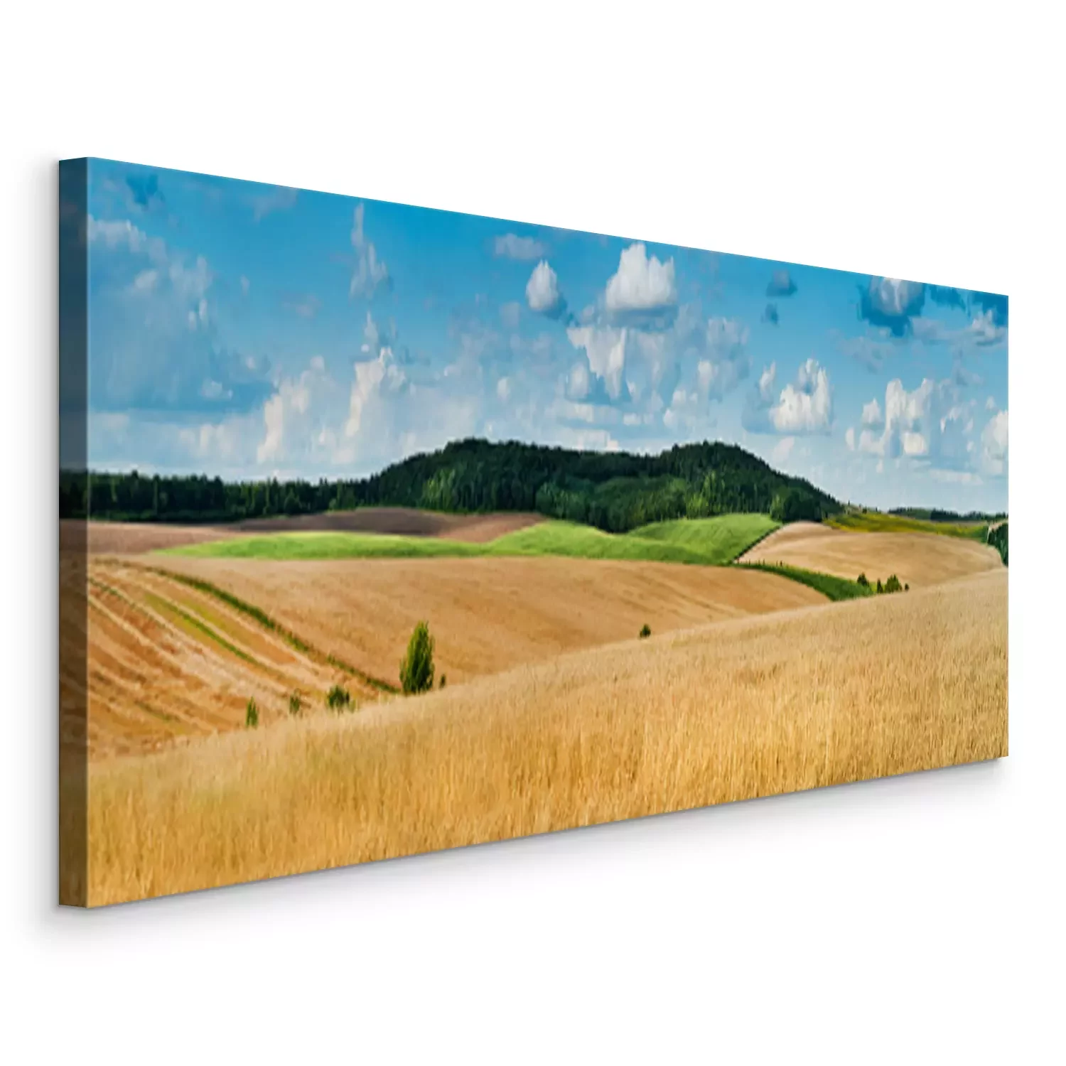 Canvas: big panoramic view of landscape of wheat field, ears and yellow and green hills