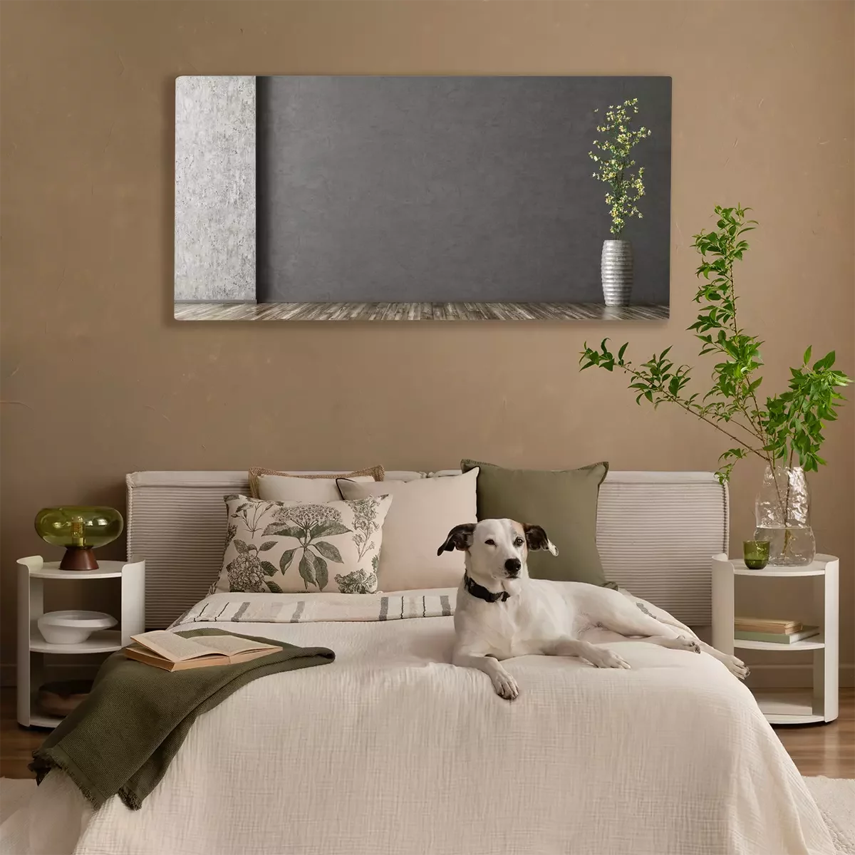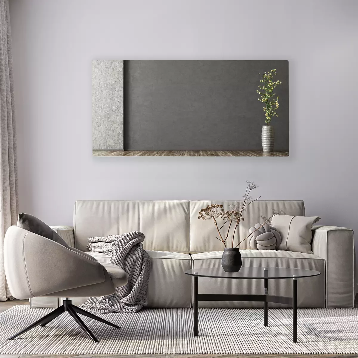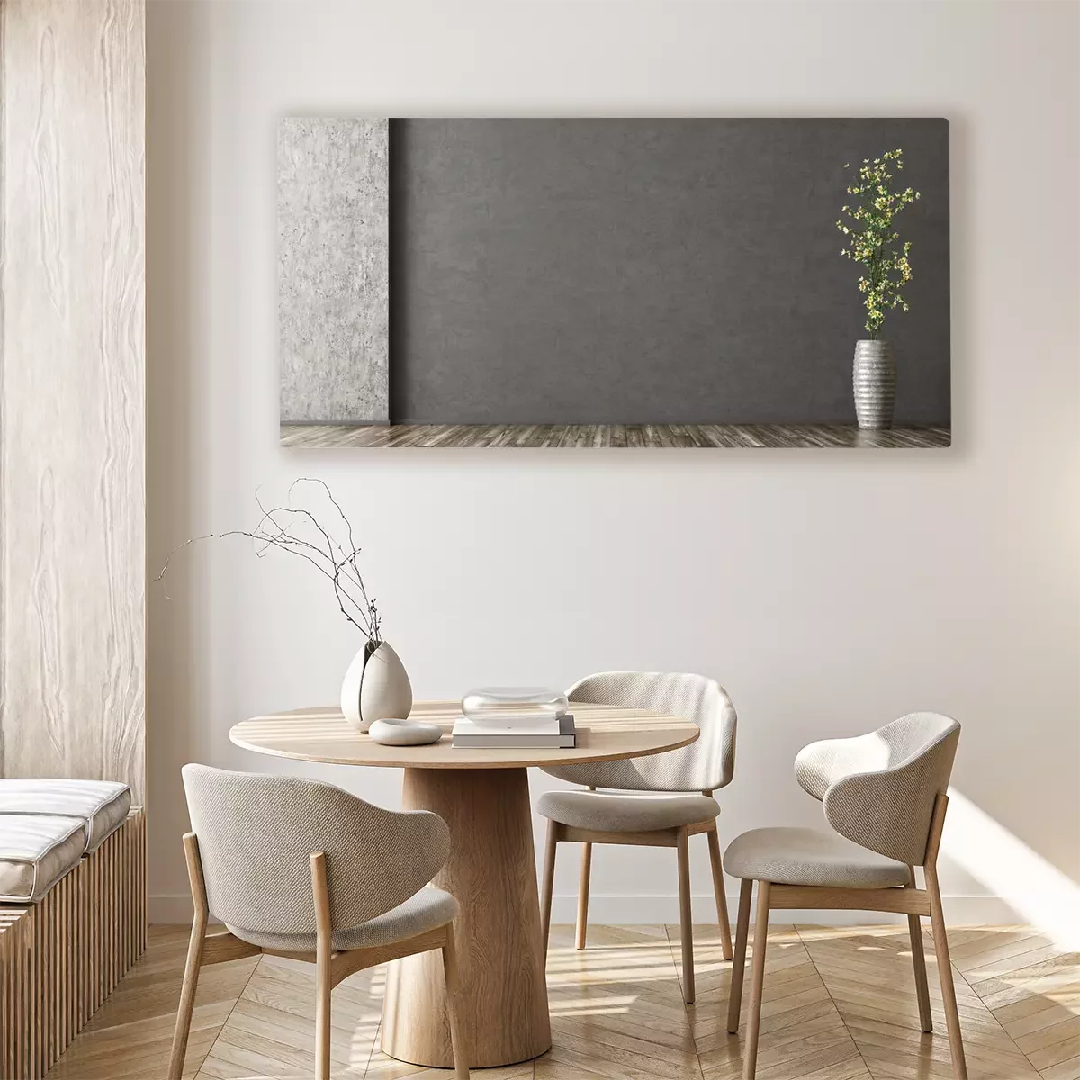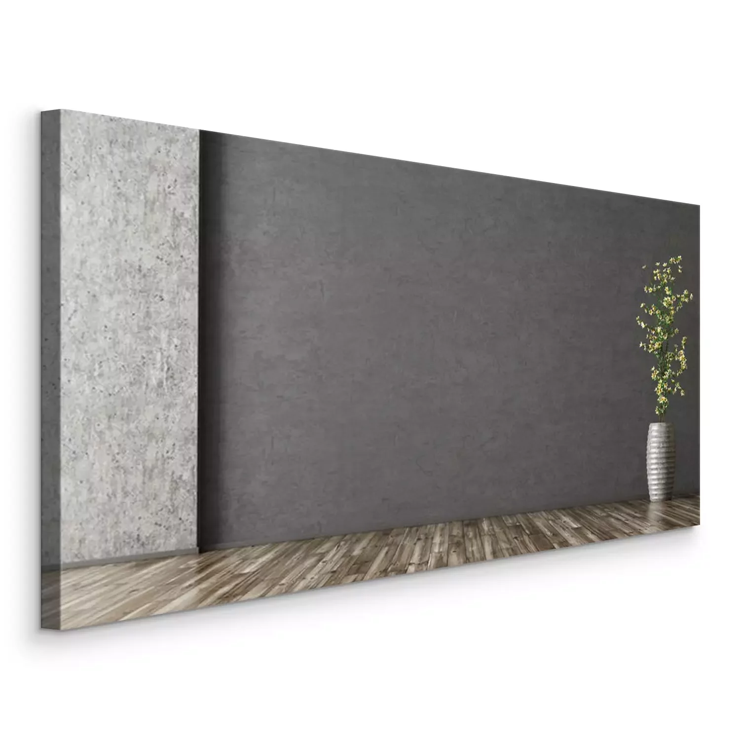 Canvas: Binnenlandse achtergrond van ruimte met gipspleistermuur en vaas met tak het 3d teruggeven