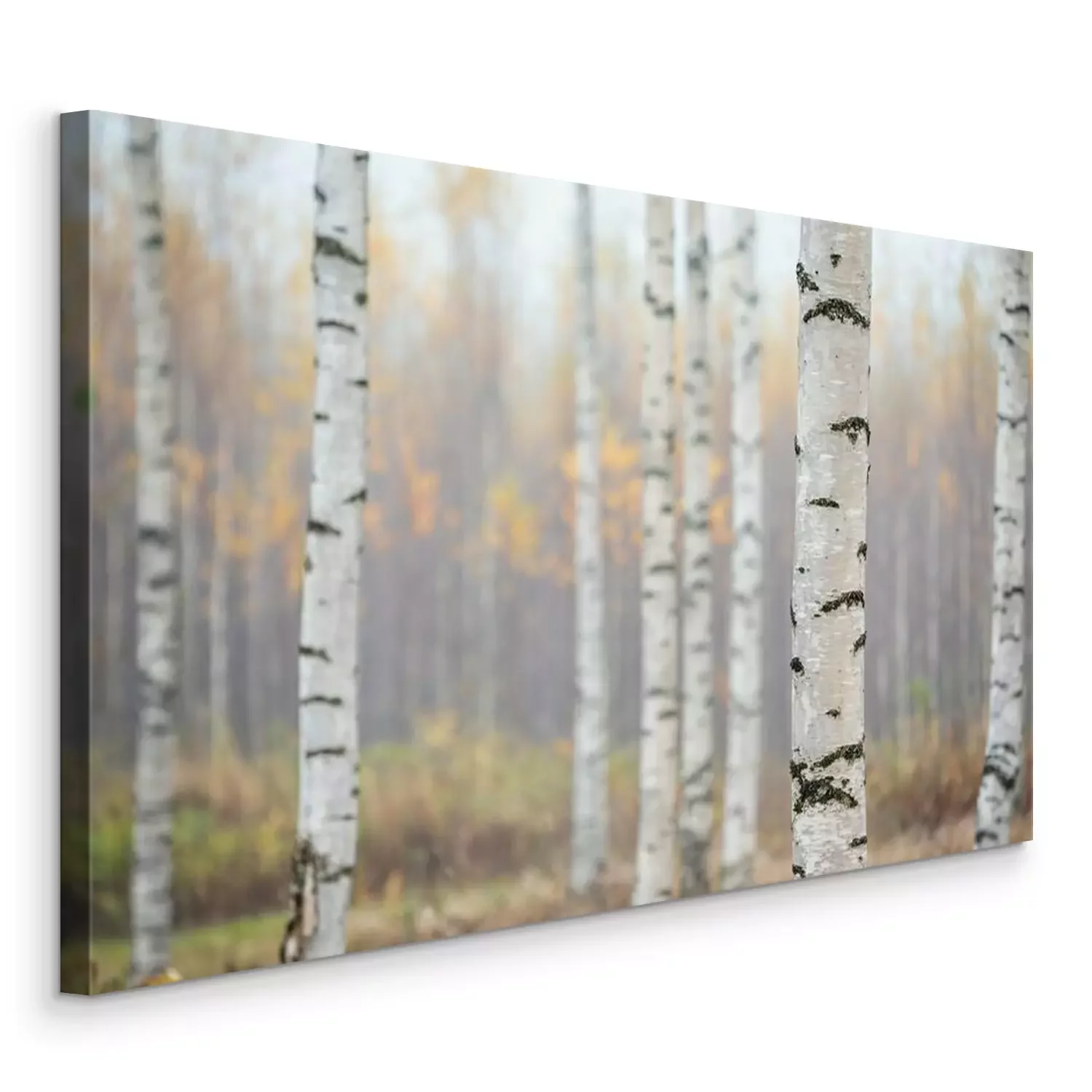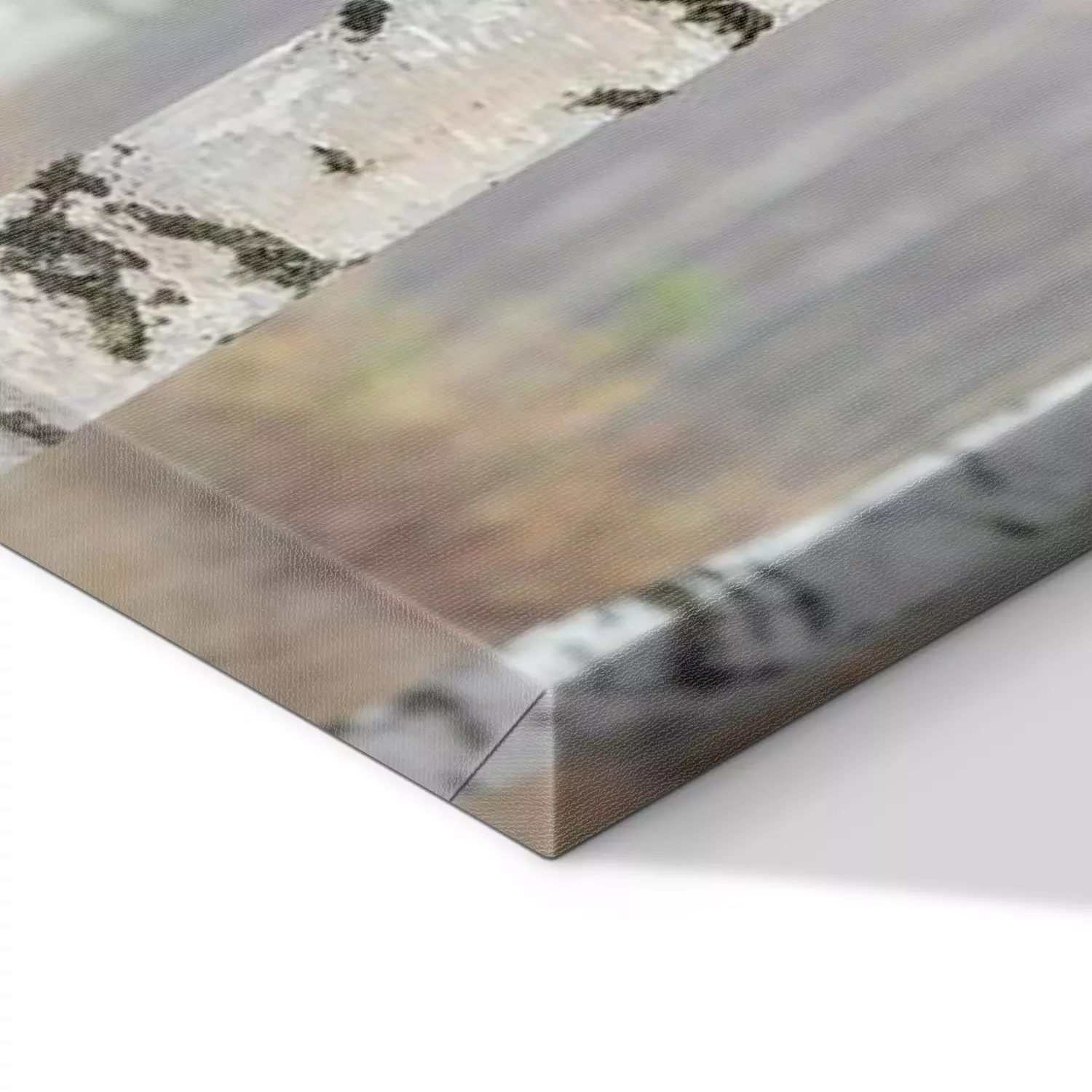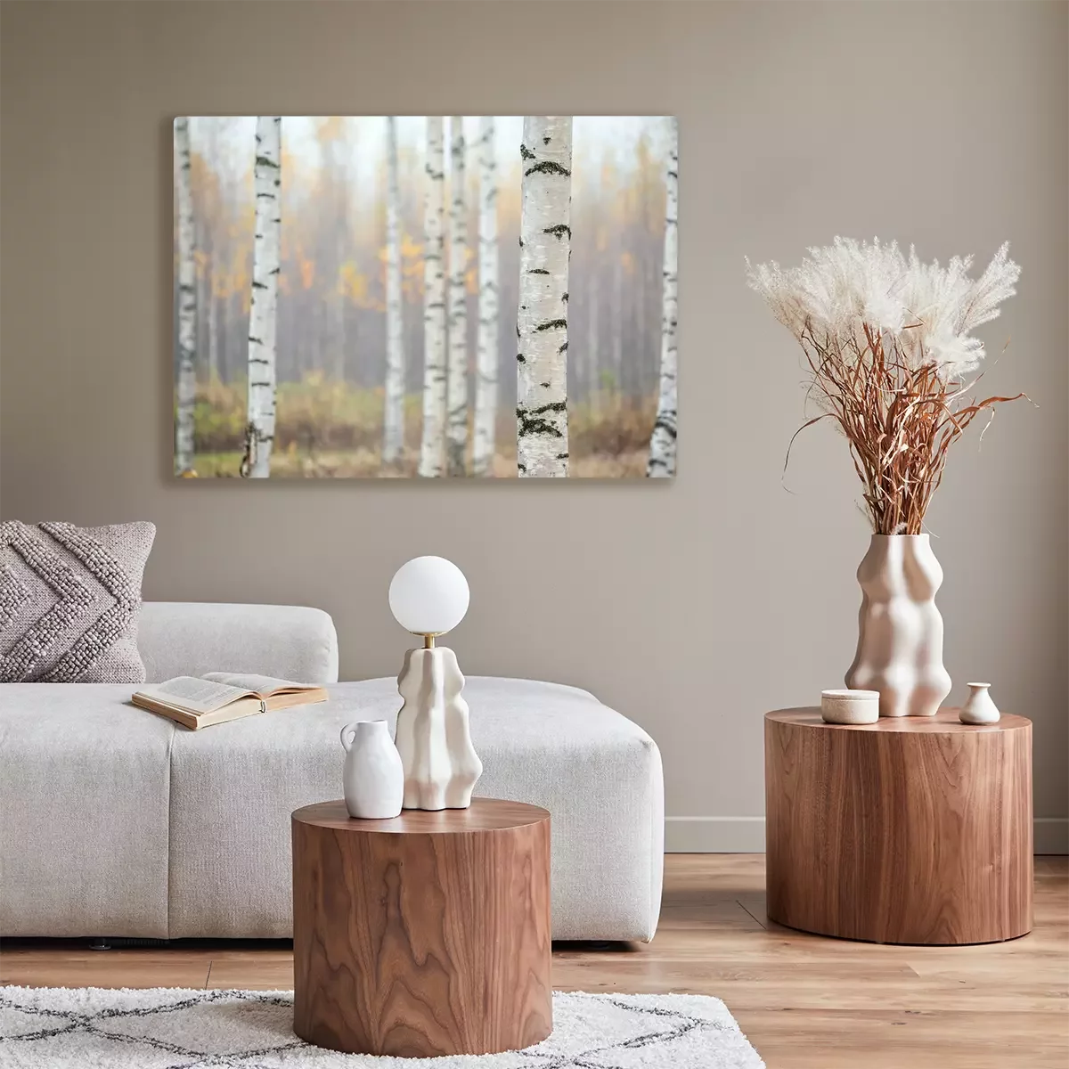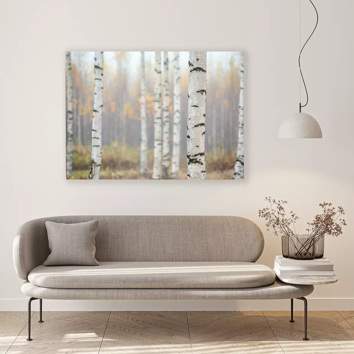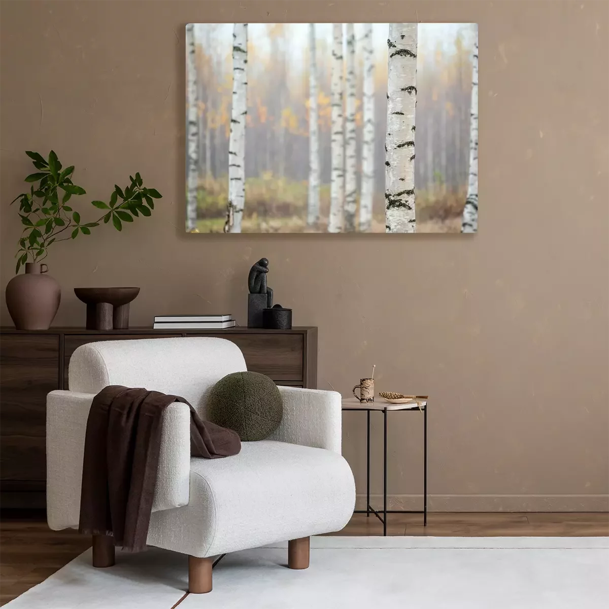 Canvas: Birch forest in fog. Autumn view. Focus in foreground tree trunk.